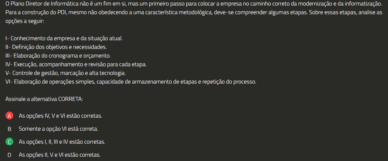 0 Plano Diretor de Informática não é um fim em si, mas um primeiro passo para colocar a empresa no caminho correto da modernização e da informatização. Para a construção do PDI, mesmo não obedecendo a uma característica metodológica, deve-se compreender algumas etapas. Sobre essas etapas, analise as opções a seguir: I- Conhecimento da empresa e da situação atual. II- Definição dos objetivos e necessidades. III- Elaboração do cronograma e orçamento. IV- Execução, acompanhamento e revisão para cada etapa. V- Controle de gestão, marcação e alta tecnologia. VI- Elaboração de operações simples, capacidade de armazenamento de etapas e repetição do processo. Assinale a alternativa CORRETA: A As opções IV, V e VI estão corretas. Somente a opção VI está correta. As opções I, II, III e IV estão corretas. D As opções II, V e VI estão corretas.