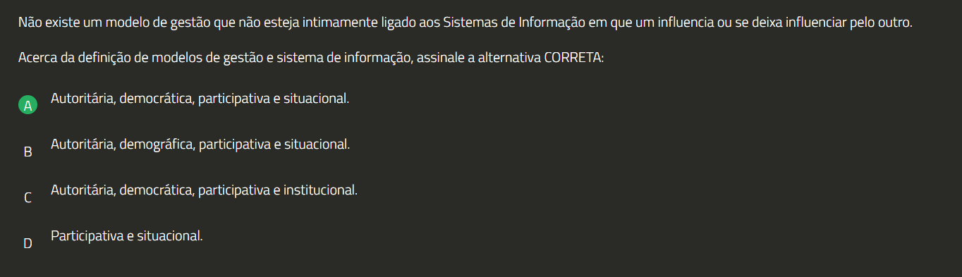 Não existe um modelo de gestão que não esteja intimamente ligado aos Sistemas de Informação em que um influencia ou se deixa influenciar pelo outro. Acerca da definição de modelos de gestão e sistema de informação, assinale a alternativa CORRETA: A Autoritária, democrática, participativa e situacional. Autoritária, demográfica, participativa e situacional. Autoritária, democrática, participativa e institucional. D Participativa e situacional.