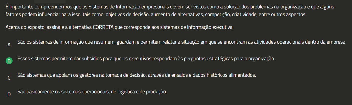 É importante compreendermos que OS Sistemas de Informação empresariais devem ser vistos como a solução dos problemas na organização e que alguns fatores podem influenciar para isso, tais como: objetivos de decisão, aumento de alternativas, competição, criatividade, entre outros aspectos. Acerca do exposto, assinale a alternativa CORRETA que corresponde aos sistemas de informação executiva: A São sistemas de informação que resumem, guardam e permitem relatar a situação em que se encontram as atividades operacionais dentro da empresa. Esses sistemas permitem dar subsídios para que executivos respondam às perguntas estratégicas para a organização. São sistemas que apoiam gestores na tomada de decisão, através de ensaios e dados históricos alimentados. D São basicamente sistemas operacionais, de logística e de produção.