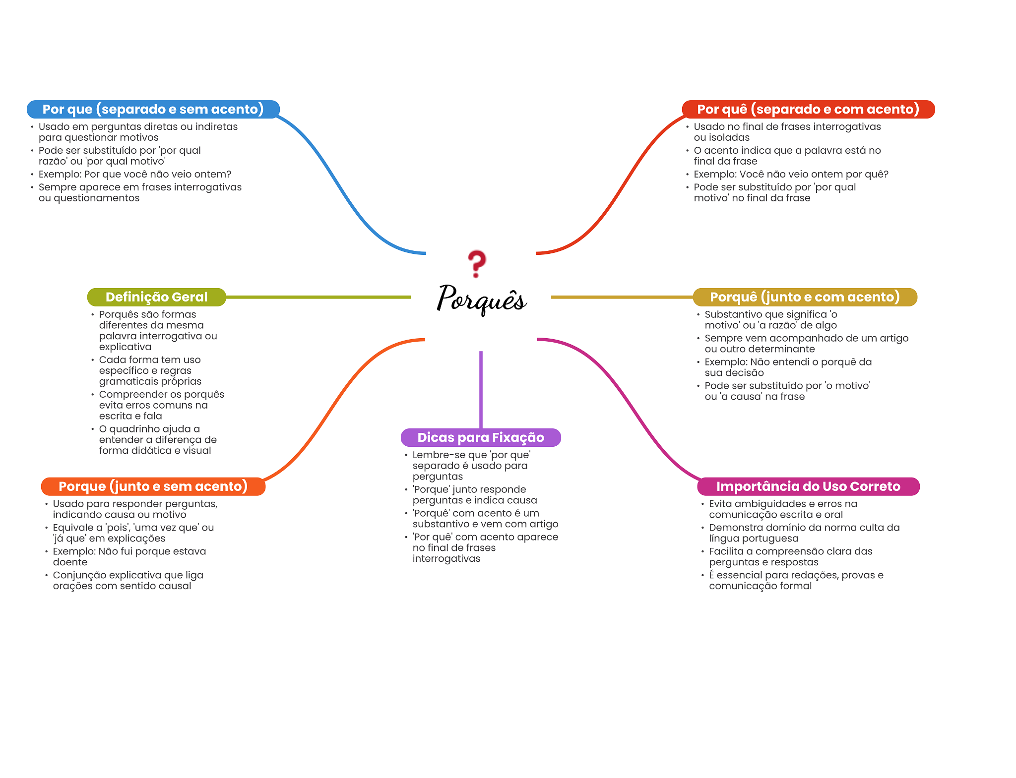 Por que (separado e sem acento) Por quê (separado e com acento) Usado em perguntas diretas ou indiretas Usado no final de frases interrogativas para questionar motivos ou isoladas Pode ser substituído por 'por qual acento indica que a palavra está no ou qual motivo' final da frase Exemplo: Por que você não veio ontem? Exemplo: Você não veio ontem por quê? Sempre aparece em frases interrogativas Pode ser substituído por 'por qual ou questionamentos motivo' no final da frase ? Definição Geral Porquês Porquê (junto e com acento) Porquês são formas Substantivo que significa 'o diferentes da mesma motivo' ou de algo palavra interrogativa ou Sempre vem acompanhado de um artigo explicativa ou outro determinante Cada forma tem uso Exemplo: Não entendi O porquê da específico e regras sua decisão gramaticais próprias Pode ser substituído por 'o motivo' Compreender OS porquês ou'a causa' na frase evita erros comuns na escrita e fala quadrinho ajuda a entender a diferença de Dicas para Fixação forma didática e visual Lembre-se que 'por que' separado é usado para perguntas Porque (junto e sem acento) 'Porque' junto responde Importância do Uso Correto Usado para responder perguntas, perguntas e indica causa Evita ambiguidades e erros na indicando causa ou motivo 'Porquê' com acento é um comunicação escrita e oral Equivale a 'pois', vez que' ou substantivo e vem com artigo Demonstra domínio da norma culta da já que' em explicações 'Por quê' com acento aparece língua portuguesa Exemplo: Não fui porque estava no final de frases Facilita a compreensão clara das doente interrogativas perguntas e respostas Conjunção explicativa que liga É essencial para redações, provas e orações com sentido causal comunicação formal