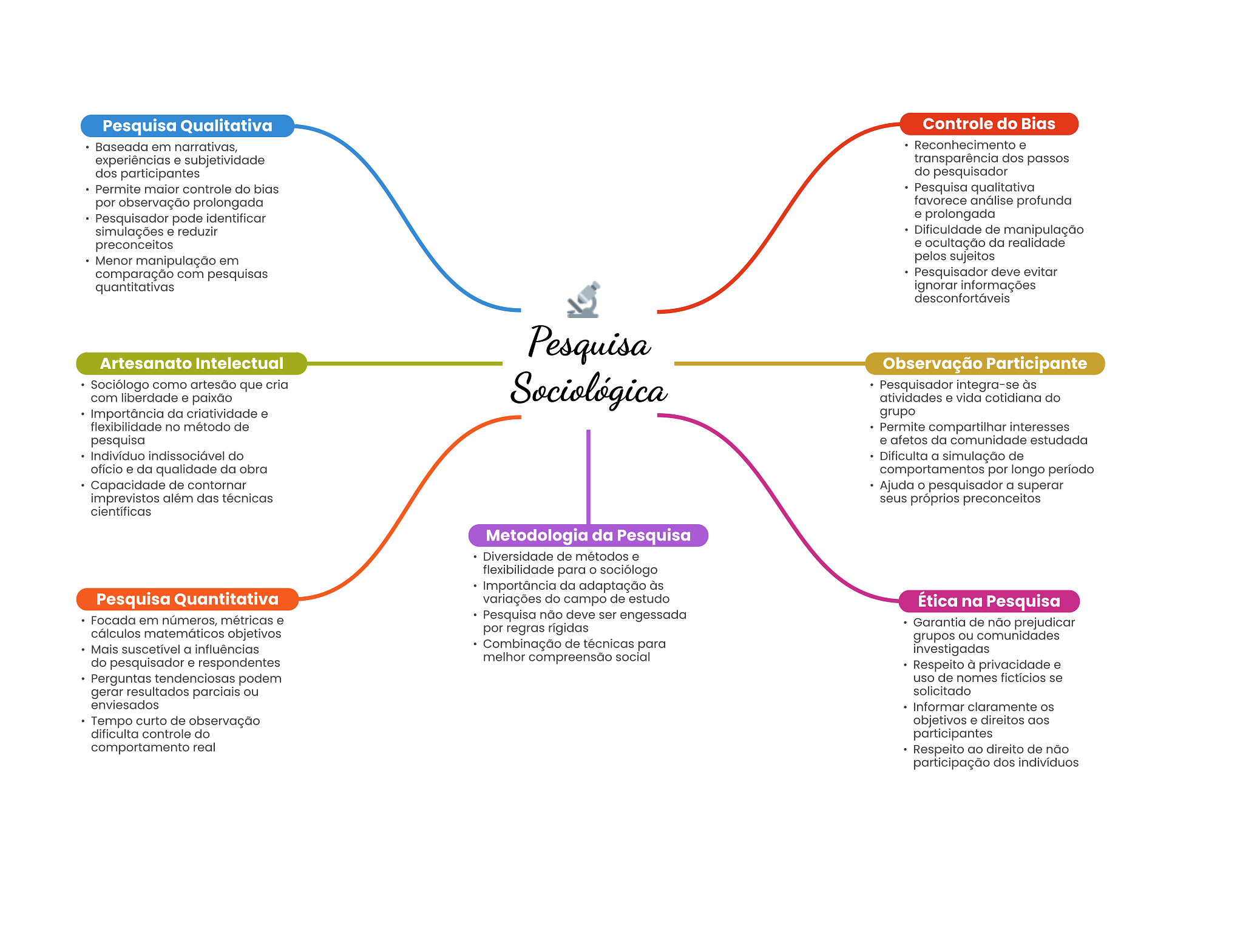 Pesquisa Qualitativa Controle do Bias Baseada em narrativas, Reconhecimento e experiências e subjetividade transparência dos passos dos participantes do pesquisador Permite maior controle do bias Pesquisa qualitativa por observação prolongada favorece análise profunda Pesquisador pode identificar e prolongada simulações e reduzir Dificuldade de manipulação preconceitos e ocultação da realidade Menor manipulação em sujeitos comparação com pesquisas Pesquisador deve evitar quantitativas ignorar informações desconfortáveis Pesquisa Artesanato Intelectual Observação Participante Sociólogo como artesão que cria Sociológica Pesquisador integra-se às com liberdade e paixão atividades e vida cotidiana do Importância da criatividade e grupo flexibilidade no método de Permite compartilhar interesses pesquisa e afetos da comunidade estudada Indivíduo indissociável do Dificulta a simulação de ofício e da qualidade da obra comportamentos por longo período Capacidade de contornar Ajuda pesquisador a superar imprevistos além das técnicas seus próprios preconceitos científicas Metodologia da Pesquisa Diversidade de métodos e flexibilidade para sociólogo Importância da adaptação às Pesquisa Quantitativa variações do campo de estudo Ética na Pesquisa Focada em números, métricas e Pesquisa não deve ser engessada cálculos matemáticos objetivos por regras rígidas Garantia de não prejudicar grupos ou comunidades Mais suscetível a influências Combinação de técnicas para investigadas do pesquisador e respondentes melhor compreensão social Respeito à privacidade e Perguntas tendenciosas podem uso de nomes fictícios se gerar resultados parciais ou solicitado enviesados Informar claramente Tempo curto de observação objetivos e direitos aos dificulta controle do participantes comportamento real Respeito ao direito de não participação dos indivíduos