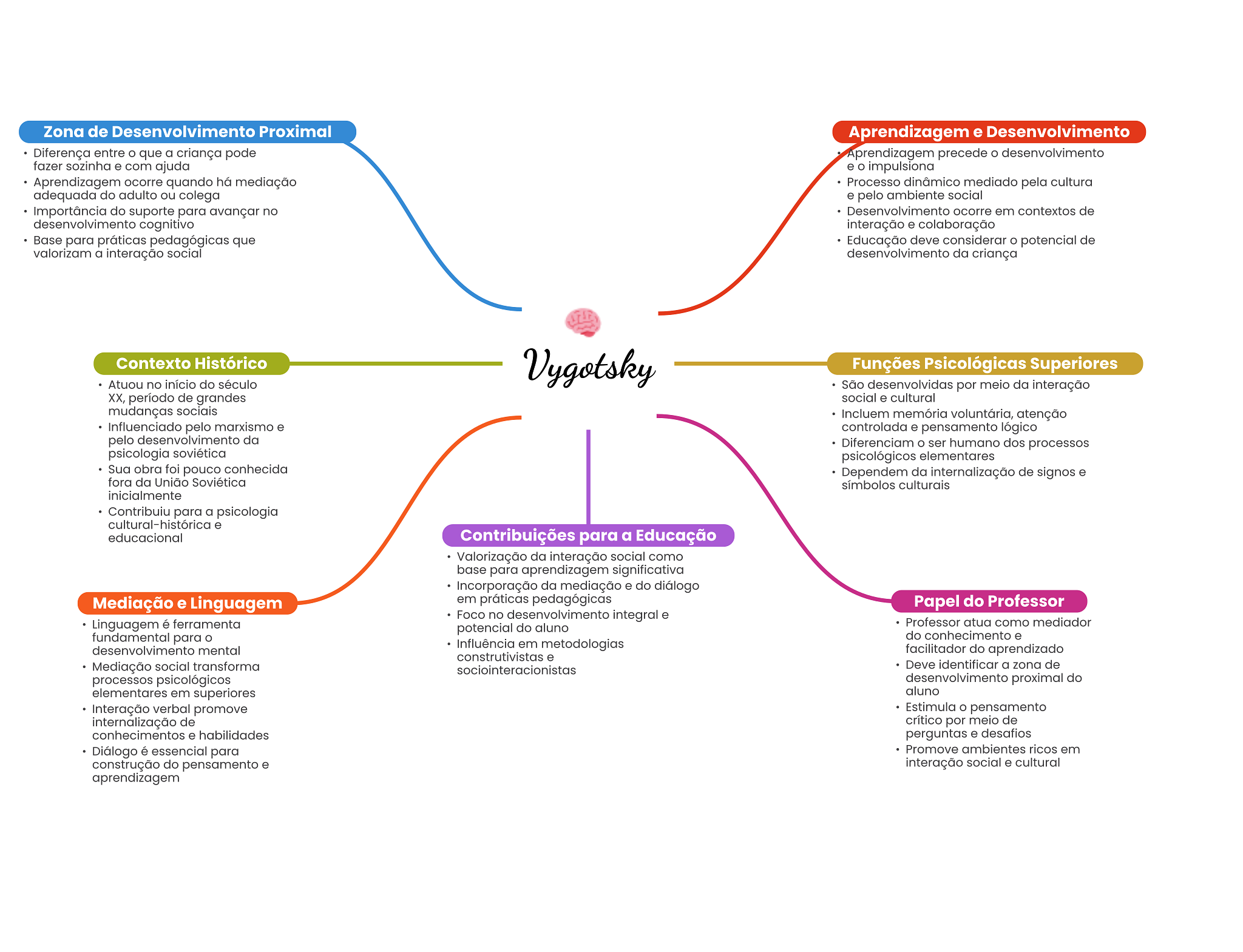 Zona de Desenvolvimento Proximal Aprendizagem e Desenvolvimento Diferença entre que a criança pode Aprendizagem precede desenvolvimento fazer sozinha e com ajuda e impulsiona Aprendizagem ocorre quando há mediação Processo dinâmico mediado pela cultura adequada do adulto ou colega e pelo ambiente social Importância do suporte para avançar no Desenvolvimento ocorre em contextos de desenvolvimento cognitivo interação e colaboração Base para práticas pedagógicas que Educação deve considerar potencial de valorizam a interação social desenvolvimento da criança Contexto Histórico Vygotsky Funções Psicológicas Superiores Atuou no início do século São desenvolvidas por meio da interação período de grandes social e cultural mudanças sociais Incluem memória voluntária, atenção Influenciado pelo marxismo e controlada e pensamento lógico pelo desenvolvimento da Diferenciam ser humano dos processos psicologia soviética psicológicos elementares Sua obra foi pouco conhecida Dependem da internalização de signos e fora da União Soviética símbolos culturais inicialmente Contribuiu para a psicologia cultural-histórica e educacional Contribuições para a Educação Valorização da interação social como base para aprendizagem significativa Incorporação da mediação e do diálogo Mediação e Linguagem em práticas pedagógicas Papel do Professor Foco no desenvolvimento integral e Linguagem é ferramenta Professor atua como mediador potencial do aluno fundamental para do conhecimento e desenvolvimento mental Influência em metodologias facilitador do aprendizado construtivistas e Mediação social transforma sociointeracionistas Deve identificar a zona de processos psicológicos desenvolvimento proximal do elementares em superiores aluno Interação verbal promove Estimula pensamento internalização de crítico por meio de conhecimentos e habilidades perguntas e desafios Diálogo é essencial para Promove ambientes ricos em construção do pensamento e interação social e cultural aprendizagem