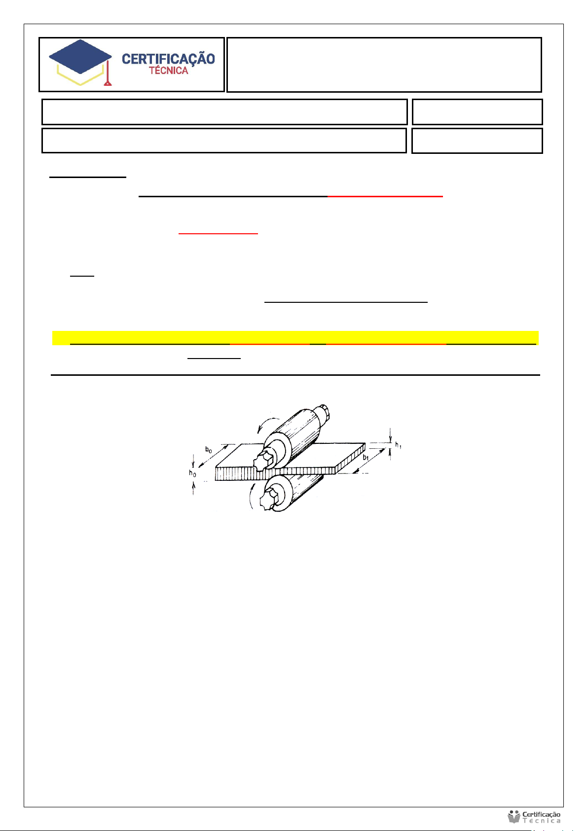 Processos de Fabricação Aluno (a): Data: / / Processos de Fabricação Avaliação Prática 1 INSTRUÇÕES: POR FAVOR, LEIA AS INSTRUÇÕES: ❖ Preencha os dados no Cabeçalho para sua identificação; ❖ Esta Avaliação contém 01 (uma) questão, totalizando 10 (dez) pontos; ❖ Leia com atenção os enunciados e faça o que se pede; ❖ As respostas devem ser digitadas abaixo de cada pergunta; ❖ NÃO serão aceitas respostas e textos retirados da íntegra Internet, assim como imagens (desde que seja pedida). A interpretação e execução fazem parte do processo. ❖ Ao terminar grave o arquivo com o nome A1F Disciplina – Nome do Aluno; ❖ Só serão aceitas as extensões .docx (M.S. Word) ou .PDF; ❖ Envie o arquivo pelo sistema no local indicado; ❖ Atividades enviadas “em branco”, plagiadas de sites ou repetidas de outros alunos, terão notas ZERO. ❖ Verifiquem no campo de comentário o feedback dado pelo tutor. ❖ Em caso de dúvidas consulte o seu Tutor. 1) Na imagem abaixo temos um processo de conformação mecânica. a) Identifique o nome do processo e cite duas aplicações. Laminação - Construção e infraestrutura: Peças metálicas laminadas, como vigas, vergalhões, chapas e tubos, são fundamentais na construção civil, per- mitindo a fabricação de estruturas seguras e duráveis para edifícios e pontes. Indústria e automotiva: A laminação de metais produz componentes para a fabricação de automóveis, máquinas, equipamentos e di- versos outros itens do setor industrial. A possibilidade de modificar as propriedades do metal através deste processo cria produtos com diferentes aplicações e maior resistência. b) Insira imagens de duas variações desse tipo de processo e identifique-as Máquinas Térmicas Processo de trefilação Procwesso a laser