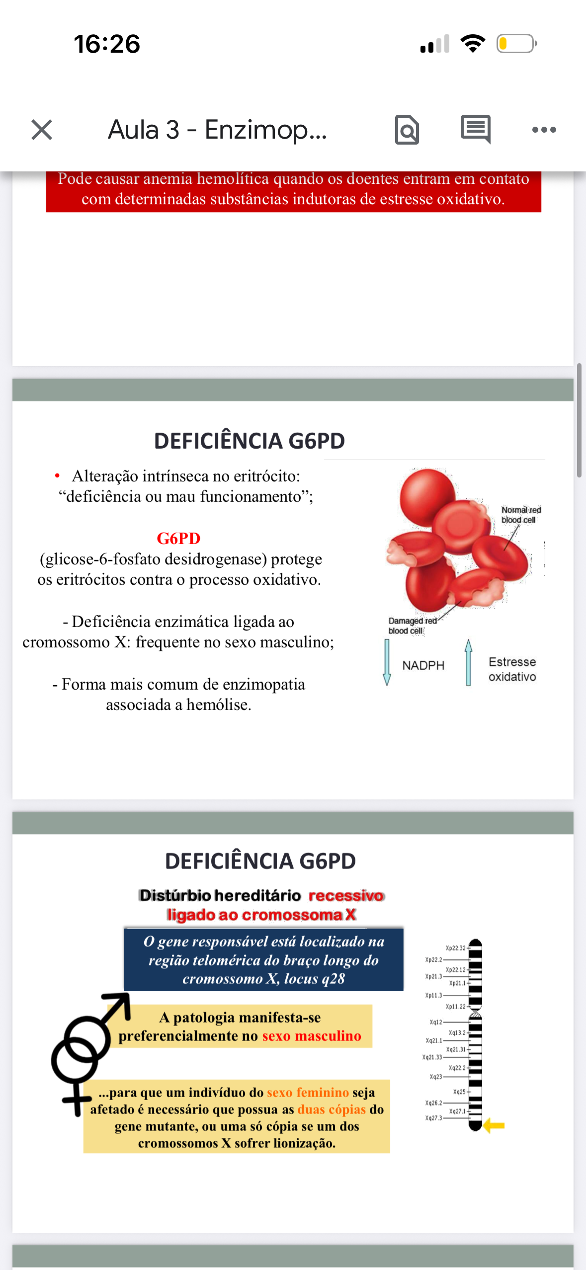 16:26 X Aula 3 - Enzimop... Pode causar anemia hemolítica quando os doentes entram em contato com determinadas substâncias indutoras de estresse oxidativo. DEFICIÊNCIA G6PD Alteração intrínseca no eritrócito: "deficiência ou mau Normal red blood cell G6PD (glicose-6-fosfato desidrogenase) protege os eritrócitos contra o processo oxidativo. Deficiência enzimática ligada ao Damaged red blood cromossomo X: frequente no sexo masculino; NADPH Estresse oxidativo Forma mais comum de enzimopatia associada a hemólise. DEFICIÊNCIA G6PD Distúrbio hereditário recessivo ligado ao cromossoma gene responsável está localizado Xp22.32 região telomérica do braço longo do Xp22.2 Xp22.12 cromossomo locus q28 Xp21.3 Xp21.1 Xp11.3 Xp11.22 A patologia manifesta-se Xq12 preferencialmente no sexo masculino Xq13.2 Xq21.1 Xq21.31 Xq21.33 Xq22.2 Xq23 ...para que um indivíduo do sexo feminino seja Xq25 Xq26.2 afetado é necessário que possua as duas cópias do Xq27.1 Xq27.3 gene mutante, ou uma só cópia se um dos cromossomos sofrer lionização.