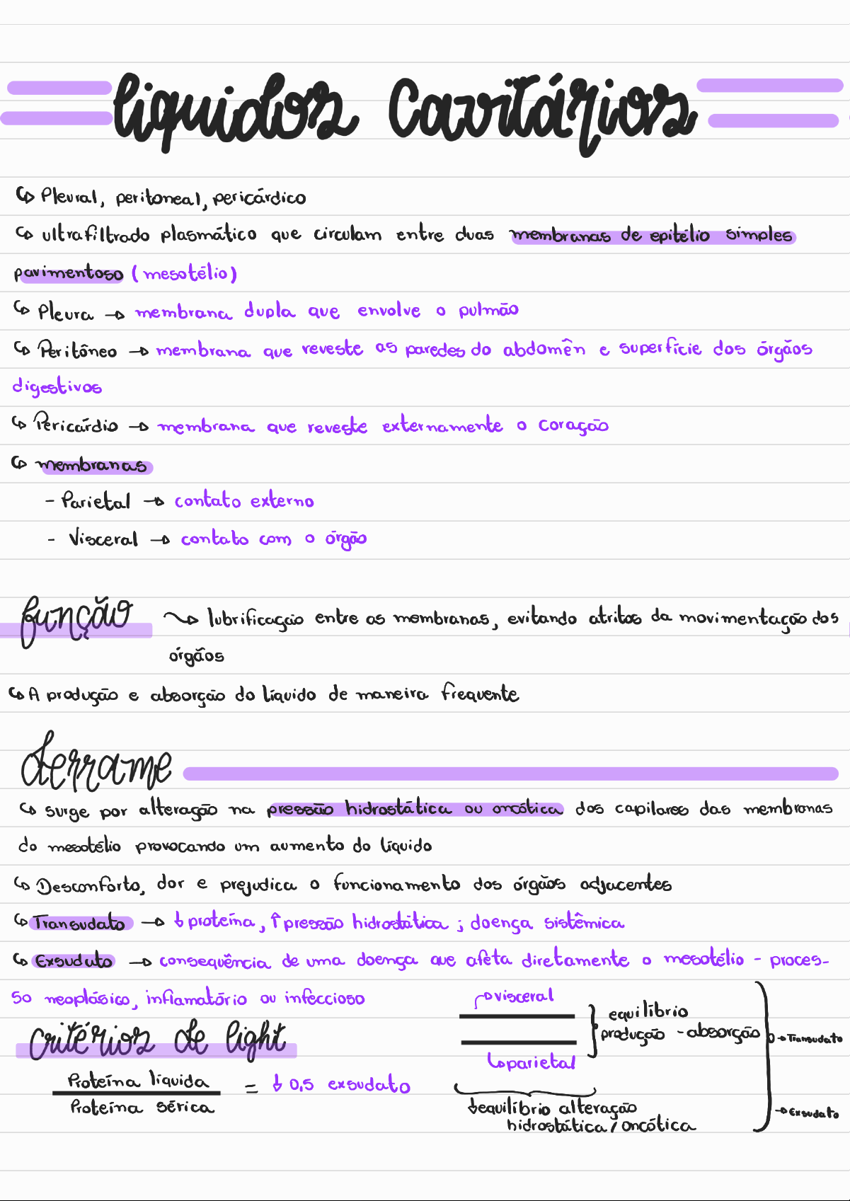 peritoneal, pericárdico ultrafiltrado plasmático que circulam entre duas membranas de epitelio simples pavimentoso I Pleura membrana dupla ave envolve pulmão s Peritôneo membrana que reveste as paredes do e superficie dos digestivos membrana reveste externamente membranas - Parietal contato externo - Visceral contato com órgão função lubrificagcio entre as membranas, evitando atritos da movimentação dos orgãos A e absorção do de maneira frequente derrame por alteragão na pressão hidrostática oncótica dos capilares das do mesotelio provocando um aumento do líquido Desconforto, dor e prejudica dos órgãos adjacentes Transudato b pressão doença sistêmica Exsuduto consequência de uma doença ave afeta diretamente mesotelio - proces- 50 infeccioso equilibrio de light Proteína liquida = exsudato sérica alteração Exsudato oncóticaDHL líquido exsudato = DHL Sérica transudato Tabela 1 Critérios de Light e Colaboradores TRANSUDATO EXSUDATO Relação DHL pleural/sérico >0,5 dosagem de = 43g/dl exsudato Relação Proteínas pleural/sérico 0,5 >0,5 proteína transudato Gradiente de albumina menos frequente ave critérios de light - valor da albumina do pelo valor da albumina do pleural - = é exsudato Tabela 5.1.3. Etiologia dos exsudatos Tabela 5.1.2. Etiologia dos transudatos Doenças infecciosas (bactérias aeróbias, micobactérias, Insuficiência cardíaca congestiva vírus, fungos) como pneumonias, abscessos, pleurite, Cirrose peritonite, etc. Síndrome nefrótica Neoplasias (metástases e mesoteliomas) Diálise peritoneal Doenças gastrointestinais (pancreatite com abscesso Embolia pulmonar subfrênico, perfuração do esôfago ou intestino, ruptura visceral traumática e outras) Obstrução da veia cava superior Doenças colágeno-vasculares (infartos, alergias, pleurite Glomerulonefrite reumatoide, lúpus eritematoso sistêmico, síndrome de Sarcoidose Sjögren, granulomatose de Wegener) Mixedema Diversos (asbestose, síndrome de Meigs, uremia, síndrome Condições hipoalbuminêmicas de Dressler)