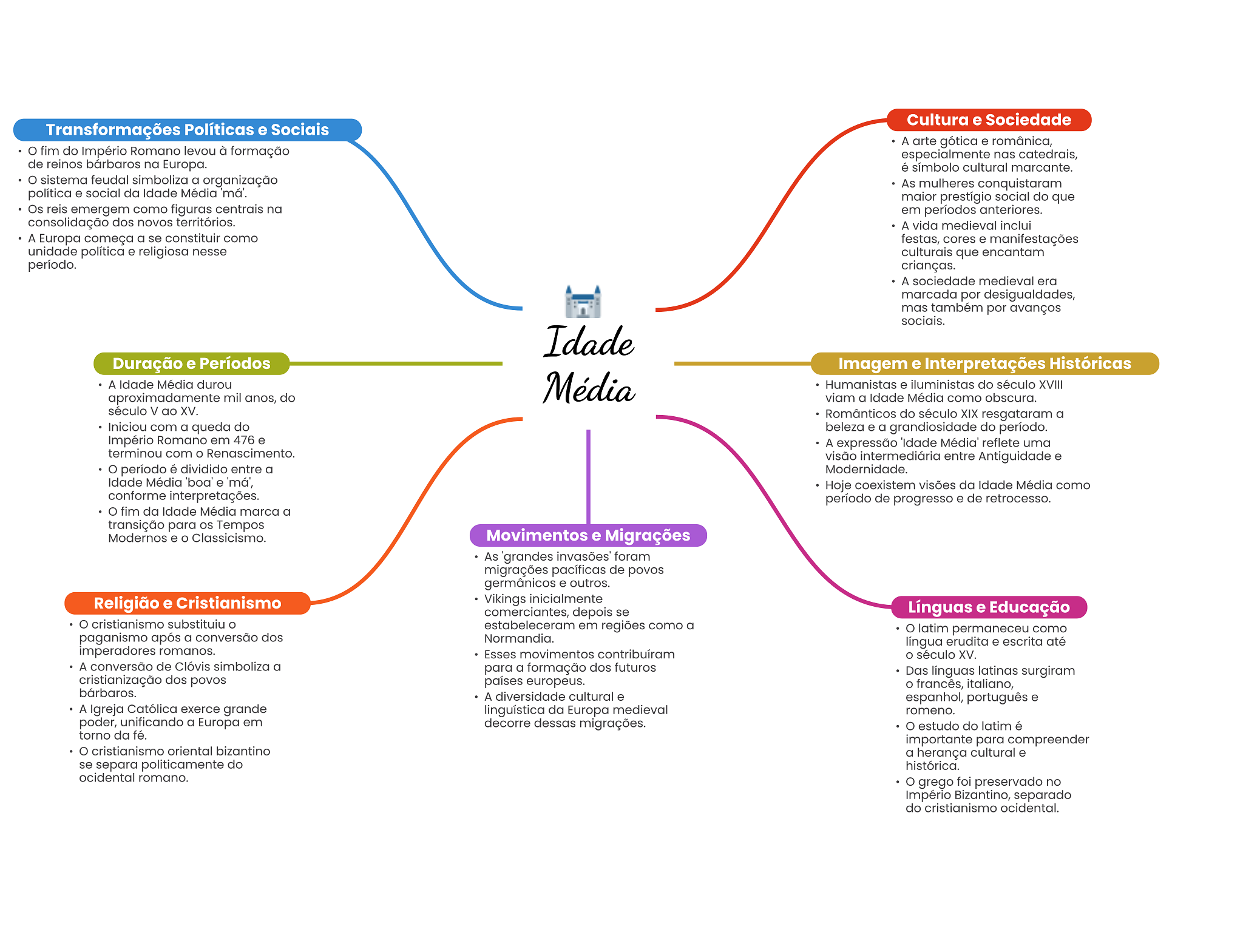 Cultura e Sociedade Transformações Políticas e Sociais A arte gótica e românica, fim do Império Romano levou à formação especialmente nas catedrais, de reinos bárbaros na Europa. é símbolo cultural marcante. sistema feudal simboliza a organização As mulheres conquistaram política e social da Idade Média maior prestígio social do que Os reis emergem como figuras centrais na em períodos anteriores. consolidação dos novos territórios. A vida medieval inclui A Europa começa a se constituir como festas, cores e manifestações unidade política e religiosa nesse culturais que encantam período. crianças. A sociedade medieval era marcada por desigualdades, mas também por avanços sociais. Idade Duração e Períodos Imagem e Interpretações Históricas A Idade Média durou aproximadamente mil anos, do Média Humanistas e iluministas do século XVIII viam a Idade Média como obscura. século V ao XV. Românticos do século XIX resgataram a Iniciou com a queda do beleza e a grandiosidade do período. Império Romano em 476 e A expressão 'Idade reflete uma terminou com Renascimento. visão intermediária entre Antiguidade e período é dividido entre a Modernidade. Idade Média 'boa' e Hoje coexistem visões da Idade Média como conforme interpretações. período de progresso e de retrocesso. fim da Idade Média marca a transição para OS Tempos Modernos e Classicismo. Movimentos e Migrações As 'grandes invasões' foram migrações pacíficas de povos germânicos e outros. Religião e Cristianismo Vikings inicialmente comerciantes, depois se Línguas e Educação cristianismo substituiu estabeleceram em regiões como a latim permaneceu como paganismo após a conversão dos Normandia. língua erudita e escrita até imperadores romanos. Esses movimentos contribuíram O século XV. A conversão de Clóvis simboliza a para a formação dos futuros Das línguas latinas surgiram cristianização dos povos países europeus. francês, italiano, bárbaros. A diversidade cultural e espanhol, português e A Igreja Católica exerce grande linguística da Europa medieval romeno. poder, unificando a Europa em decorre dessas migrações. estudo do latim é torno da fé. importante para compreender cristianismo oriental bizantino a herança cultural e se separa politicamente do histórica. ocidental romano. grego foi preservado no Império Bizantino, separado do cristianismo ocidental.