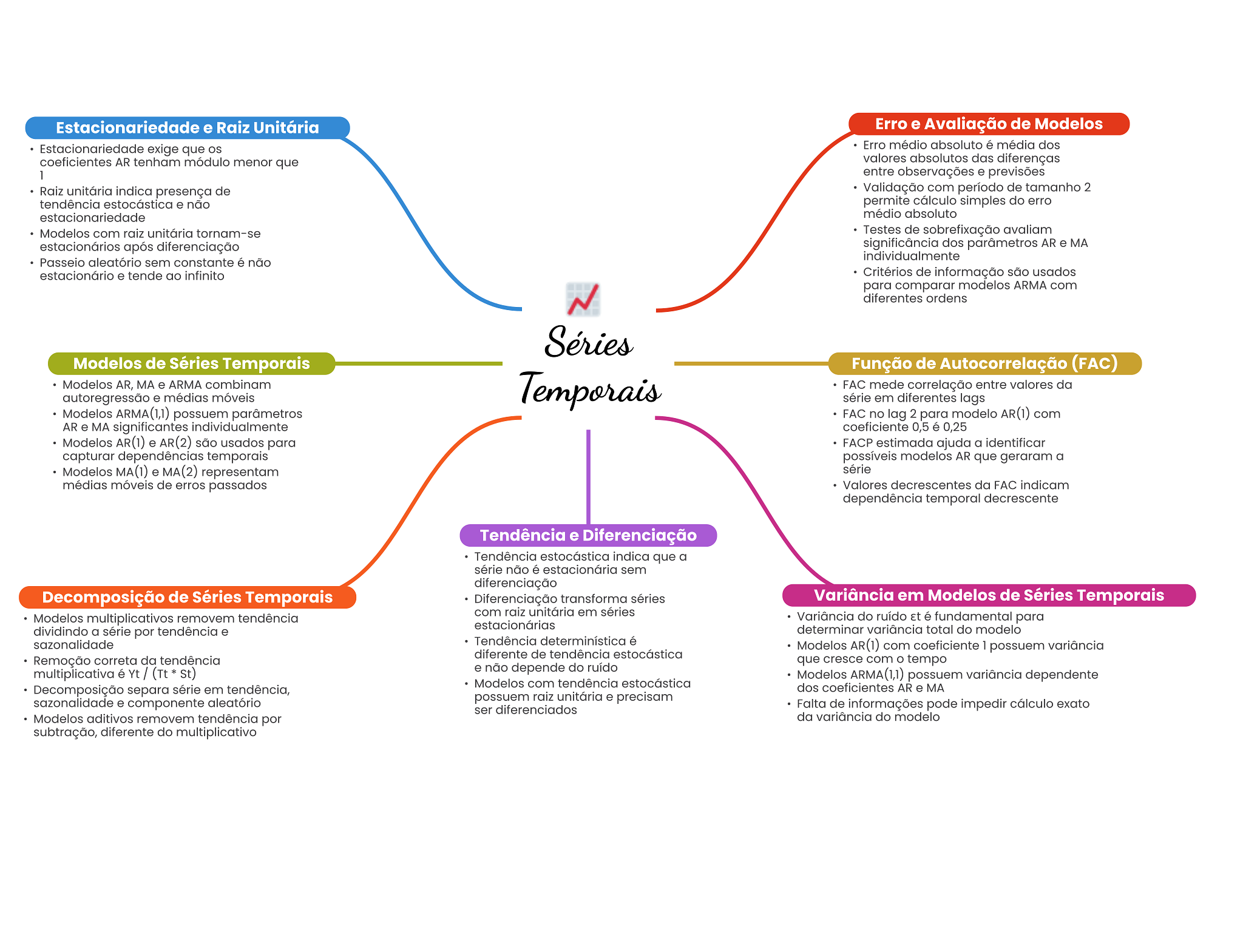 Estacionariedade e Raiz Unitária Erro e Avaliação de Modelos Estacionariedade exige que Erro médio absoluto é média dos coeficientes AR tenham módulo menor que valores absolutos das diferenças 1 entre observações e previsões Raiz unitária indica presença de Validação com período de tamanho 2 tendência estocástica e não permite cálculo simples do erro estacionariedade médio absoluto Modelos com raiz unitária tornam-se Testes de sobrefixação avaliam estacionários após diferenciação significância dos parâmetros AR e MA individualmente Passeio aleatório sem constante é não estacionário e tende ao infinito Critérios de informação são usados para comparar modelos ARMA com diferentes ordens Séries Modelos de Séries Temporais Função de Autocorrelação (FAC) Modelos AR, MA e ARMA combinam Temporais FAC mede correlação entre valores da autoregressão e médias móveis série em diferentes lags Modelos ARMA(1,1) possuem parâmetros FAC no lag 2 para modelo AR(1) com AR e MA significantes individualmente coeficiente 0,5 é 0,25 Modelos AR(1) e AR(2) são usados para FACP estimada ajuda a identificar capturar dependências temporais possíveis modelos AR que geraram a Modelos MA(1) e MA(2) representam série médias móveis de erros passados Valores decrescentes da FAC indicam dependência temporal decrescente Tendência e Diferenciação Tendência estocástica indica que a série não é estacionária sem diferenciação Decomposição de Séries Temporais Diferenciação transforma séries Variância em Modelos de Séries Temporais com raiz unitária em séries Modelos multiplicativos removem tendência Variância do ruído Et é fundamental para estacionárias dividindo a série por tendência e determinar variância total do modelo sazonalidade Tendência determinística é Modelos AR(1) com coeficiente 1 possuem variância diferente de tendência estocástica Remoção correta da tendência que cresce com O tempo multiplicativa é Yt / (Tt St) e não depende do ruído Modelos ARMA(1,1) possuem variância dependente Modelos com tendência estocástica Decomposição separa série em tendência, dos coeficientes AR e MA sazonalidade e componente aleatório possuem raiz unitária e precisam ser diferenciados Falta de informações pode impedir cálculo exato Modelos aditivos removem tendência por da variância do modelo subtração, diferente do multiplicativo