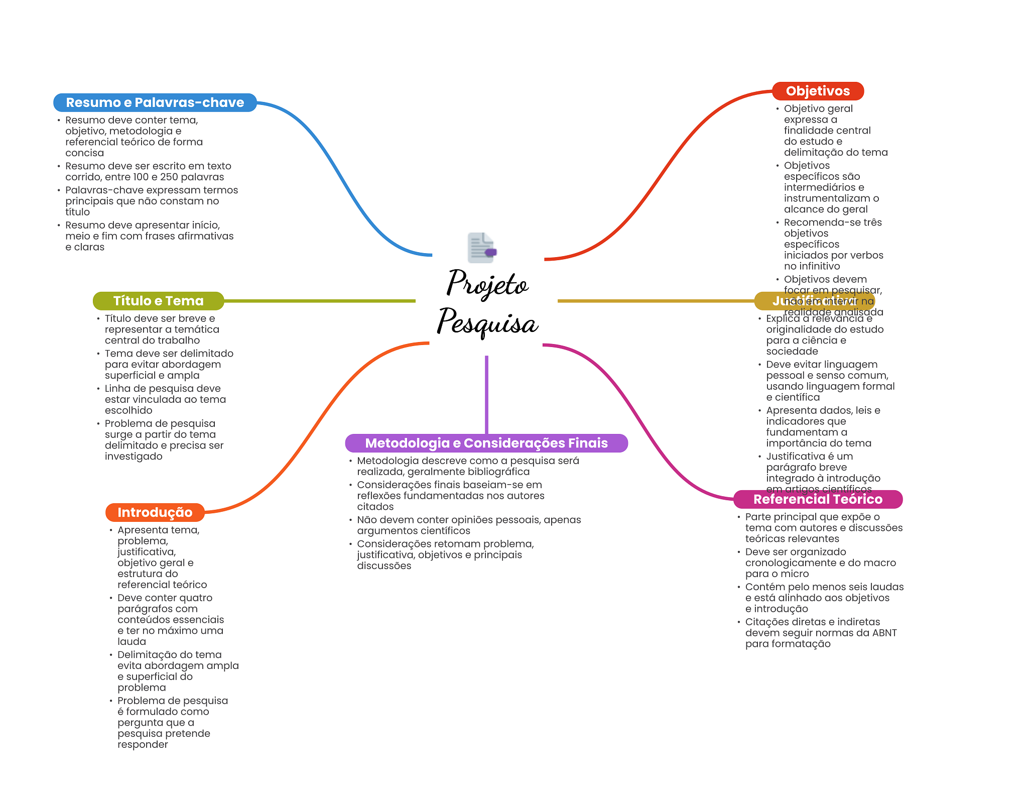 Objetivos Resumo e Palavras-chave Objetivo geral Resumo deve conter tema, expressa a objetivo, metodologia e finalidade central referencial teórico de forma do estudo e concisa delimitação do tema Resumo deve ser escrito em texto Objetivos corrido, entre 100 e 250 palavras específicos são Palavras-chave expressam termos intermediários e principais que não constam no instrumentalizam título alcance do geral Resumo deve apresentar início, Recomenda-se três meio e fim com frases afirmativas objetivos e claras específicos iniciados por verbos no infinitivo Projeto Objetivos devem focar em pesquisar, Título e Tema intervir na Título deve ser breve e Pesquisa realidade analisada Explica a relevancia e representar a temática originalidade do estudo central do trabalho para a ciência e Tema deve ser delimitado sociedade para evitar abordagem Deve evitar linguagem superficial e ampla pessoal e senso comum, Linha de pesquisa deve usando linguagem formal estar vinculada ao tema e científica escolhido Apresenta dados, leis e Problema de pesquisa indicadores que surge a partir do tema fundamentam a delimitado e precisa ser Metodologia e Considerações Finais importância do tema investigado Justificativa é um Metodologia descreve como a pesquisa será realizada, geralmente bibliográfica parágrafo breve integrado à introdução Considerações finais baseiam-se em em artigos científicos reflexões fundamentadas nos autores Referencial Teórico citados Introdução Não devem conter opiniões pessoais, apenas Parte principal que expõe Apresenta tema, argumentos científicos tema com autores e discussões problema, teóricas relevantes Considerações retomam problema, justificativa, justificativa, objetivos e principais Deve ser organizado objetivo geral e discussões cronologicamente e do macro estrutura do para micro referencial teórico Contém pelo menos seis laudas Deve conter quatro e está alinhado aos objetivos parágrafos com e introdução conteúdos essenciais Citações diretas e indiretas e ter no máximo uma devem seguir normas da ABNT lauda para formatação Delimitação do tema evita abordagem ampla e superficial do problema Problema de pesquisa é formulado como pergunta que a pesquisa pretende responder
