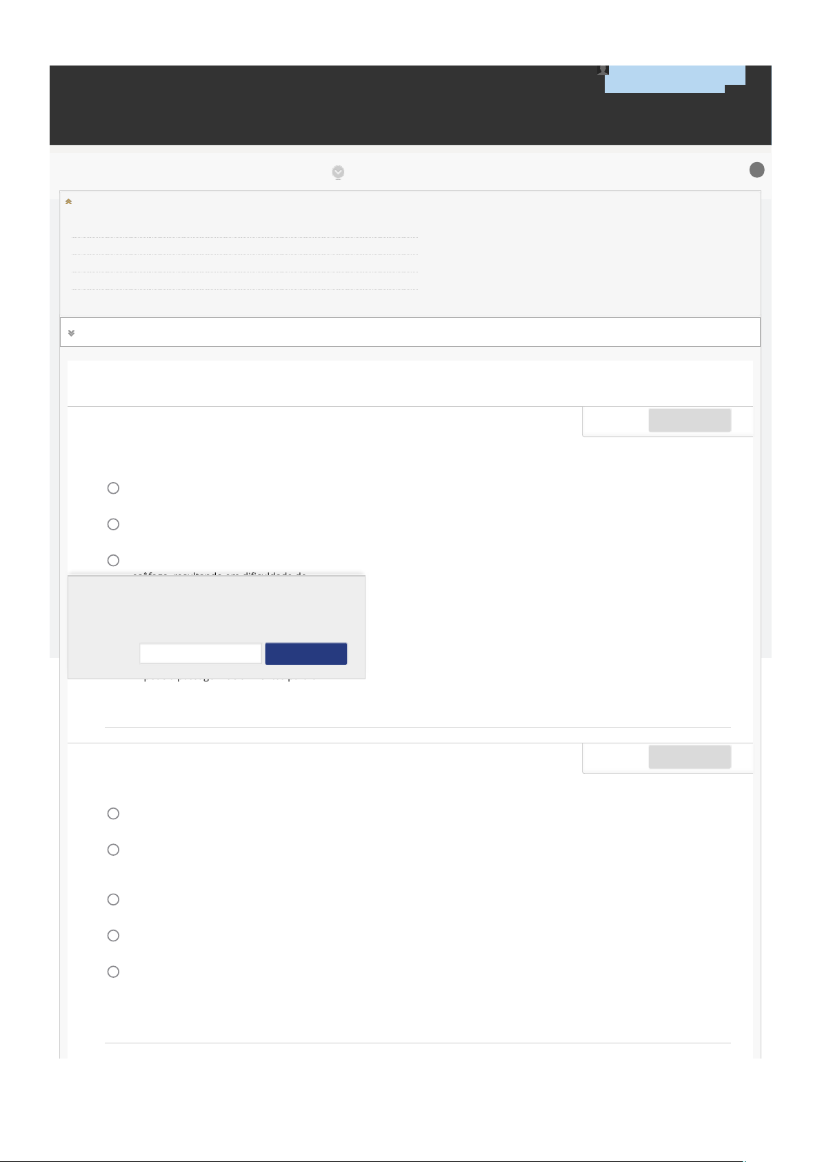 CONTEÚDOS ACADÊMICOS BIBLIOTECAS MURAL DO ALUNO TUTORIAIS THALLIA JESUS UNIP EAD Fazer teste: QUESTIONÁRIO UNIDADE IIPATOLOGIA DOS SISTEMAS 7485-60_44701_R_F1_20252 CONTEÚDO Informações do teste Descrição Instruções Várias tentativas Este teste permite 3 tentativas. Esta é a tentativa número 1. Forçar conclusão Este teste pode ser salvo e retomado posteriormente. Suas respostas foram salvas automaticamente. Respondus a. b. c. d. e. PERGUNTA 1 Um recém-nascido foi levado ao hospital com di!culdade para se alimentar, apresentando engasgos e regurgitação logo após a alimentação. Após exames, foi diagnosticada atresia esofágica. Qual é a característica principal dessa condição? A ausência de desenvolvimento do estômago, impedindo o armazenamento de alimentos. A formação de uma conexão anormal entre o esôfago e a traqueia, sem interrupção esofágica. A interrupção ou ausência de continuidade do esôfago, resultando em di!culdade de alimentação. O esôfago apresenta uma dilatação signi!cativa, com di!culdade para passar alimentos, mas sem interrupção. A presença de uma membrana no estômago que impede a passagem de alimentos para o intestino. 0,3 pontos Salvar resposta a. b. c. d. e. PERGUNTA 2 Um paciente de 35 anos queixa-se de azia frequente e regurgitação ácida, especialmente após refeições. O médico diagnosticou re"uxo gastroesofágico. Qual o mecanismo envolvido no re"uxo gastroesofágico? A produção excessiva de ácido clorídrico pelo estômago, causando úlceras gástricas. O relaxamento inadequado do esfíncter esofágico inferior, permitindo o retorno do conteúdo gástrico para o esôfago. A estenose do esôfago, que impede a passagem de alimentos e resulta em regurgitação. A hipertro!a do músculo esofágico, que impede o esvaziamento gástrico adequado. A presença de um tumor no esôfago que bloqueia o "uxo de alimentos e líquidos. 0,3 pontos Salvar resposta ? Estado de Conclusão da Pergunta: Clique em Salvar e Enviar para salvar e enviar. Clique em Salvar todas as respostas para salvar todas as respostas. Salvar todas as respostas Salvar e Enviar Terminar Sessão 04/09/2025, 21:23 Página 1 de 4 a. b. c. d. e. PERGUNTA 3 Uma mulher de 32 anos apresenta diarreia crônica e perda de peso. Após exames, foi diagnosticada com doença celíaca. O que caracteriza a doença celíaca? Intolerância à lactose, causando diarreia e desconforto abdominal. Doença autoimune que causa in"amação do intestino delgado em resposta ao glúten, levando à má absorção. De!ciência enzimática que impede a digestão de proteínas, causando acúmulo de toxinas no intestino. Reação alérgica a alimentos processados, causando in"amação do cólon. Presença de úlceras no intestino grosso devido a infecções bacterianas crônicas. 0,3 pontos Salvar resposta a. b. c. d. e. PERGUNTA 4 Um homem de 45 anos com histórico de consumo excessivo de álcool apresenta dor abdominal intensa e foi diagnosticado com pancreatite aguda. Qual é a principal causa da pancreatite aguda? Formação de pedras nos rins, que bloqueiam o ducto pancreático. In"amação autoimune do fígado, que se estende ao pâncreas. Ativação precoce das enzimas digestivas no pâncreas, causando autodestruição do tecido pancreático. Bloqueio do esôfago, resultando em re"uxo de bile para o pâncreas. Hipersecreção de insulina, levando à in"amação do pâncreas. 0,3 pontos Salvar resposta a. b. c. d. e. PERGUNTA 5 Um paciente de 40 anos apresenta dores no estômago e foi diagnosticado com gastrite causada pela infecção por Helicobacter pylori. Como a infecção por Helicobacter pylori contribui para a gastrite? A bactéria H. pylori estimula a produção excessiva de muco gástrico, causando in"amação. A bactéria H. pylori causa erosão direta das células gástricas, levando à ulceração. H. pylori produz urease, que neutraliza o ácido gástrico e permite que a bactéria colonize o estômago, levando à in"amação crônica. H. pylori induz a secreção de bile para o estômago, dani!cando a mucosa gástrica. H. pylori destrói diretamente as glândulas parietais, impedindo a produção de ácido. 0,3 pontos Salvar resposta a. PERGUNTA 6 Um homem de 30 anos, que nunca havia sido vacinado contra hepatite B, foi diagnosticado com a infecção após exames de sangue de rotina. Como ocorre a transmissão da hepatite B? 0,3 pontos Salvar resposta 04/09/2025, 21:23 Página 2 de 4 b. c. d. e. Ingestão de alimentos contaminados com o vírus. Transmissão pelo ar, por meio de gotículas respiratórias. Contato com sangue ou "uidos corporais contaminados, incluindo relações sexuais. Picadas de insetos infectados com o vírus. Contato casual, como compartilhar objetos de uso diário. a. b. c. d. e. PERGUNTA 7 Um homem de 50 anos com histórico de alcoolismo crônico é diagnosticado com hepatite alcoólica após apresentar icterícia e dor abdominal. Qual é o principal mecanismo da hepatite alcoólica? Lesão hepática causada por acúmulo de ferro no fígado. Deposição de cristais de colesterol no fígado, causando in"amação. Dano hepatocelular induzido pelo metabolismo do álcool e a produção de acetaldeído, que leva à in"amação. Acúmulo de glicogênio no fígado, levando à in"amação e à necrose. Insu!ciência do fígado em metabolizar proteínas, resultando em danos autoimunes. 0,3 pontos Salvar resposta a. b. c. d. e. PERGUNTA 8 Um paciente com história de consumo excessivo de álcool foi diagnosticado com esteatose hepática alcoólica. O que caracteriza essa condição? Acúmulo de gordura no fígado devido ao metabolismo inadequado de álcool. Substituição do tecido hepático por tecido !broso devido ao consumo de álcool. Aumento das células hepáticas, levando a um fígado hiperativo. Aumento da secreção biliar, resultando em in"amação crônica do fígado. Acúmulo de glicose no fígado, resultando em !brose hepática. 0,3 pontos S