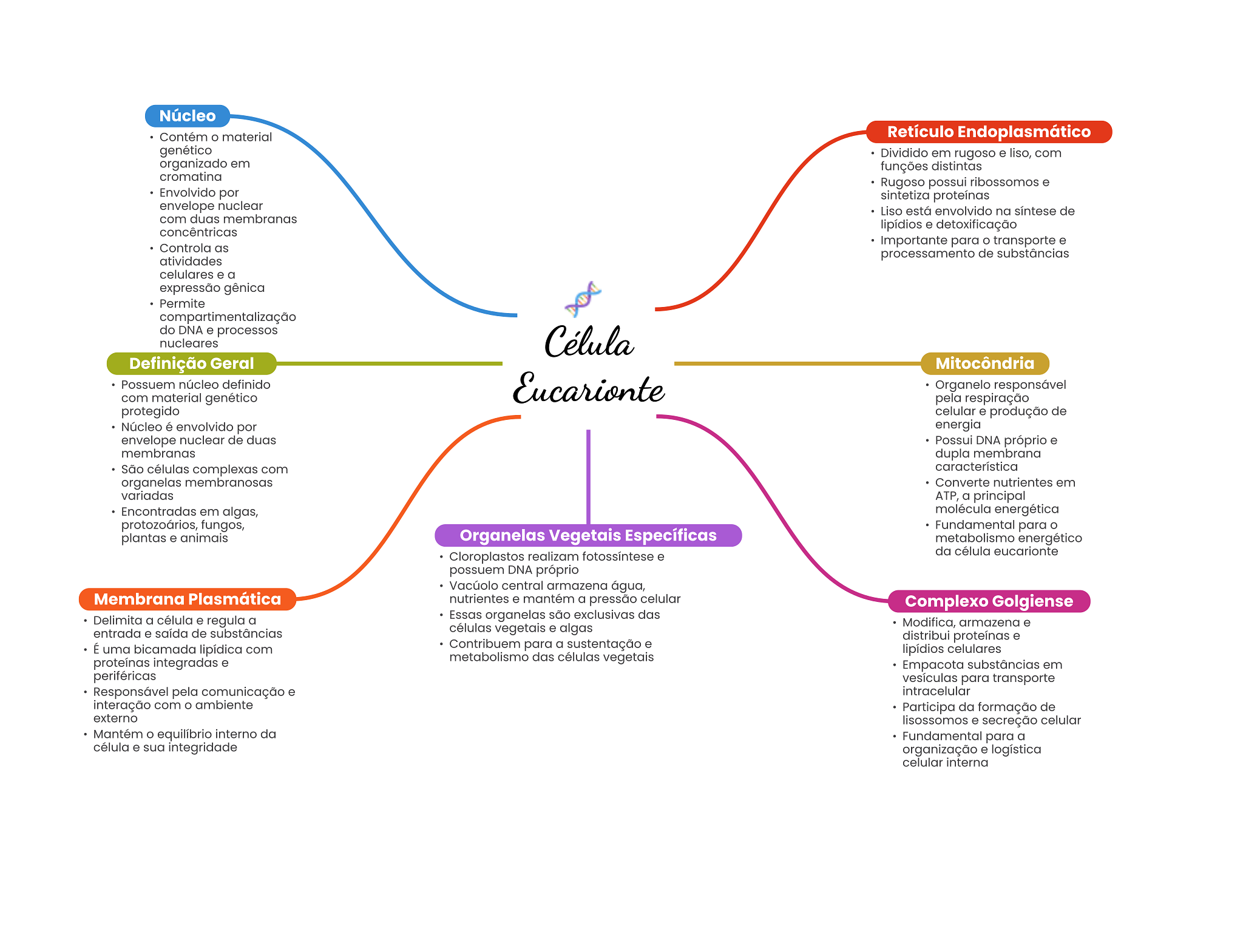 Núcleo Contém material Retículo Endoplasmático genético Dividido em rugoso e liso, com organizado em funções distintas cromatina Rugoso possui ribossomos e Envolvido por sintetiza proteínas envelope nuclear Liso está envolvido na síntese de com duas membranas lipídios e detoxificação concêntricas Importante para transporte e Controla as processamento de substâncias atividades celulares e a expressão gênica Permite do DNA e processos nucleares Célula Definição Geral Mitocôndria Possuem núcleo definido Eucarionte Organelo responsável com material genético pela respiração protegido celular e produção de Núcleo é envolvido por energia envelope nuclear de duas Possui DNA próprio e membranas dupla membrana São células complexas com característica organelas membranosas Converte nutrientes em variadas ATP, a principal Encontradas em algas, molécula energética protozoários, fungos, Fundamental para plantas e animais Organelas Vegetais Específicas metabolismo energético Cloroplastos realizam fotossíntese e da célula eucarionte possuem DNA próprio Vacúolo central armazena água, Membrana Plasmática nutrientes e mantém a pressão celular Complexo Golgiense Delimita a célula e regula a Essas organelas são exclusivas das entrada e saída de substâncias células vegetais e algas Modifica, armazena e distribui proteínas e É uma bicamada lipídica com Contribuem para a sustentação e lipídios celulares proteínas integradas e metabolismo das células vegetais Empacota substâncias em periféricas vesículas para transporte Responsável pela comunicação e intracelular interação com ambiente Participa da formação de externo lisossomos e secreção celular Mantém equilíbrio interno da Fundamental para a célula e sua integridade organização e logística celular interna