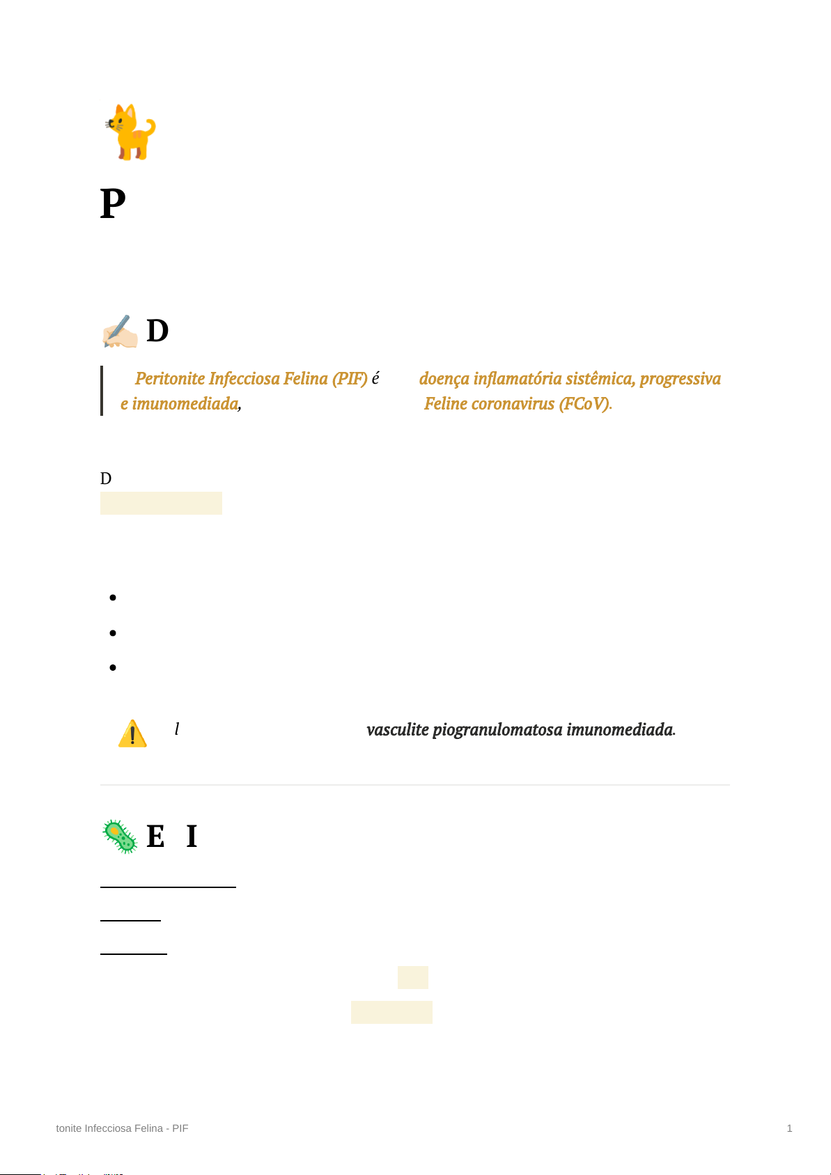 🐈 Peritonite Infecciosa Felina - PIF � DEFINIÇÃO: A Peritonite Infecciosa Felina (PIF) é uma doença in�amatória sistêmica, progressiva e imunomediada, causada por mutação do Feline coronavirus (FCoV). Diferentemente de uma infecção viral primária clássica, a PIF surge a partir da mutação interna do coronavírus entérico felino, que normalmente replica no epitélio intestinal de forma subclínica. Após mutação, o vírus adquire: Tropismo por macrófagos Capacidade de disseminação sistêmica Indução de resposta in�amatória exacerbada ⚠ A lesão central da PIF é uma vasculite piogranulomatosa imunomediada. 🦠 ETIOLOGIA: Agente etiológico: FCoV – vírus RNA envelopado Família: Coronaviridae. Biotipos: 1. FCoV entérico (FECV) → geralmente leve ou assintomático 2. FCoV mutado (FIPV) → forma patogênica sistêmica Peritonite Infecciosa Felina - PIF 1 ⚠ A maioria dos gatos infectados com FCoV nunca desenvolve PIF. 🌎EPIDEMIOLOGIA: Mais comum em gatos 3,5 g/dL (frequente >5) Rivalta positivo Progressão rápida ❌PIF NÃO EFUSIVA (SECA): 🔬Fisiopatologia: Aqui existe resposta imune celular parcial. O sistema imune consegue limitar parcialmente a replicação viral, mas não elimina o vírus. Resultado: Formação de granulomas perivasculares Lesões focais em órgãos In�amação piogranulomatosa crônica 🧠PIF NEUROLÓGICA: 🔬 Fisiopatologia: Lesões granulomatosas em: Meninges Plexo coroide Parênquima encefálico Aumento de proteína no líquor Hidrocefalia secundária pode ocorrer 🧠 Sinais Neurológicos: Ataxia Nistagmo Convulsões Peritonite Infecciosa Felina - PIF 3 Resposta imune celular extremamente ine�caz Replicação viral intensa em macrófagos Vasculite severa Extravasamen maciço de proteínas plasmáticas Formação de efusão rica em proteínas ⚠ O líqui resulta de aum da perme vascul não de hipoal isolada � Sinais Clínicos: Distensão abdominal progressiva Derrame pleural → ➕Órgãos mais acometidos: Fígado Rim Linfonodos mesentéricos Intestino Baço �Sinais clínicos: Variam conforme o órgão afetado: Icterícia (hepático) Massa abdominal Diarreia crônica Perda de peso progressiva Febre intermitente 📌 Evolução: mais arrastada que a forma úmida. 🗂Diagnósticos diferenciais: Linfoma alimentar Doença in�amatória intestinal Micobacteriose Toxoplasmose Alteração comportamental Paresia/paralisia Tremores 📌 Pode ocorrer sem efusão abdominal. 🧪Achado típico no líquor: Proteína elevada Pleocitose mista 👁PIF OCULAR: Frequentemente associada à neurológica. � Sinais Clínicos: Uveíte anterior Hifema Precipitados queráticos Opacidades vítreas Descolamento de retina 📌 pode ser o primeiro sinal clínico da doença. Peritonite Infecciosa Felina - PIF 4 dispneia Febre persistente Prostração rápida Perda de peso 📌 Evolução: geralmente rápida (dias a poucas semanas). 🗂 Diagnóstico Diferencial: Insu�ciência cardíaca direita Linfoma Hipoproteinem grave Peritonite bacteriana 🔎 DIAGNÓSTICO: Não existe teste único de�nitivo ante-mortem. 🔬 Hemogra 🔬 Bioquími Hiperglobu 🧪 Análise de Efusão 🧬 PCR Mais útil em efusão Peritonite Infecciosa Felina - PIF 5 Anemia não regenerativ Linfopenia Neutro�lia Albumina baixa Relação A:G