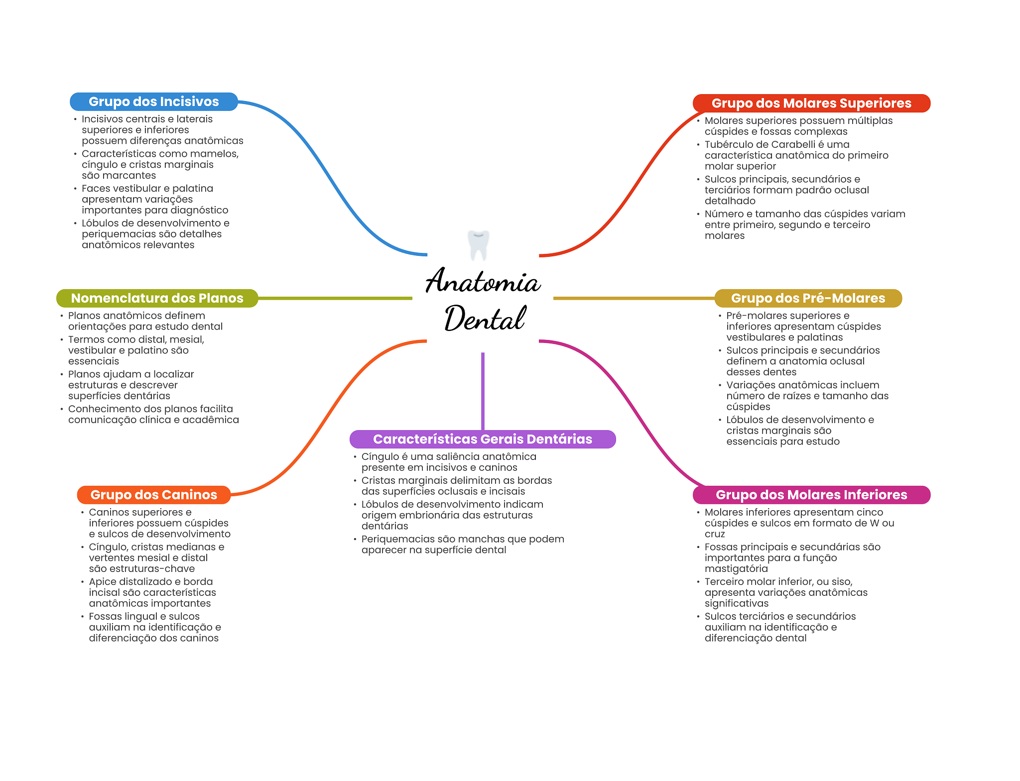 Grupo dos Incisivos Grupo dos Molares Superiores Incisivos centrais e laterais Molares superiores possuem múltiplas superiores e inferiores cúspides e fossas complexas possuem diferenças anatômicas Tubérculo de Carabelli é uma Características como mamelos, característica anatômica do primeiro cíngulo e cristas marginais molar superior são marcantes Sulcos principais, secundários e Faces vestibular e palatina terciários formam padrão oclusal apresentam variações detalhado importantes para diagnóstico Número e tamanho das cúspides variam Lóbulos de desenvolvimento e entre primeiro, segundo e terceiro periquemacias são detalhes molares anatômicos relevantes Anatomia Nomenclatura dos Planos Grupo dos Pré-Molares Planos anatômicos definem Dental Pré-molares superiores e orientações para estudo dental inferiores apresentam cúspides Termos como distal, mesial, vestibulares e palatinas vestibular e palatino são Sulcos principais e secundários essenciais definem a anatomia oclusal Planos ajudam a localizar desses dentes estruturas e descrever Variações anatômicas incluem superfícies dentárias número de raízes e tamanho das Conhecimento dos planos facilita cúspides comunicação clínica e acadêmica Lóbulos de desenvolvimento e cristas marginais são Características Gerais Dentárias essenciais para estudo Cíngulo é uma saliência anatômica presente em incisivos e caninos Cristas marginais delimitam as bordas Grupo dos Caninos das superfícies oclusais e incisais Grupo dos Molares Inferiores Lóbulos de desenvolvimento indicam Caninos superiores e origem embrionária das estruturas Molares inferiores apresentam cinco inferiores possuem cúspides dentárias cúspides e sulcos em formato de W ou e sulcos de desenvolvimento cruz Periquemacias são manchas que podem Cíngulo, cristas medianas e aparecer na superfície dental Fossas principais e secundárias são vertentes mesial e distal importantes para a função são estruturas-chave mastigatória Apice distalizado e borda Terceiro molar inferior, ou siso, incisal são características apresenta variações anatômicas anatômicas importantes significativas Fossas lingual e sulcos Sulcos terciários e secundários auxiliam na identificação e auxiliam na identificação e diferenciação dos caninos diferenciação dental