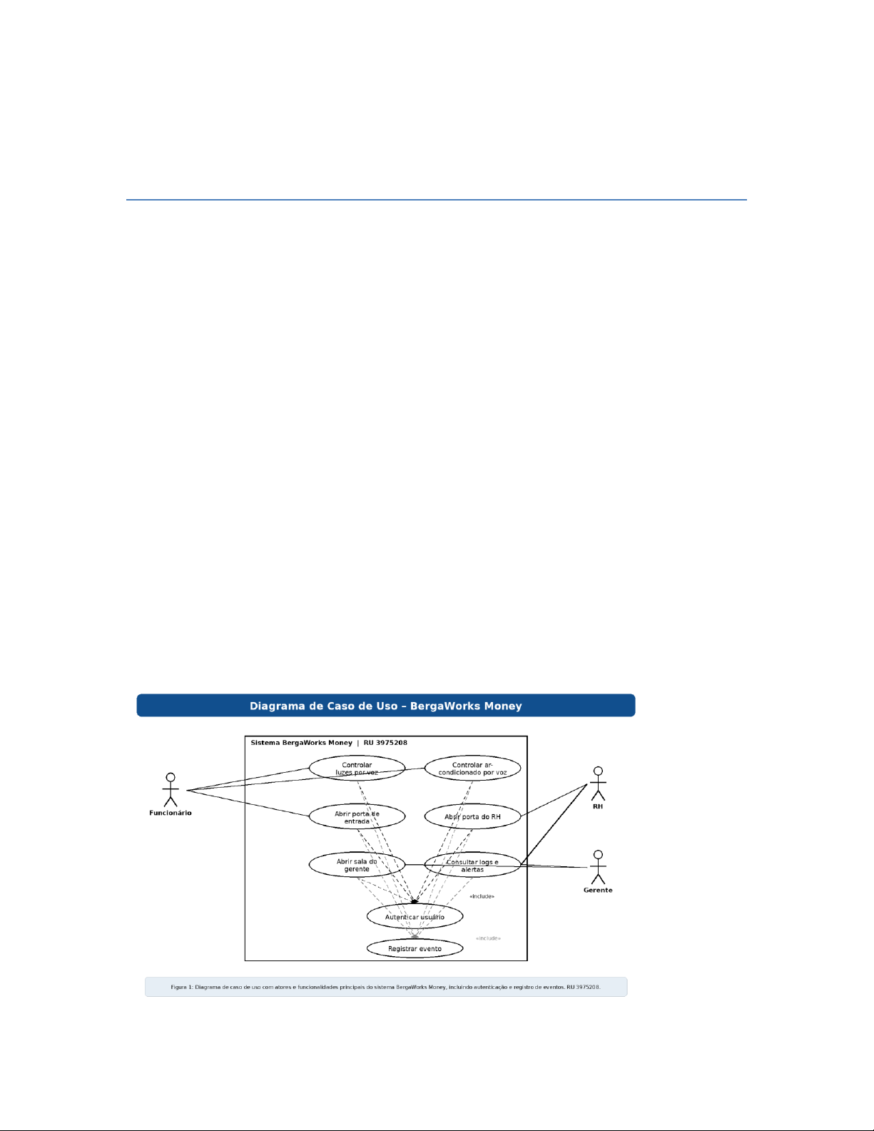 ATIVIDADE PRÁTICA - ANÁLISE E MODELAGEM DE SISTEMAS Aluno: Saulo César Santos de Souza RU: 3975208 Questão 01 – Diagrama de Caso de Uso Requisitos Funcionais: - O sistema deve permitir controle de acesso por identificação - O sistema deve automatizar luzes e ar-condicionado - O sistema deve registrar entrada e saída de usuários Requisitos Não Funcionais: - O sistema deve ter tempo de resposta inferior a 2 segundos - O sistema deve garantir segurança dos dados - O sistema deve funcionar 24 horas por dia Figura 1: Diagrama de caso de uso do sistema com controle de acesso e automação. Resposta: Os requisitos funcionais descrevem as funcionalidades do sistema, ou seja, o que ele deve executar. Já os requisitos não funcionais representam características de qualidade e restrições, como desempenho, segurança e disponibilidade. Questão 02 – Diagrama de Classes Requisitos Funcionais: - Gerenciar usuários - Validar acesso - Controlar dispositivos Requisitos Não Funcionais: - Desempenho rápido - Segurança de dados - Escalabilidade Figura 2: Diagrama de classes representando a estrutura do sistema. Resposta: Para converter requisitos em classes, identificamos os principais elementos do sistema (entidades), seus atributos e suas ações (métodos). Esses elementos são organizados em classes que representam a estrutura do sistema. Questão 01 – Diagrama de Caso de Uso Questão 02 – Diagrama de Classes