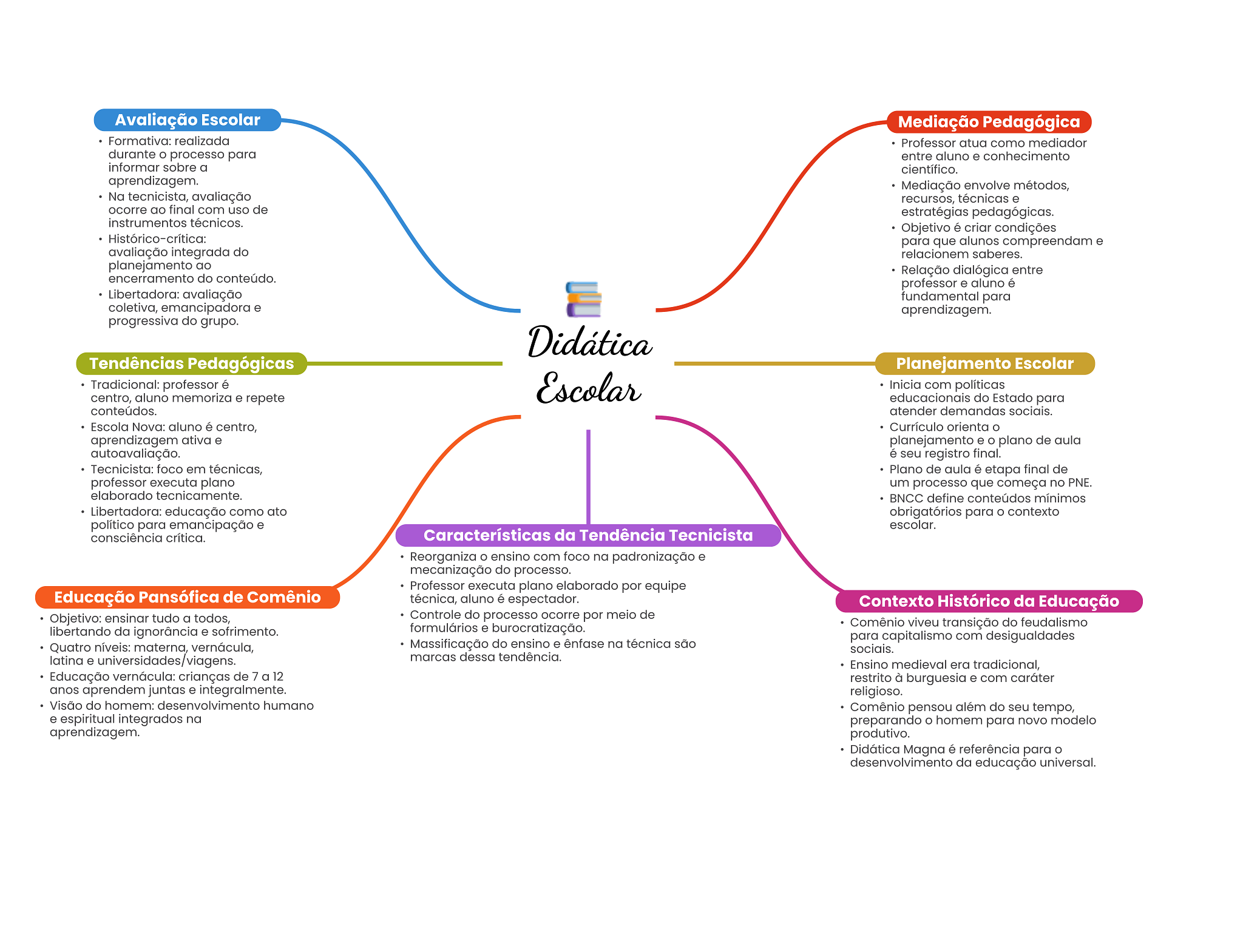 Avaliação Escolar Mediação Pedagógica Formativa: realizada Professor atua como mediador durante processo para entre aluno e conhecimento informar sobre a científico. aprendizagem. Mediação envolve métodos, Na tecnicista, avaliação recursos, técnicas e ocorre ao final com uso de estratégias pedagógicas. instrumentos técnicos. Objetivo é criar condições Histórico-crítica: para que alunos compreendam e avaliação integrada do relacionem saberes. planejamento ao Relação dialógica entre encerramento do conteúdo. professor e aluno é Libertadora: avaliação fundamental para coletiva, emancipadora e aprendizagem. progressiva do grupo. Didática Tendências Pedagógicas Planejamento Escolar Tradicional: professor é Escolar Inicia com políticas centro, aluno memoriza e repete educacionais do Estado para conteúdos. atender demandas sociais. Escola Nova: aluno é centro, Currículo orienta aprendizagem ativa e planejamento e plano de aula autoavaliação. é seu registro final. Tecnicista: foco em técnicas, Plano de aula é etapa final de professor executa plano um processo que começa no PNE. elaborado tecnicamente. BNCC define conteúdos mínimos Libertadora: educação como ato obrigatórios para O contexto político para emancipação e escolar. consciência crítica. Características da Tendência Tecnicista Reorganiza ensino com foco na padronização e mecanização do processo. Professor executa plano elaborado por equipe Educação Pansófica de Comênio técnica, aluno é espectador. Contexto Histórico da Educação Objetivo: ensinar tudo a todos, Controle do processo ocorre por meio de formulários e burocratização. Comênio viveu transição do feudalismo libertando da ignorância e sofrimento. para capitalismo com desigualdades Quatro níveis: materna, vernácula, Massificação do ensino e ênfase na técnica são sociais. latina e universidades/viagens. marcas dessa tendência. Ensino medieval era tradicional, Educação vernácula: crianças de 7 a 12 restrito à burguesia e com caráter anos aprendem juntas e integralmente. religioso. Visão do homem: desenvolvimento humano Comênio pensou além do seu tempo, e espiritual integrados na preparando homem para novo modelo aprendizagem. produtivo. Didática Magna é referência para desenvolvimento da educação universal.