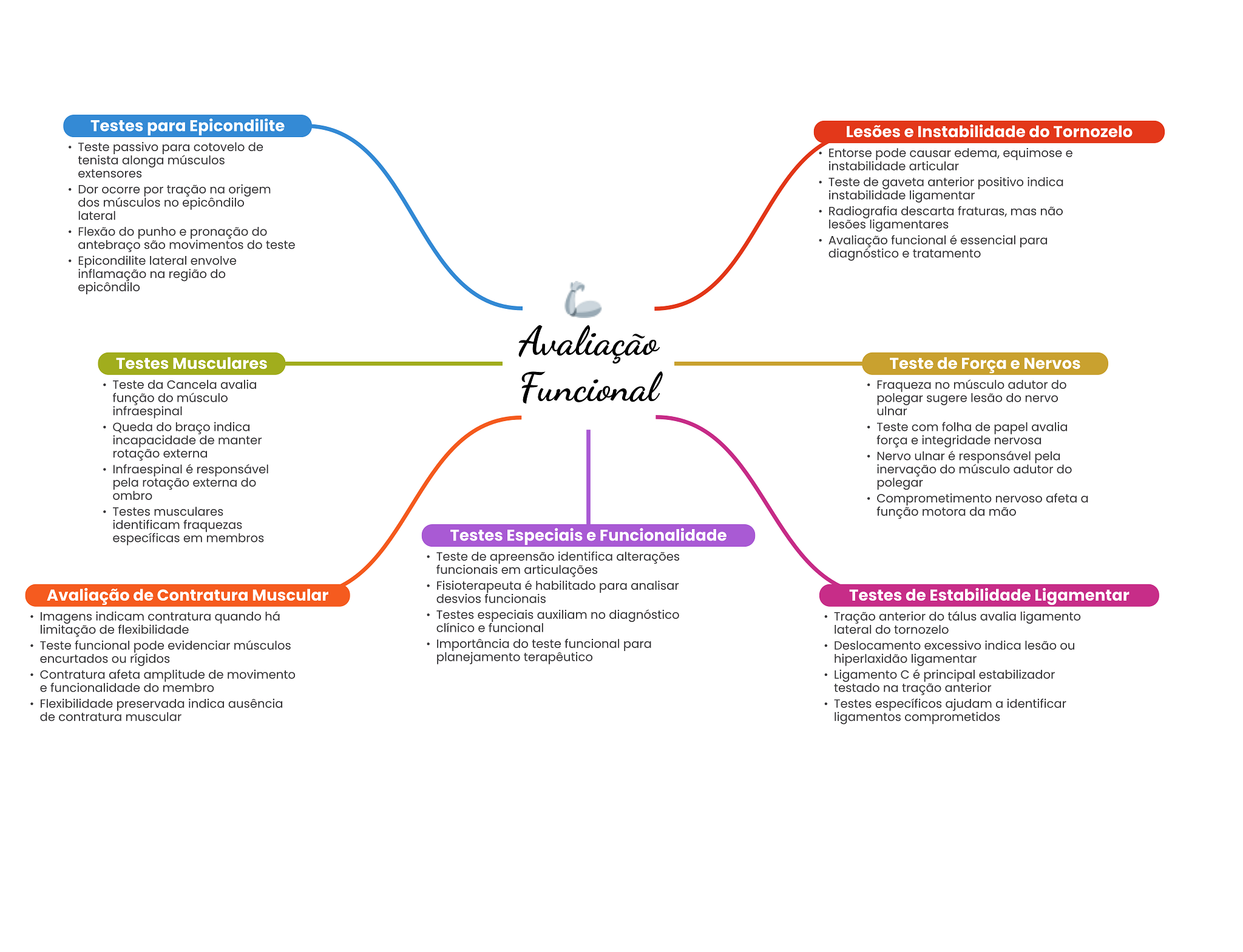 Testes para Epicondilite Lesões e Instabilidade do Tornozelo Teste passivo para cotovelo de Entorse pode causar edema, equimose e tenista alonga músculos instabilidade articular extensores Teste de gaveta anterior positivo indica Dor ocorre por tração na origem instabilidade ligamentar dos músculos no epicôndilo lateral Radiografia descarta fraturas, mas não Flexão do punho e pronação do lesões ligamentares antebraço são movimentos do teste Avaliação funcional é essencial para Epicondilite lateral envolve diagnóstico e tratamento inflamação na região do epicôndilo Avaliação Testes Musculares Teste de Força e Nervos Teste da Cancela avalia Funcional Fraqueza no músculo adutor do função do músculo polegar sugere lesão do nervo infraespinal ulnar Queda do braço indica Teste com folha de papel avalia incapacidade de manter força e integridade nervosa rotação externa Nervo ulnar é responsável pela Infraespinal é responsável inervação do músculo adutor do pela rotação externa do polegar ombro Comprometimento nervoso afeta a Testes musculares função motora da mão identificam fraquezas específicas em membros Testes Especiais e Funcionalidade Teste de apreensão identifica alterações funcionais em articulações Fisioterapeuta é habilitado para analisar Avaliação de Contratura Muscular desvios funcionais Testes de Estabilidade Ligamentar Imagens indicam contratura quando há Testes especiais auxiliam no diagnóstico Tração anterior do tálus avalia ligamento limitação de flexibilidade clínico e funcional lateral do tornozelo Teste funcional pode evidenciar músculos Importância do teste funcional para Deslocamento excessivo indica lesão ou encurtados ou rígidos planejamento terapêutico hiperlaxidão ligamentar Contratura afeta amplitude de movimento Ligamento C é principal estabilizador e funcionalidade do membro testado na tração anterior Flexibilidade preservada indica ausência Testes específicos ajudam a identificar de contratura muscular ligamentos comprometidos