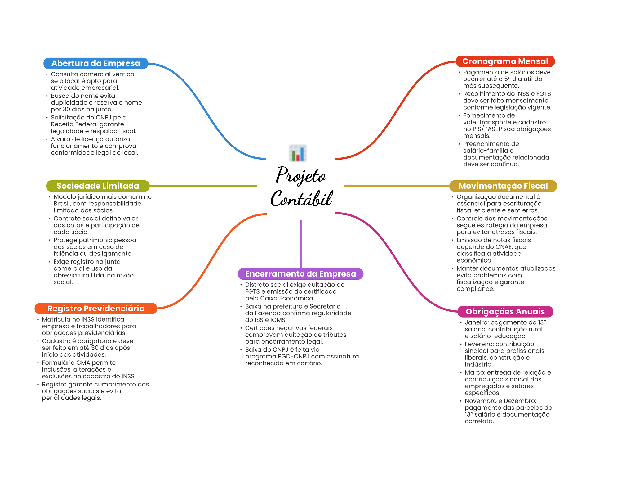 Abertura da Empresa Cronograma Mensal Consulta comercial verifica Pagamento de salários deve se local é apto para ocorrer até 5° dia útil do atividade empresarial. mês subsequente. Busca do nome evita Recolhimento do INSS e FGTS duplicidade e reserva nome deve ser feito mensalmente por 30 dias na junta. conforme legislação vigente. Solicitação do CNPJ pela Fornecimento de Receita Federal garante vale-transporte e cadastro legalidade e respaldo fiscal. no PIS/PASEP são obrigações mensais. Alvará de licença autoriza funcionamento e comprova Preenchimento de conformidade legal do local. salário-família e documentação relacionada deve ser contínuo. Projeto Sociedade Limitada Movimentação Fiscal Modelo jurídico mais comum no Contábil Organização documental é Brasil, com responsabilidade essencial para escrituração limitada dos sócios. fiscal eficiente e sem erros. Contrato social define valor Controle das movimentações das cotas e participação de segue estratégia da empresa cada sócio. para evitar atrasos fiscais. Protege patrimônio pessoal Emissão de notas fiscais dos sócios em caso de depende do CNAE, que falência ou desligamento. classifica a atividade Exige registro na junta econômica. comercial e uso da Manter documentos atualizados abreviatura Ltda. na razão Encerramento da Empresa evita problemas com social. Distrato social exige quitação do fiscalização e garante FGTS e emissão do certificado compliance. pela Caixa Econômica. Registro Previdenciário Baixa na prefeitura e Secretaria da Fazenda confirma regularidade Obrigações Anuais Matrícula no INSS identifica do ISS e ICMS. Janeiro: pagamento do 13° empresa e trabalhadores para Certidões negativas federais salário, contribuição rural obrigações previdenciárias. comprovam quitação de tributos e salário-educação. Cadastro é obrigatório e deve para encerramento legal. Fevereiro: contribuição ser feito em até 30 dias após Baixa do CNPJ é feita via início das atividades. sindical para profissionais programa PGD-CNPJ com assinatura liberais, construção e Formulário CMA permite reconhecida em cartório. indústria. inclusões, alterações e exclusões no cadastro do INSS. Março: entrega de relação e contribuição sindical dos Registro garante cumprimento das empregados e setores obrigações sociais e evita específicos. penalidades legais. Novembro e Dezembro: pagamento das parcelas do 13° salário e documentação correlata.