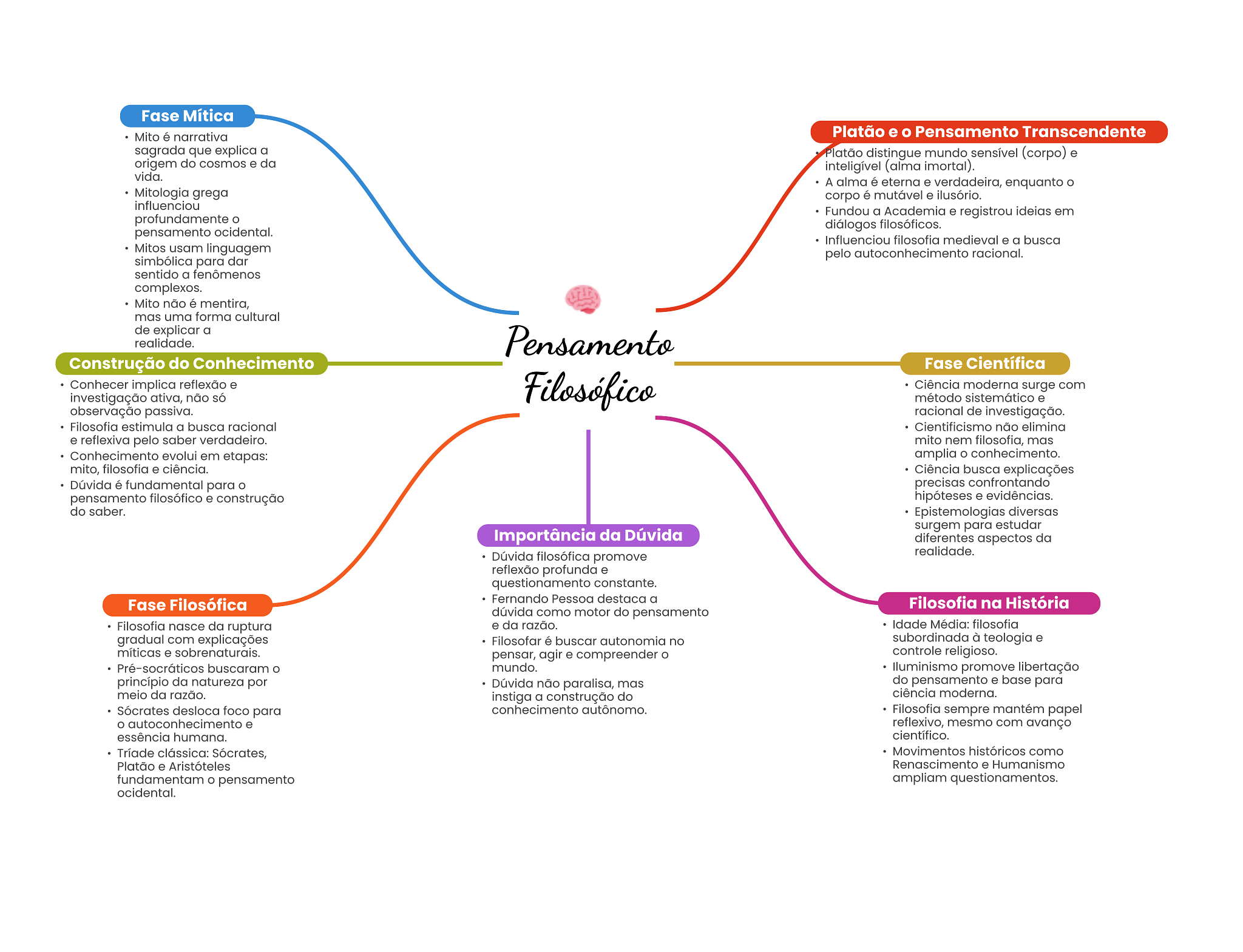 Fase Mítica Mito é narrativa Platão e Pensamento Transcendente sagrada que explica a Platão distingue mundo sensível (corpo) e origem do cosmos e da inteligível (alma imortal). vida. A alma é eterna e verdadeira, enquanto Mitologia grega corpo é mutável e ilusório. influenciou Fundou a Academia e registrou ideias em profundamente diálogos filosóficos. pensamento ocidental. Influenciou filosofia medieval e a busca Mitos usam linguagem pelo autoconhecimento racional. simbólica para dar sentido a fenômenos complexos. Mito não é mentira, mas uma forma cultural de explicar a realidade. Pensamento Construção do Conhecimento Fase Científica Conhecer implica reflexão e Filosófico Ciência moderna surge com investigação ativa, não só método sistemático e observação passiva. racional de investigação. Filosofia estimula a busca racional Cientificismo não elimina e reflexiva pelo saber verdadeiro. mito nem filosofia, mas Conhecimento evolui em etapas: amplia conhecimento. mito, filosofia e ciência. Ciência busca explicações Dúvida é fundamental para precisas confrontando pensamento filosófico e construção hipóteses e evidências. do saber. Epistemologias diversas surgem para estudar Importância da Dúvida diferentes aspectos da Dúvida filosófica promove realidade. reflexão profunda e questionamento constante. Fase Filosófica Fernando Pessoa destaca a Filosofia na História dúvida como motor do pensamento Filosofia nasce da ruptura e da razão. Idade Média: filosofia gradual com explicações Filosofar é buscar autonomia no subordinada à teologia e míticas e sobrenaturais. pensar, agir e compreender controle religioso. Pré-socráticos buscaram mundo. promove libertação princípio da natureza por Dúvida não paralisa, mas do pensamento e base para meio da razão. instiga a construção do ciência moderna. Sócrates desloca foco para conhecimento autônomo. Filosofia sempre mantém papel autoconhecimento e reflexivo, mesmo com avanço essência humana. científico. Tríade clássica: Sócrates, Movimentos históricos como Platão e Aristóteles Renascimento e Humanismo fundamentam pensamento ampliam questionamentos. ocidental.