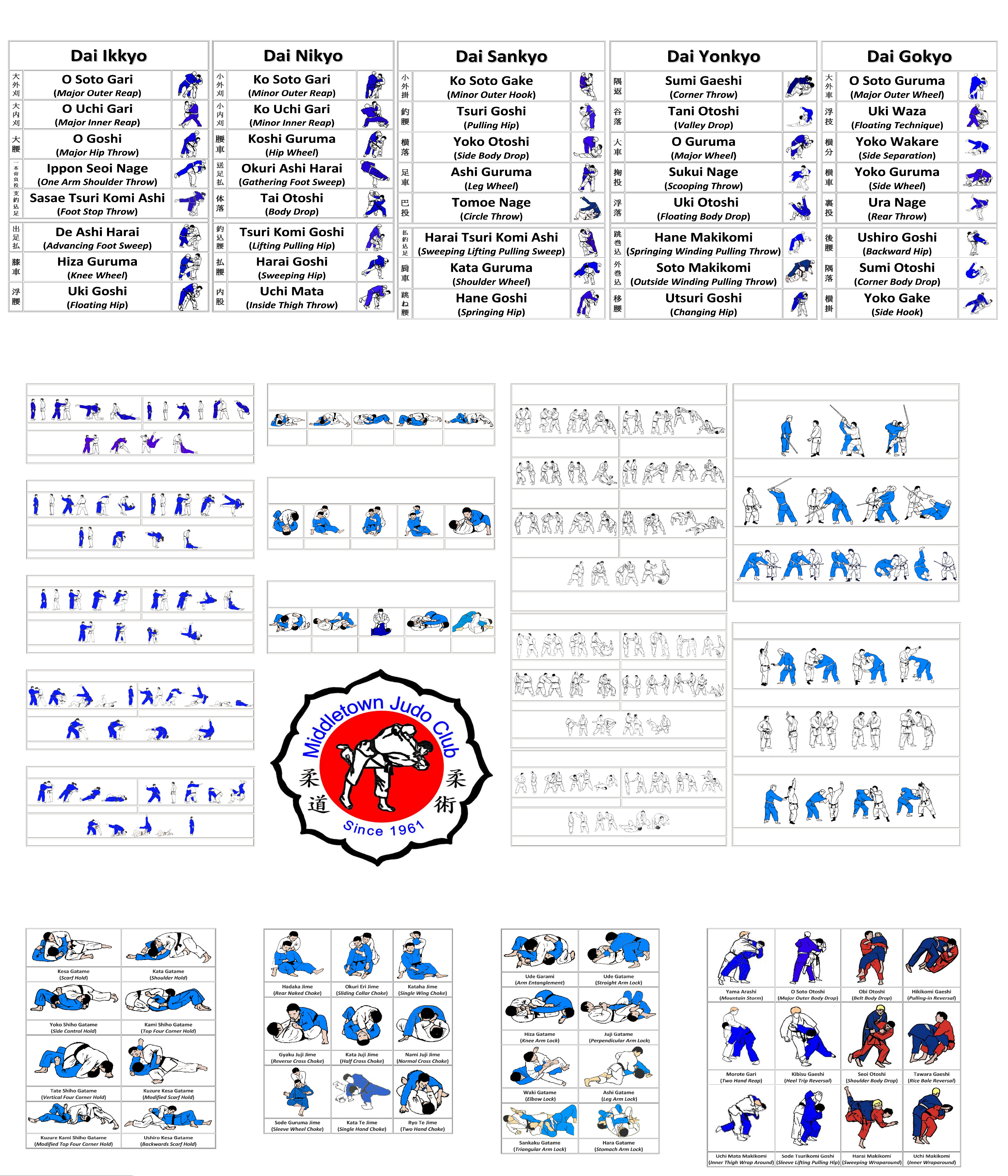 The Traditional Gokyo no Waza of Kodokan Judo Basic Pins (Osaekomi Waza) Basic Chokes (Shime Waza) Basic Joint Locks (Kansetsu Waza) Few Additional Throws (Shinmeisho no Waza) Te Waza (Hand Techniques) Uki Otoshi (Floating Body Drop) Seoi Nage (Shoulder Throw) Kata Guruma (Shoulder Wheel) Koshi Waza (Hip Techniques) Uki Goshi (Floating Hip) Harai Goshi (Sweeping Hip) Tsuri Komi Goshi (Lifting Pulling Hip) Ashi Waza (Foot Techniques) Okuri Ashi Harai (Gathering Foot Sweep) Sasae Tsuri Komi Ashi (Foot Stop Throw) Uchi Mata (Inside Thigh Throw) Ma Sutemi Waza (Rear Sacrifice Techniques) TomoeNage (Circle Throw) UraNage (Rear Throw) Sumi Gaeshi (Corner Throw) Yoko Sutemi Waza (Side Sacrifice Techniques) Yoko Gake (Side Hook) Yoko Guruma (Side Wheel) Uki Waza (Floating Technique) Osaekomi Waza (Pins or Holding Techniques) Kesa Gatame (Scarf Hold) Kata Gatame (Shoulder Hold) Kami Shiho Gatame (Top Four Corner Hold) Yoko Shiho Gatame (Side Control Hold) Kuzure Kami Shiho Gatame (Modified Top 4 Corner Hold) Shime Waza (Choking Techniques) Kata Juji Jime (Half Cross Choke) Hadaka Jime (Rear Naked Choke) Okuri Eri Jime (Sliding Collar Choke) Kataha Jime (Single Wing Choke) Gyaku Juji Jime (Reverse Cross Choke) Kansetsu Waza (Joint Locks) Ude Hishigi Ude Garami (Arm Entanglement) Ude Hishigi Juji Gatame (Perpendicular Arm Lock) Ude Hishigi Ude Gatame (Straight Arm Lock) Hiza Gatame (Knee Arm Lock) Ashi Garami (Leg Entanglement) Unarmed Close-in Attacks by Holding Ryote Dori (Two Hand Hold) Hidari Eri Dori (Left Lapel Hold) Migi Eri Dori (Right Lapel Hold) Kata Ude Dori (Single Hand Hold) Ushiro Eri Dori (Back Collar Hold) Ushiro Jime (Rear Choke) Kakae Dori (Rear Seizure) Unarmed Attacks at a Distance Naname Uchi (Slanting Strike) Ago Tsuki (Uppercut) Gammen Tsuki (Jab) Mae Geri (Front Kick) Yoko Geri (Side Kick) Armed Attacks - Knife Tsukkake (Close-in Thrust) Choku Zuki (Straight Thrust) Naname Zuki (Slanting Stab) Armed Attacks - Stick Furiage (Upswing) Furioroshi (Downswing) Morote Zuke (Two Hand Thrust) Armed Attacks - Gun Shomen Zuke (Pistol to Abdomen) Koshi Gamae (Pistol at Side) Haimen Zuke (Pistol Against The Back) NNaaggee nnoo KKaattaa ((FFoorrmmss ooff TThhrroowwiinngg)) KKaattaammee nnoo KKaattaa ((FFoorrmmss ooff GGrraapppplliinngg)) GGoosshhiinn JJuuttssuu ((FFoorrmmss ooff SSeellff DDeeffeennssee))