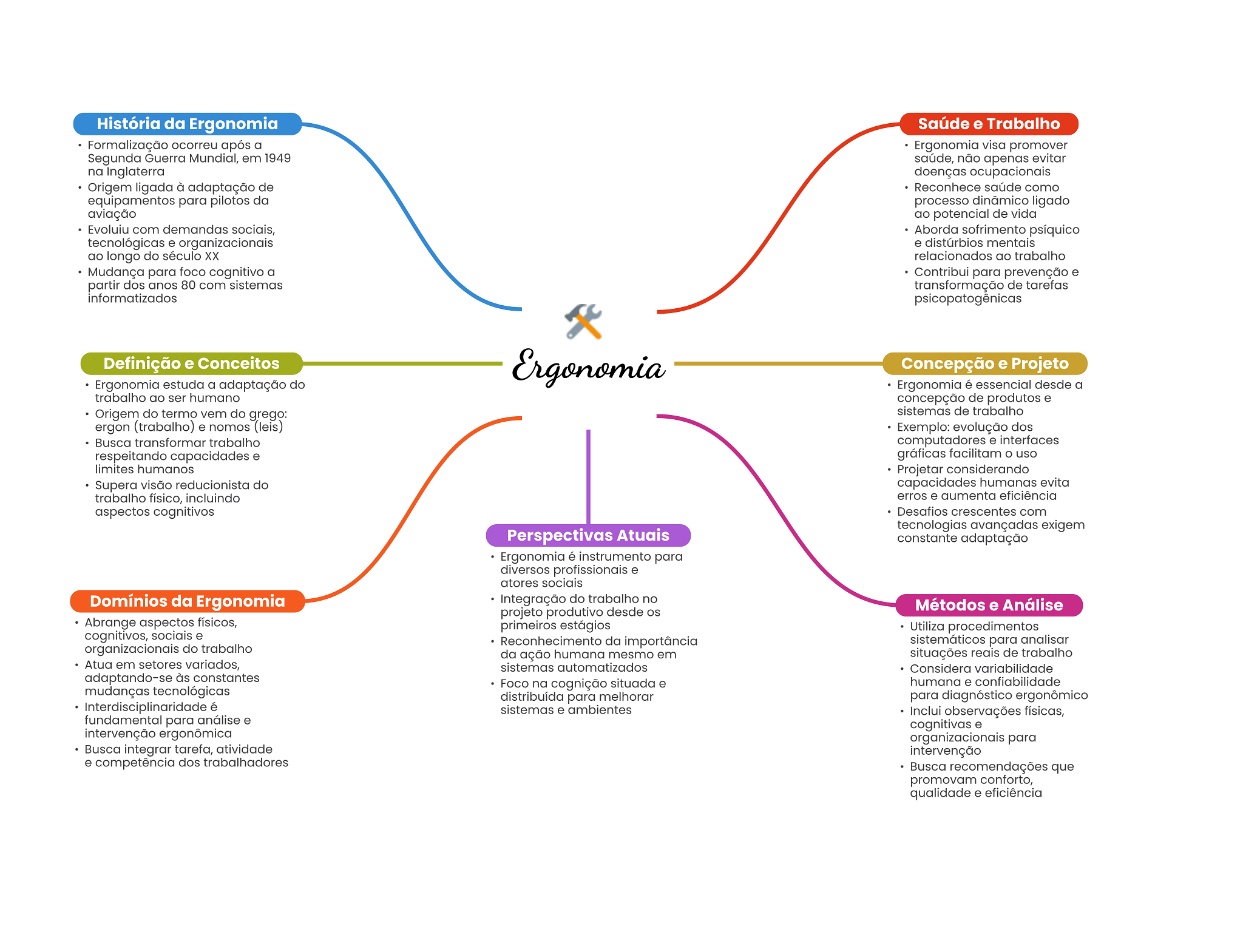 História da Ergonomia Saúde e Trabalho Formalização ocorreu após a Ergonomia visa promover Segunda Guerra Mundial, em 1949 saúde, não apenas evitar na Inglaterra doenças ocupacionais Origem ligada à adaptação de Reconhece saúde como equipamentos para pilotos da processo dinâmico ligado aviação ao potencial de vida Evoluiu com demandas sociais, Aborda sofrimento psíquico tecnológicas e organizacionais e distúrbios mentais ao longo do século XX relacionados ao trabalho Mudança para foco cognitivo a Contribui para prevenção e partir dos anos 80 com sistemas transformação de tarefas informatizados psicopatogênicas Definição e Conceitos Ergonomia Concepção e Projeto Ergonomia estuda a adaptação do Ergonomia é essencial desde a trabalho ao ser humano concepção de produtos e Origem do termo vem do grego: sistemas de trabalho ergon (trabalho) e nomos (leis) Exemplo: evolução dos Busca transformar trabalho computadores e interfaces respeitando capacidades e gráficas facilitam uso limites humanos Projetar considerando Supera visão reducionista do capacidades humanas evita trabalho físico, incluindo erros e aumenta eficiência aspectos cognitivos Desafios crescentes com tecnologias avançadas exigem Perspectivas Atuais constante adaptação Ergonomia é instrumento para diversos profissionais e atores sociais Domínios da Ergonomia Integração do trabalho no Métodos e Análise projeto produtivo desde os Abrange aspectos físicos, primeiros estágios Utiliza procedimentos cognitivos, sociais e Reconhecimento da importância sistemáticos para analisar organizacionais do trabalho da ação humana mesmo em situações reais de trabalho Atua em setores variados, sistemas automatizados Considera variabilidade adaptando-se às constantes Foco na cognição situada e humana e confiabilidade mudanças tecnológicas distribuída para melhorar para diagnóstico ergonômico Interdisciplinaridade é sistemas e ambientes Inclui observações físicas, fundamental para análise e cognitivas e intervenção ergonômica organizacionais para Busca integrar tarefa, atividade intervenção e competência dos trabalhadores Busca recomendações que promovam conforto, qualidade e eficiência