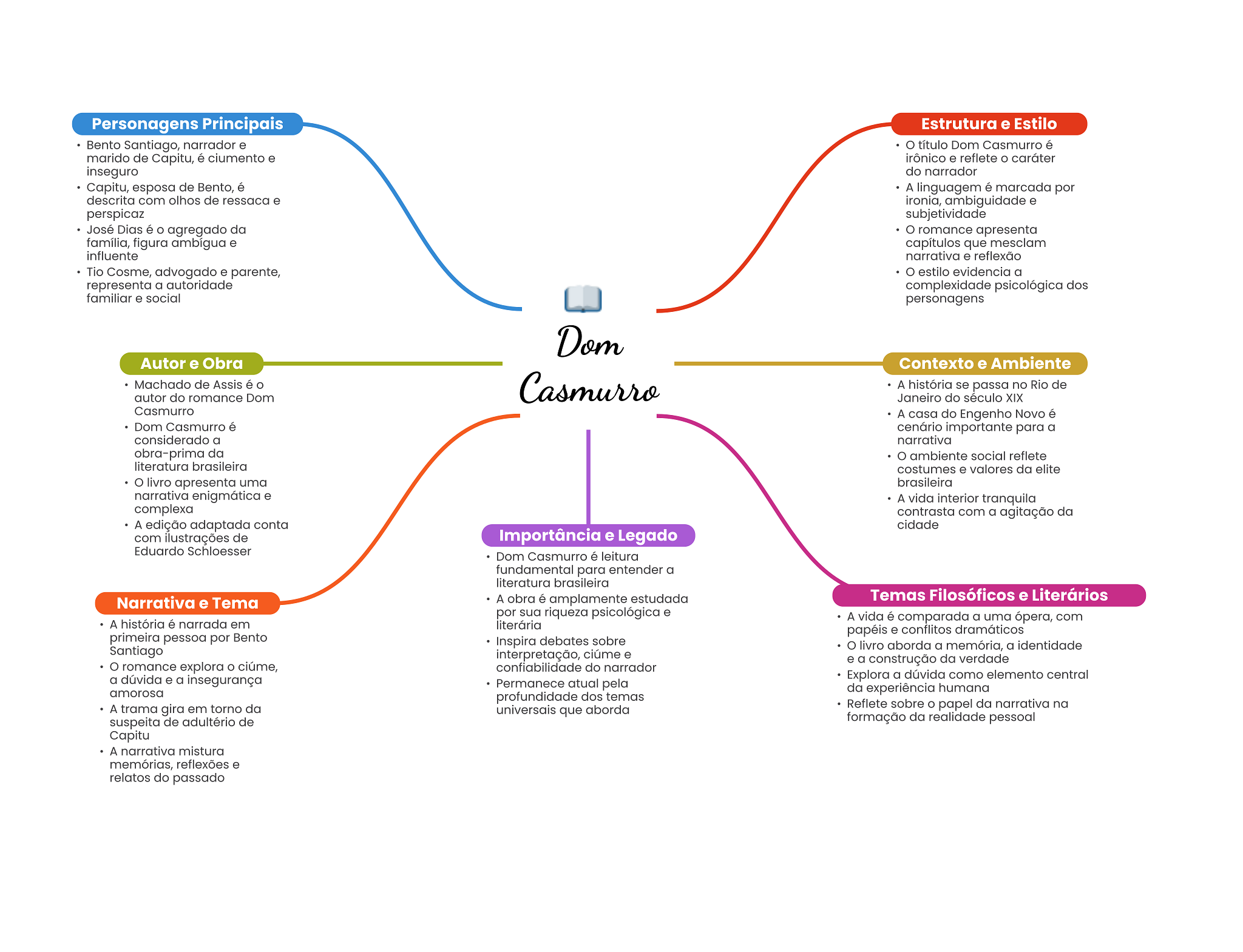 Personagens Principais Estrutura e Estilo Bento Santiago, narrador e título Dom Casmurro é marido de Capitu, é ciumento e irônico e reflete caráter inseguro do narrador Capitu, esposa de Bento, é A linguagem é marcada por descrita com olhos de ressaca e ironia, ambiguidade e perspicaz subjetividade José Dias é agregado da romance apresenta família, figura ambígua e capítulos que mesclam influente narrativa e reflexão Tio Cosme, advogado e parente, O estilo evidencia a representa a autoridade complexidade psicológica dos familiar e social personagens Dom Autor e Obra Contexto e Ambiente Machado de Assis é Casmurro A história se passa no Rio de autor do romance Dom Janeiro do século XIX Casmurro A casa do Engenho Novo é Dom Casmurro é cenário importante para a considerado a narrativa obra-prima da ambiente social reflete literatura brasileira costumes e valores da elite livro apresenta uma brasileira narrativa enigmática e A vida interior tranquila complexa contrasta com a agitação da A edição adaptada conta cidade com ilustrações de Importância e Legado Eduardo Schloesser Dom Casmurro é leitura fundamental para entender a literatura brasileira Narrativa e Tema A obra é amplamente estudada Temas Filosóficos e Literários por sua riqueza psicológica e A vida é comparada a uma ópera, com A história é narrada em literária papéis e conflitos dramáticos primeira pessoa por Bento Inspira debates sobre Santiago O livro aborda a memória, a identidade interpretação, ciúme e e a construção da verdade romance explora ciúme, confiabilidade do narrador a dúvida e a insegurança Explora a dúvida como elemento central Permanece atual pela amorosa da experiência humana profundidade dos temas A trama gira em torno da universais que aborda Reflete sobre O papel da narrativa na suspeita de adultério de formação da realidade pessoal Capitu A narrativa mistura memórias, reflexões e relatos do passado
