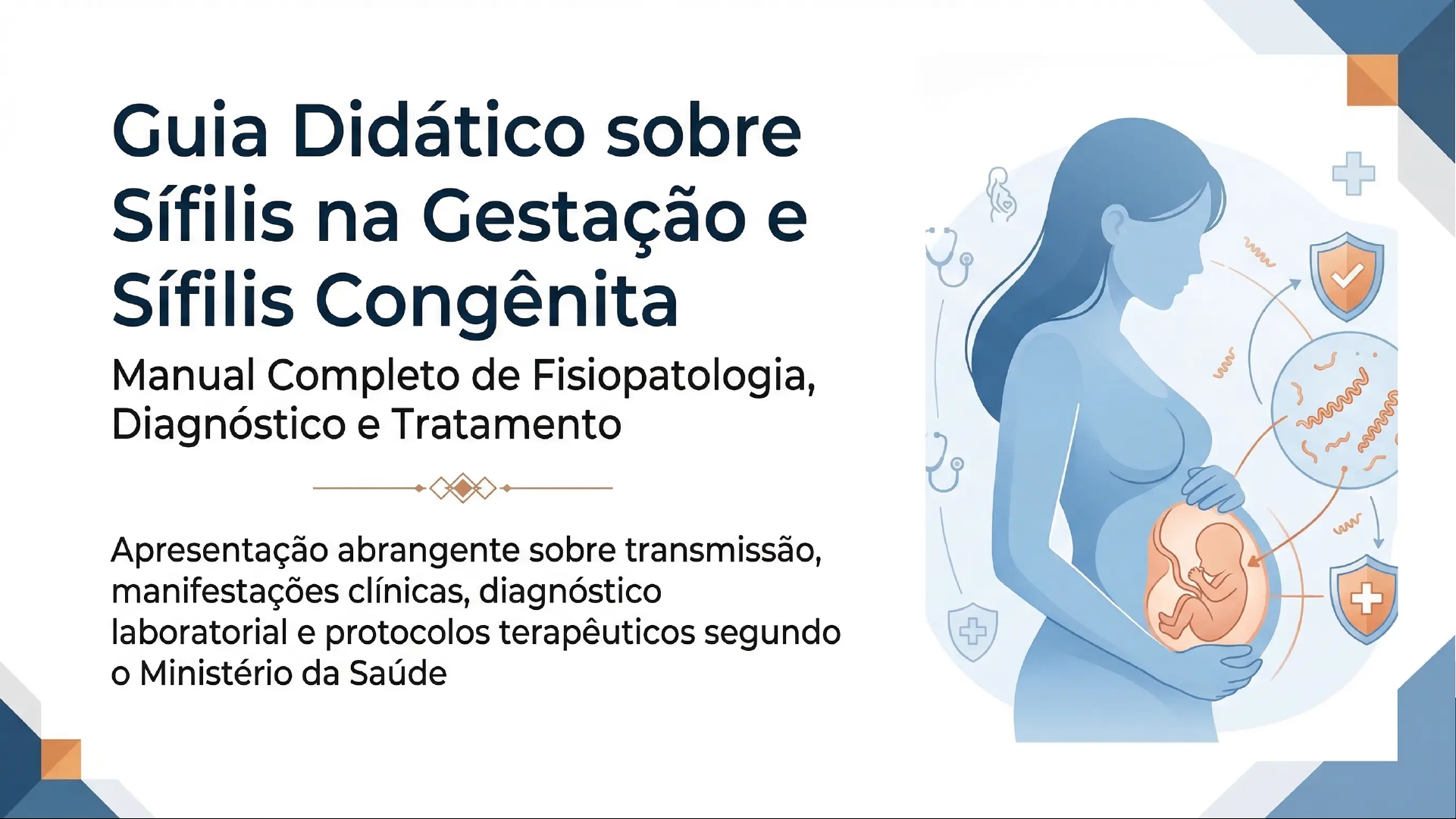 Guia Didático sobre Sífilis na Gestação e Sífilis Congênita Manual Completo de Fisiopatologia, Diagnóstico e Tratamento Apresentação abrangente sobre transmissão, manifestações clínicas, diagnóstico laboratorial e protocolos terapêuticos segundo Ministério da SaúdeMeios de Transmissão e Importância da Triagem Meios de Transmissão Triagem Pré-Natal Obrigatória Transmissão Sexual (Principal Via) Cronograma de Triagem (3 Momentos Cruciais) Contato direto com lesões infectadas Consulta Pré-Natal Sexo vaginal, anal e oral sem proteção Primeiro trimestre Treponema atravessa microlesões da Identificar infecção precoce pele/mucosas Tratar antes da transmissão fetal Cancro duro: úlcera indolor rica em bactérias Semana (Terceiro Trimestre) Transmissão Vertical (Mãe Feto) Detectar infecção adquirida durante gestação Via hematogênica através da placenta Segunda oportunidade de diagnóstico Maior risco: sífilis primária, secundária e latente Momento do Parto recente Alta bacteremia facilita transmissão Detectar infecção não diagnosticada Pode ocorrer em qualquer fase da gestação Avaliar risco de sífilis congênita Outras Vias (Menos Comuns) Por Que Triagem é Essencial? Transfusão sanguínea (raro hoje triagem L Sífilis congênita é 100% evitável obrigatória) Transmissão de 70-100% se não tratada Contato direto com lesões/secreções contaminadas Tratamento simples e eficaz disponívelFisiopatologia: Mecanismo da Doença Como Treponema pallidum causa lesões no organismo Etapa 1: Etapa 2: Etapa 3: Etapa 4: Invasão Inicial Lesão Vascular Consequências Manifestações Central Teciduais Clínicas Treponema pallidum Endarterite Obliterante Isquemia e Necrose Sintomas Diversos Bactéria espiroqueta Inflamação dos vasos Redução do fluxo Causa de todas as muito móvel sanguíneos sanguíneo manifestações Atravessa muco- Proliferação da Isquemia dos sas e pele camada íntima tecidos Infiltração de Úlceras Rash Dissemina-se pelo Necrose celular linfócitos e (cancro duro) cutâneo sangue plasmócitos Inflamação local Dissemina-se de Lesões em pelo sangue Estreitamento do vaso Invade vasos Lesões em sanguíneos órgãosManifestações Clínicas Maternas: Fases Primária e Secundária Sífilis Primária Sífilis Secundária (10-90 dias após infecção) (6 semanas a 6 meses após infecção) Cancro Duro Disseminação Hematogênica Úlcera genital indolor Treponema se espalha pela corrente sanguínea Borda endurecida e fundo limpo Rash Cutâneo Atinge pele, mucosas, fígado, baço e sistema Rica em treponemas (altamente Característico linfático contagiosa) Rash Cutâneo Característico Formada por necrose tecidual devido à Manchas em todo corpo endarterite obliterante Patognomônico: palmas das mãos e plantas Linfadenopatia Regional dos pés Aumento dos linfonodos inguinais Causado por vasculite e inflamação dérmica Cancro Indolores e firmes Duro Condiloma Lata Resultado da drenagem bacteriana para Lesões verrucosas úmidas em região os linfonodos genital/perianal Grande quantidade de bactérias Fisiopatologia: Multiplicação local da bactéria infiltrado inflamatório endarterite obliterante Sintomas Sistêmicos necrose e formação da úlcera Febre, mal-estar, cefaleia Linfadenomegalia generalizadaManifestações Clínicas Maternas: Fases Latente e Terciária Diferenciação entre sífilis latente recente e tardia, e as complicações graves da fase terciária SÍFILIS LATENTE SÍFILIS TERCIÁRIA Fase assintomática com sorologia positiva Manifestações tardias por resposta imunológica crônica Sífilis Latente Recente Gomas Sifilíticas Infecção com menos de 1 ano Lesões granulomatosas destrutivas Maior atividade bacteriana Podem afetar pele, OSSOS e fígado Maior risco de transmissão vertical Resultado de inflamação crônica Maior bacteremia no sangue materno Sífilis Cardiovascular Sífilis Latente Tardia Aneurisma da aorta ascendente Infecção com mais de 1 ano Insuficiência da válvula aórtica Menor bacteremia Menor risco de transmissão Inflamação crônica da parede aórtica Treponema em estado de persistência Neurosífilis Importância no Pré-natal: Invasão do sistema nervoso central A classificação determina esquema de Pode causar meningite, demência tratamento e risco para feto Alterações motoras e cognitivasDiagnóstico Laboratorial: Testes Não Treponêmicos e Treponêmicos Comparação entre Métodos de Triagem e Confirmação Testes Não Treponêmicos Testes Treponêmicos TESTES DE TRIAGEM TESTES CONFIRMATÓRIOS VDRL e RPR FTA-ABS, TPHA, Testes Rápidos Detectam anticorpos anticardiolipina Detectam anticorpos específicos Quantitativos (titulação) contra Treponema Baratos e práticos Qualitativos (positivo/negativo) Acompanham resposta ao tratamento Mais específicos Confirmam diagnóstico Mecanismo Reação de floculação com complexo Mecanismo: Utilizam antígenos reais do cardiolipina-lecitina-colesterol Treponema pallidum Titulação Exemplo Cicatriz Sorológica VDRL 1:32 1:16 Uma vez positivos, permanecem positivos 1:4 por toda a vida (memória imunológica) Queda indica resposta ao tratamento Vantagens Limitações Alta especificidade Falsos positivos (gravidez, lúpus, infecções) Teste rápido disponível no pré-natal Falsos negativos (efeito prozona) Não sofrem interferência de outras doençasSífilis Congênita: Transmissão e Impacto Fetal Mecanismo de Invasão Placentária e Consequências Fetais Seção 3: Manifestações Fetais Principais Seção 1: Processo de Seção 2: Impacto Imediato na Placenta Bacteremia Inflamação placentária intensa Transmissão Vertical Vasculite dos vasos placentários Edema e alteração das trocas Treponema pallidum materno-fetais Redução da oxígenação fetal Hepatomegalia circula no sangue Invasão bacteriana do Esplenomegalia materno (bacteremia) fígado fetal Hiperplasia do sistema Inflamação hepática com imune fetal Invasão d