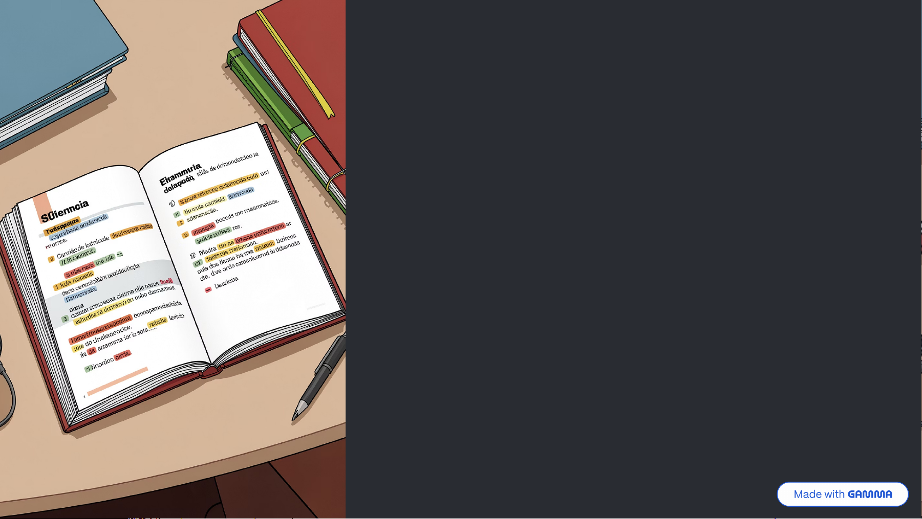 Concordância para Concursos: Dominando a Língua Portuguesa Uma guia completa para dominar os desafios da concordância verbal e nominal nas provas de língua portuguesa https://gamma.app/?utm_source=made-with-gamma O Que é Concordância? A Base da Comunicação Clara Concordância é a harmonia que deve existir entre os termos da frase. É a regra que garante a clareza e a correção gramatical na língua portuguesa. Quando os elementos concordam perfeitamente, a comunicação flui naturalmente e o sentido fica evidente para o leitor ou ouvinte. https://gamma.app/?utm_source=made-with-gamma Concordância Verbal: O Verbo Segue o Sujeito Regra Fundamental O verbo concorda em número (singular ou plural) e pessoa (1ª, 2ª ou 3ª) com o sujeito da oração Exemplo Prático "O candidato e o examinador chegaram cedo." Sujeito composto exige verbo no plural Atenção Especial Identifique sempre o núcleo do sujeito antes de escolher a forma verbal adequada https://gamma.app/?utm_source=made-with-gamma Casos Especiais de Concordância Verbal Substantivos Coletivos Quando o sujeito é coletivo, o verbo geralmente fica no singular Exemplo: "A multidão aplaudiu entusiasmada." Coletivo + Núcleo no Plural Com expressões como "um bando de", "uma multidão de", o verbo pode ir para o singular ou plural Exemplo: "Um bando de pássaros voou/voaram para o sul." Partitivos e Percentuais Com expressões como "a maioria de", "parte de", o verbo pode concordar com o núcleo ou com o termo regido Exemplo: "A maioria dos candidatos estudou/estudaram bastante." https://gamma.app/?utm_source=made-with-gamma https://gamma.app/?utm_source=made-with-gamma Concordância Nominal: A Harmonia entre Substantivo e Determinantes O Conceito Adjetivos, artigos, pronomes e numerais devem concordar em gênero (masculino/feminino) e número (singular/plural) com o substantivo Exemplo Clássico "Os meninos inteligentes foram aprovados." Observe a concordância perfeita em todos os termos Elementos que Concordam Adjetivos (inteligentes) Artigos (os) Pronomes (deles) Numerais (três meninos) https://gamma.app/?utm_source=made-with-gamma Regras e Exceções na Concordância Nominal Adjetivo Antes dos Substantivos Quando o adjetivo vem antes de dois ou mais substantivos, pode concordar com o mais próximo ou com todos Exemplo: "É preciso força e coragem femininas." A concordância pode ser: femininas (com os dois) ou feminina (com o mais próximo) Pronomes de Tratamento Pronomes como "mesmo", "próprio", "possível" concordam com o substantivo a que se referem Exemplo: "Ela mesma fez o bolo." Note que "mesma" concorda com "ela" (feminino singular) https://gamma.app/?utm_source=made-with-gamma https://gamma.app/?utm_source=made-with-gamma Dicas de Ouro para o Concurso Leia o Enunciado com Atenção Identifique claramente o sujeito e todos os termos que se ligam a ele na frase. A primeira palavra pode não ser o núcleo do sujeito! Desconfie dos Coletivos Substantivos coletivos, pronomes e adjetivos em posições incomuns são armadilhas comuns. Verifique sempre com qual termo deve haver concordância. Pratique Constantemente Resolva questões de provas anteriores e revise os erros. A prática deliberada é o caminho para a maestria na concordância. https://gamma.app/?utm_source=made-with-gamma Domine a Concordância, Conquiste a Vaga! Consistência é a Chave A prática leva à perfeição. Estude regularmente e revise sempre as regras e exceções Não Desista Cada questão resolvida te aproxima da sua aprovação. Continue firme no seu objetivo! https://gamma.app/?utm_source=made-with-gamma