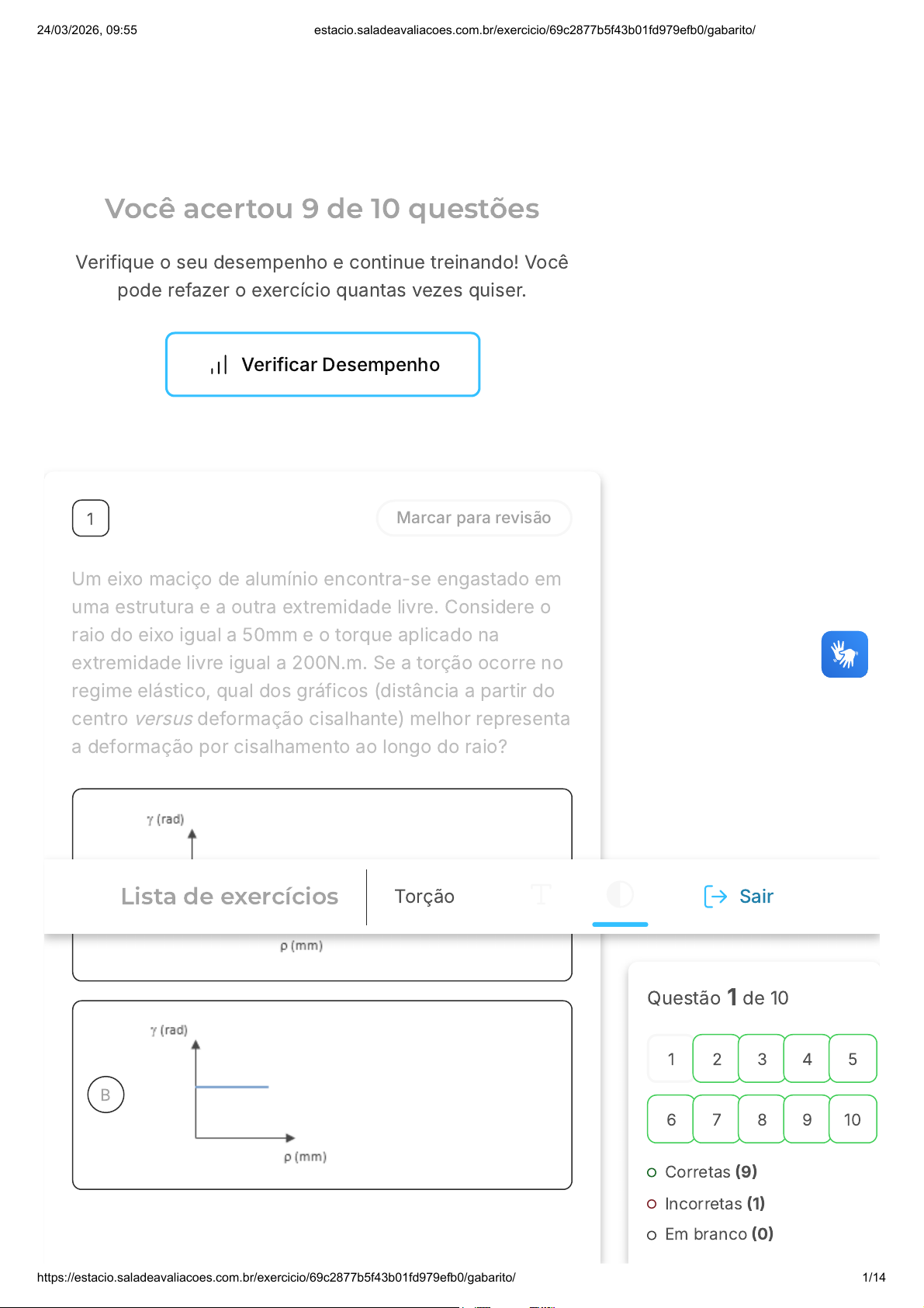 Você acertou 9 de 10 questões Verifique o seu desempenho e continue treinando! Você pode refazer o exercício quantas vezes quiser. Verificar Desempenho A B 1 Marcar para revisão Um eixo maciço de alumínio encontra-se engastado em uma estrutura e a outra extremidade livre. Considere o raio do eixo igual a 50mm e o torque aplicado na extremidade livre igual a 200N.m. Se a torção ocorre no regime elástico, qual dos gráficos (distância a partir do centro versus deformação cisalhante) melhor representa a deformação por cisalhamento ao longo do raio? Questão 1 de 10 Corretas (9) Incorretas (1) Em branco (0) 1 2 3 4 5 6 7 8 9 10 Lista de exercícios Torção Sair 24/03/2026, 09:55 estacio.saladeavaliacoes.com.br/exercicio/69c2877b5f43b01fd979efb0/gabarito/ https://estacio.saladeavaliacoes.com.br/exercicio/69c2877b5f43b01fd979efb0/gabarito/ 1/14 C D E Resposta incorreta Opa! A alternativa correta é a letra E. Confira o gabarito comentado! Gabarito Comentado Gabarito: Solução: Como c e são constantes para um dado carregamento e uma seção circular particular, γ = ⋅ γmáxima ρ c γmáxima 24/03/2026, 09:55 estacio.saladeavaliacoes.com.br/exercicio/69c2877b5f43b01fd979efb0/gabarito/ https://estacio.saladeavaliacoes.com.br/exercicio/69c2877b5f43b01fd979efb0/gabarito/ 2/14 A B C D E temos que: Assim, são diretamente proporcionais (reta crescente passando pela origem). γ = k ⋅ ρ γ e ρ 2 Marcar para revisão (CESGRANRIO / 2015) O eixo de saída de um motor elétrico possui três engrenagens dispostas conforme mostrado na figura abaixo. As engrenagens acionam sistemas mecânicos que requerem os torques , e com os sentidos indicados. O torque máximo atuante no eixo decorrente do efeito exclusivo de torção situa-se na região entre a engrenagem T1 = 1, 0kN .m T2 = 2, 0kN .m T3 = 2, 5kN .m 1 e o motor, e vale 5,5kN.m. 1 e a engrenagem 2, e vale 3,0kN.m. 1 e a engrenagem 2, e vale 5,5kN.m. 2 e a engrenagem 3, e vale 4,5kN.m. 2 e a engrenagem 3, e vale 5,5kN.m. 24/03/2026, 09:55 estacio.saladeavaliacoes.com.br/exercicio/69c2877b5f43b01fd979efb0/gabarito/ https://estacio.saladeavaliacoes.com.br/exercicio/69c2877b5f43b01fd979efb0/gabarito/ 3/14 A B C Resposta correta Parabéns, você selecionou a alternativa correta. Confira o gabarito comentado! Gabarito Comentado Gabarito: 1 e o motor, e vale 5,5kN.m. Solução: Fazendo um "corte" na seção entre o motor e torque e, admitindo-se o equilíbrio, o torque interno atuante na seção é igual a . Qualquer outro "corte" feito, à direita terá menos torques a equilibrar. Logo, entre o motor e o o valor do torque interno é máximo. T1 1 + 2 + 2, 5 = 5, 5kN .m T1 3 Marcar para revisão (AL-MT / 2013) Uma barra de seção maciça circular de de diâmetro está rigidamente fixada em uma extremidade e livre em outra extremidade. Para que ocorra nesta barra uma tensão máxima cisalhante de , o momento de torção, em , a ser aplicado na sua extremidade livre é: 20mm 2MPa N .m π 2π 4π 24/03/2026, 09:55 estacio.saladeavaliacoes.com.br/exercicio/69c2877b5f43b01fd979efb0/gabarito/ https://estacio.saladeavaliacoes.com.br/exercicio/69c2877b5f43b01fd979efb0/gabarito/ 4/14 D E 10π 20π Resposta correta Parabéns, você selecionou a alternativa correta. Confira o gabarito comentado! Gabarito Comentado A questão pede o momento de torção necessário para que ocorra uma tensão máxima cisalhante de em uma barra de seção maciça circular de de diâmetro. Para resolver isso, utilizamos a fórmula da tensão máxima cisalhante: , onde é o momento de torção e é o raio da seção transversal da barra. Substituindo os valores dados na questão na fórmula, temos: . Resolvendo para , obtemos , que corresponde à alternativa A. 2MPa 20mm tmáxima = 2T π.c3 T c 2 ⋅ 106 = 2T π⋅(0,01)3 T T = πN .m 4 Marcar para revisão (Resistência dos Materiais, HIBBELER, R.C, 2010, p. 161 - adaptada) Um tubo quadrado de alumínio tem as dimensões mostradas na figura. Determine a tensão de cisalhamento média no tubo no ponto A se ele for submetido a um torque de 85N.m 24/03/2026, 09:55 estacio.saladeavaliacoes.com.br/exercicio/69c2877b5f43b01fd979efb0/gabarito/ https://estacio.saladeavaliacoes.com.br/exercicio/69c2877b5f43b01fd979efb0/gabarito/ 5/14 A B C D E 0,8MPa. 1,0MPa. 1,7MPa. 2.6MPa. 3,2MPa. Resposta correta Parabéns, você selecionou a alternativa correta. Confira o gabarito comentado! Gabarito Comentado Gabarito: 1,7MPa. Solução: A média = τmédia = T 2.t.Amédia 2500.10−6m2. t = 0, 01m τmédia = = 1, 7MPa85 2⋅(0,01)⋅(2500⋅10−6) 24/03/2026, 09:55 estacio.saladeavaliacoes.com.br/exercicio/69c2877b5f43b01fd979efb0/gabarito/ https://estacio.saladeavaliacoes.com.br/exercicio/69c2877b5f43b01fd979efb0/gabarito/ 6/14 A B C D E 5 Marcar para revisão (Questão 5.33 do livro Resistência dos Materiais, HIBBELER, R.C, 2010, p. 138) O projeto prevê que o eixo de transmissão AB de um automóvel será um tubo de parede fina. O motor transmite 125kW quando o eixo está girando a 1500rpm. Determine a espessura mínima da parede do eixo se o diâmetro externo for 62,5mm. A tensão de cisalhamento admissível do material é 50MPa. Fonte: Resistência dos materiais, HIBBELER, R.C, 2010, p. 138. 3,0mm. 3,5mm. 4,0mm. 4,5mm. 5,0mm. Resposta correta Parabéns, você selecionou a alternativa correta. Confira o gabarito comentado! Gabarito Comentado Gabarito: 3,0mm. Solução: f = 1500rpm = 25Hz 24/03/2026, 09:55 estacio.saladeavaliacoes.com.br/exercicio/69c2877b5f43b01fd979efb0/gabarito/ https://estacio.saladeavaliacoes.com.br/exercicio/69c2877b5f43b01fd979efb0/gabarito/ 7/14 A B C Assim, Cext = 31, 25mm = 0, 03125m Pot = 2p ⋅ f ⋅ T 125000 = 2p ⋅ 25 ⋅ T T = 796, 2N .m tmáxima = 2.T .cext π⋅(c4 ext−c4 int) 50.106 = 2⋅(796,2)⋅(0,03125) π⋅(0,031254−c4 int cint = 0, 02825m = 28, 25mm t = 31, 25 − 28, 25 = 3, 0mm 6 Marcar para revisão (Questão 3.127 do livro Fonte: Resistência dos Materiais, BEER, F.P., JOHNSTON, E.