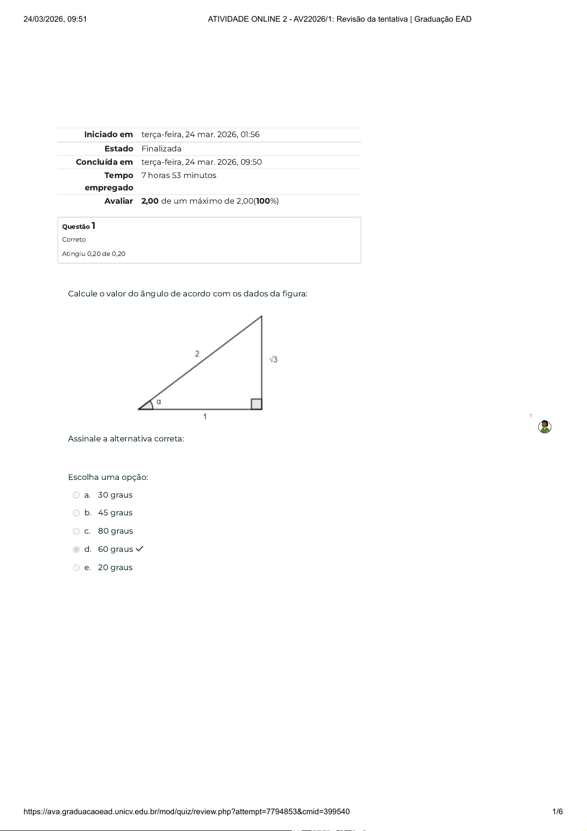 Iniciado em terça-feira, 24 mar. 2026, 01:56 Estado Finalizada Concluída em terça-feira, 24 mar. 2026, 09:50 Tempo empregado 7 horas 53 minutos Avaliar 2,00 de um máximo de 2,00(100%) Questão 1 Correto Atingiu 0,20 de 0,20 Calcule o valor do ângulo de acordo com os dados da figura: Assinale a alternativa correta: Escolha uma opção: a. 30 graus b. 45 graus c. 80 graus d. 60 graus ✓ e. 20 graus 1 24/03/2026, 09:51 ATIVIDADE ONLINE 2 - AV22026/1: Revisão da tentativa | Graduação EAD https://ava.graduacaoead.unicv.edu.br/mod/quiz/review.php?attempt=7794853&cmid=399540 1/6 Questão 2 Correto Atingiu 0,20 de 0,20 Questão 3 Correto Atingiu 0,20 de 0,20 Calcule o valor de x de acordo com as dados apresentados na figura abaixo: Assinale a alternativa correta: Escolha uma opção: a. 327,5 ✓ b. 587,77 c. 555,0 d. 600 e. 456,21 Chama-se função exponencial a função tal que o número é chamado de base da função. A função exponencial pode ser crescente ou decrescente a depender do valor da base. Seja a função . Assinale a alternativa que indica o valor de . Escolha uma opção: a. 0 b. 2 ✓ c. 1 d. 8 e. 4 f(x) = 2x−1 f(2) 1 24/03/2026, 09:51 ATIVIDADE ONLINE 2 - AV22026/1: Revisão da tentativa | Graduação EAD https://ava.graduacaoead.unicv.edu.br/mod/quiz/review.php?attempt=7794853&cmid=399540 2/6 Questão 4 Correto Atingiu 0,20 de 0,20 Questão 5 Correto Atingiu 0,20 de 0,20 Assinale a alternativa que representa o número 2100000000 em base dez. Assinale a alternativa correta. Escolha uma opção: a. b. c. d. ✓ e. 21 ⋅ 10−9 2, 1 ⋅ 10−9 21 ⋅ 109 2, 1 ⋅ 109 2, 1 ⋅ 1011 A raiz do número pode ser representada como: Assinale a alternativa correta. Escolha uma opção: a. b. c. d. ✓ e. x5−− √ x3/5 x2/5 x3/2 x5/2 x1/2 1 24/03/2026, 09:51 ATIVIDADE ONLINE 2 - AV22026/1: Revisão da tentativa | Graduação EAD https://ava.graduacaoead.unicv.edu.br/mod/quiz/review.php?attempt=7794853&cmid=399540 3/6 Questão 6 Correto Atingiu 0,20 de 0,20 Questão 7 Correto Atingiu 0,20 de 0,20 Determine o valor da incógnita x de acordo com os dados apresentados na figura: Diante do exposto, marque a alternativa correta: Escolha uma opção: a. x = 3,2 b. x = 4 c. x = 1,5 d. x = 2 ✓ e. x = 5 A raiz do número pode ser representada como: Assinale a alternativa correta. Escolha uma opção: a. b. ✓ c. d. e. x2−− √6 x1/2 x2/6 x3/2 x2/3 x6/2 1 24/03/2026, 09:51 ATIVIDADE ONLINE 2 - AV22026/1: Revisão da tentativa | Graduação EAD https://ava.graduacaoead.unicv.edu.br/mod/quiz/review.php?attempt=7794853&cmid=399540 4/6 Questão 8 Correto Atingiu 0,20 de 0,20 Questão 9 Correto Atingiu 0,20 de 0,20 Determine o valor aproximado do cateto do triângulo a baixo: Sobre isso, assinale a alternativa correta: Escolha uma opção: a. 7 b. 9 c. 11 d. 7,9 e. 8,3 ✓ Determine o perímetro em metros da figura abaixo: Assinale a alternativa correta: Escolha uma opção: a. 14m b. 10m c. 16m ✓ d. 12m e. 18m 1 24/03/2026, 09:51 ATIVIDADE ONLINE 2 - AV22026/1: Revisão da tentativa | Graduação EAD https://ava.graduacaoead.unicv.edu.br/mod/quiz/review.php?attempt=7794853&cmid=399540 5/6 Questão 10 Correto Atingiu 0,20 de 0,20 Determine o valor aproximado da hipotenusa do triângulo abaixo: Assinale a alternativa correta: Escolha uma opção: a. 11,9 b. 13,1 c. 12,85 ✓ d. 10,2 e. 10,55 1 24/03/2026, 09:51 ATIVIDADE ONLINE 2 - AV22026/1: Revisão da tentativa | Graduação EAD https://ava.graduacaoead.unicv.edu.br/mod/quiz/review.php?attempt=7794853&cmid=399540 6/6