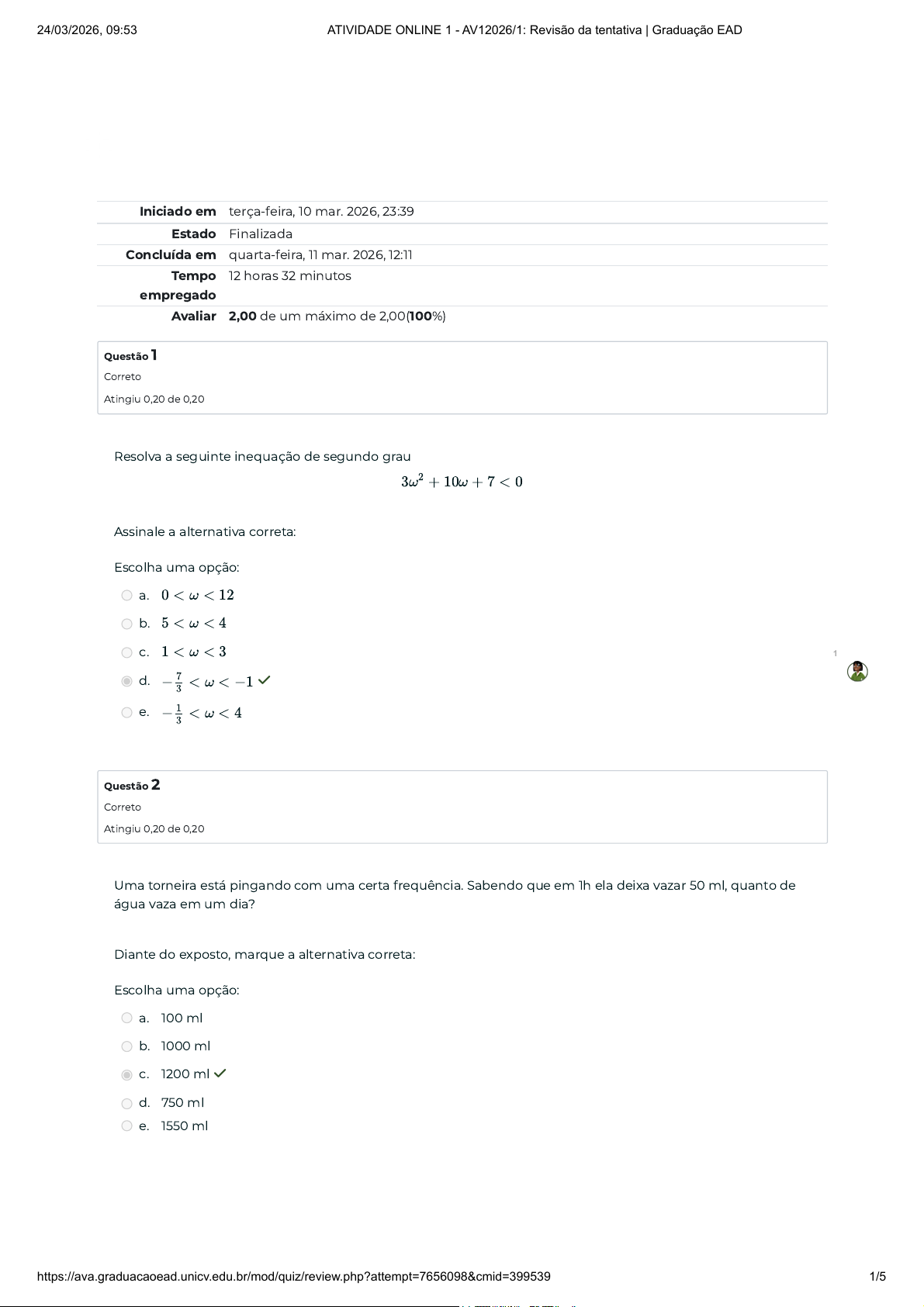 Iniciado em terça-feira, 10 mar. 2026, 23:39 Estado Finalizada Concluída em quarta-feira, 11 mar. 2026, 12:11 Tempo empregado 12 horas 32 minutos Avaliar 2,00 de um máximo de 2,00(100%) Questão 1 Correto Atingiu 0,20 de 0,20 Questão 2 Correto Atingiu 0,20 de 0,20 Resolva a seguinte inequação de segundo grau Assinale a alternativa correta: Escolha uma opção: a. b. c. d. ✓ e. 3 + 10ω + 7