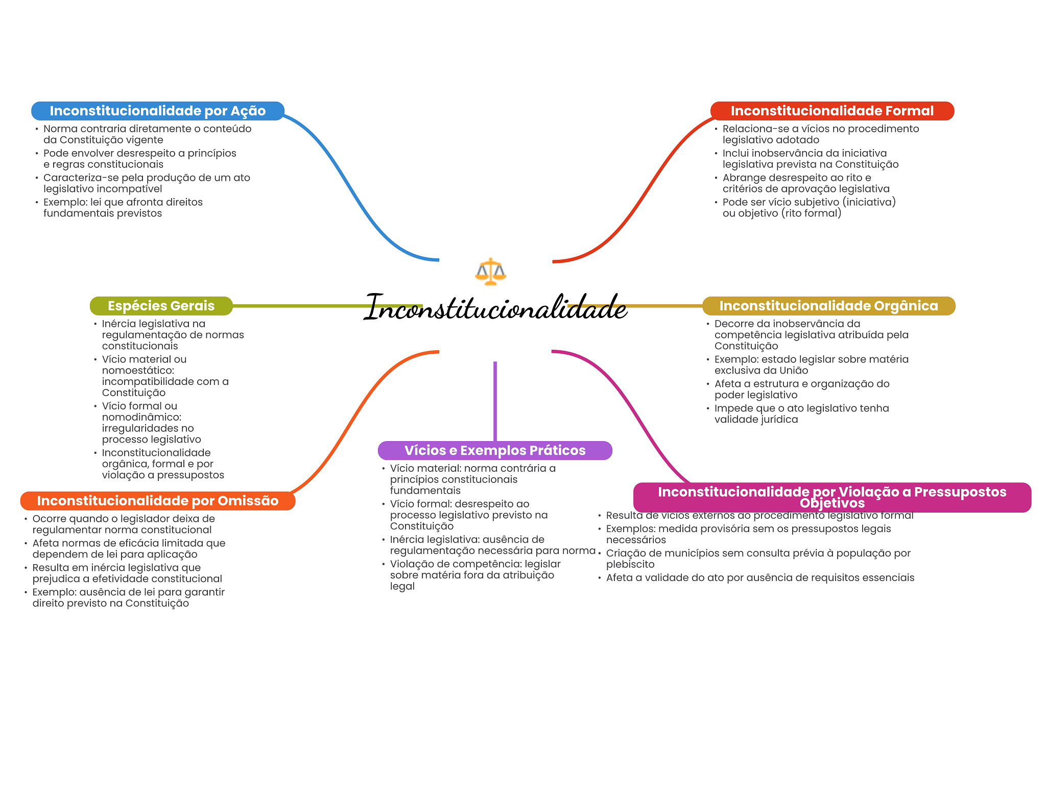 Inconstitucionalidade por Ação Inconstitucionalidade Formal Norma contraria diretamente conteúdo Relaciona-se a vícios no procedimento da Constituição vigente legislativo adotado Pode envolver desrespeito a princípios Inclui inobservância da iniciativa e regras constitucionais legislativa prevista na Constituição Caracteriza-se pela produção de um ato Abrange desrespeito ao rito e legislativo incompatível critérios de aprovação legislativa Exemplo: lei que afronta direitos Pode ser vício subjetivo (iniciativa) fundamentais previstos ou objetivo (rito formal) Espécies Gerais Inconstitucionalidade Orgânica Inércia legislativa na Decorre da inobservância da regulamentação de normas competência legislativa atribuída pela constitucionais Constituição Vício material ou Exemplo: estado legislar sobre matéria nomoestático: exclusiva da União incompatibilidade com a Afeta a estrutura e organização do Constituição poder legislativo Vício formal ou Impede que O ato legislativo tenha nomodinâmico: validade jurídica irregularidades no processo legislativo Inconstitucionalidade Vícios e Exemplos Práticos orgânica, formal e por Vício material: norma contrária a violação a pressupostos princípios constitucionais fundamentais Inconstitucionalidade por Violação a Pressupostos Inconstitucionalidade por Omissão Vício formal: desrespeito ao Objetivos Ocorre quando legislador deixa de processo legislativo previsto na Resulta de VICIOS externos ao procedimento legislativo formal regulamentar norma constitucional Constituição Exemplos: medida provisória sem pressupostos legais Afeta normas de eficácia limitada que Inércia legislativa: ausência de necessários dependem de lei para aplicação regulamentação necessária para norma Criação de municípios sem consulta prévia à população por Resulta em inércia legislativa que Violação de competência: legislar plebiscito prejudica a efetividade constitucional sobre matéria fora da atribuição Afeta a validade do ato por ausência de requisitos essenciais Exemplo: ausência de lei para garantir legal direito previsto na Constituição