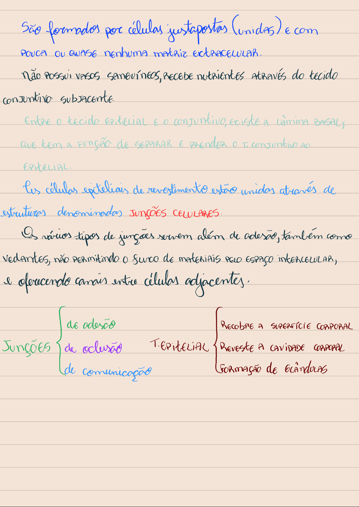 São formados por células justapostas E com POUCA ou QUASE não VASOS RECEBE nutrientes AtRAVÉS do tecido tecido E 0 conjuntivo, A BASAL, QUE tem A de SEPARAR E PREndER T. AO células epiteliais de revestimento unidas através de estruturas denominadas CELULARES. vários tipos de servem além de adesão, também como PERmitindo de PELO ESPAÇO l oferecendo canais adjacentes. de adesão A SUPERFÍCIE CORPORAL Jungões de oclusão A CORPORAL de comunicação deTipos DE de CÉLULA DUAS de células. PARECE de UMA PORQUE AS CELULAS tamanhos E nA