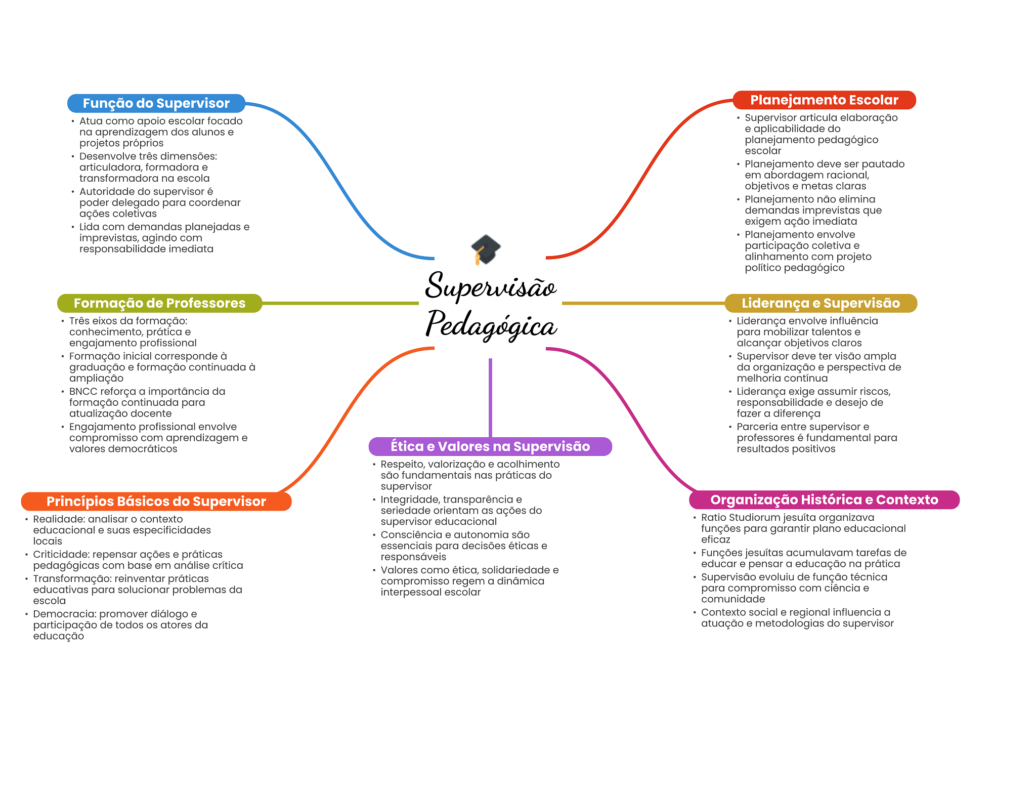 Função do Supervisor Planejamento Escolar Atua como apoio escolar focado Supervisor articula elaboração na aprendizagem dos alunos e e aplicabilidade do projetos próprios planejamento pedagógico escolar Desenvolve três dimensões: articuladora, formadora e Planejamento deve ser pautado transformadora na escola em abordagem racional, Autoridade do supervisor é objetivos e metas claras poder delegado para coordenar Planejamento não elimina ações coletivas demandas imprevistas que Lida com demandas planejadas e exigem ação imediata imprevistas, agindo com Planejamento envolve responsabilidade imediata participação coletiva e alinhamento com projeto político pedagógico Supervisão Formação de Professores Liderança e Supervisão Três eixos da formação: Pedagógica Liderança envolve influência conhecimento, prática e para mobilizar talentos e engajamento profissional alcançar objetivos claros Formação inicial corresponde à Supervisor deve ter visão ampla graduação e formação continuada à da organização e perspectiva de ampliação melhoria contínua BNCC reforça a importância da Liderança exige assumir riscos, formação continuada para responsabilidade e desejo de atualização docente fazer a diferença Engajamento profissional envolve Parceria entre supervisor e compromisso com aprendizagem e professores é fundamental para valores democráticos Ética e Valores na Supervisão resultados positivos Respeito, valorização e acolhimento são fundamentais nas práticas do supervisor Princípios Básicos do Supervisor Integridade, transparência e Organização Histórica e Contexto seriedade orientam as ações do Realidade: analisar contexto supervisor educacional Ratio Studiorum jesuíta organizava educacional e suas especificidades Consciência e autonomia são funções para garantir plano educacional locais eficaz essenciais para decisões éticas e Criticidade: repensar ações e práticas responsáveis Funções jesuítas acumulavam tarefas de pedagógicas com base em análise crítica Valores como ética, solidariedade e educar e pensar a educação na prática Transformação: reinventar práticas compromisso regem a dinâmica Supervisão evoluiu de função técnica educativas para solucionar problemas da interpessoal escolar para compromisso com ciência e escola comunidade Democracia: promover diálogo e Contexto social e regional influencia a participação de todos atores da atuação e metodologias do supervisor educação