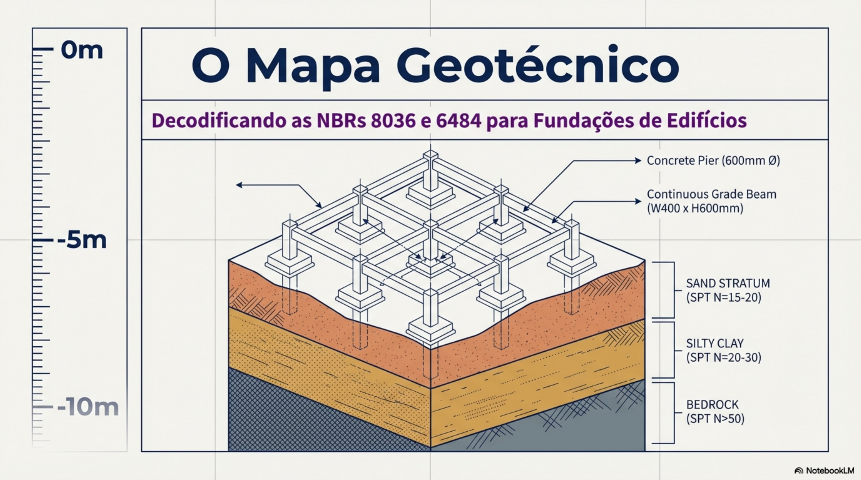 Om Geotécnico Decodificando as NBRs 8036 e 6484 para Fundações de Edifícios Concrete Pier (600mm 0) Continuous Grade Beam (W400 X H600mm) -5m SAND STRATUM (SPT N=15-20) SILTY CLAY (SPT N=20-30) -10m BEDROCK (SPT N>50) NotebookLMA Jornada da Investigação Para dominar as normas, não decore textos. Visualize 0 processo físico de uma sondagem Geotécnica de simples reconhecimento, desde a superfície até a entrega do relatório final. 0m -1m Fase 1: A Superfície (NBR 8036) Onde e quantos furos fazer? -2m (Planejamento e Locação) -3m -4m Fase 2: Subsolo (NBR 8036) Até onde cavar? (Bulbo de tensão -5m e Critérios de paralisação) -6m -7m Fase 3: Impacto (NBR 6484) Como testar o solo? -8m (A mecânica do ensaio SPT) -9m Fase 4: Resumo (Sintese) -10m Boletim de Sondagem final. -11m -0m NotebookLMCalculadora de Furos: Mínimo Absoluto vs. Relativo 0m Mínimo Absoluto (Áreas Pequenas) Mínimo Relativo (Áreas Maiores) -1m -2m -3m small area large area -4m Até 200 m²: Exige 2 furos. Até 1200 m²: 1 furo a cada 200 m². Entre 200 m² e 400 m²: Exige 3 furos. 1 furo a cada 400 m² De 1200 a 2400 m²: -6m (que exceder 1200 Fixado de acordo com Acima de 2400 m²: 0 plano particular. -7m Dica de Prova: 0 mínimo absoluto SEMPRE se sobrepõe. Uma planta de exige 3 furos, ignorando a regra de '1 a cada -8m NotebookLMRegras Espaciais de Locação Certo Errado (Quando houver mais de 3 furos) -1m -2m -3m -4m -5m Errado Certo (não devem ser distribuídas ao longo de um -6m mesmo alinhamento) Estudos de Viabilidade (Sem planta definida) -7m -8m -9m Maxima = Mínimo de 3 sondagens 10m 11m 12m NotebookLM-4m Limite de Profundidade: A Regra dos 10% -5m A sondagem deve continuar até que solo não seja mais significativamente solicitado pelas cargas -6m da estrutura. -7m -8m -9m -10m -11m -12m Critério de Parada: -13m Acréscimo de -14m pressão estrutural-15m Matriz de Critérios de Paralisação Antecipada -16m Solo de Alta Compacidade (4.1.2.6) Camada Impenetrável / Rocha (4.1.2.7) -17m -18m -19m -20m -21m -22m Regra: Geologia local mostra que NÃO há camadas mais Regra: solo acima já é adequado para suportar a macias abaixo? fundação? -23m Ação: Pode ser interrompida. PORÉM, para fundações de -24m alta importância ou se solo superior for fraco, é Ação: Pode-se parar a sondagem nesta camada. obrigatório investigar a continuidade da rocha por mínimo de 5 metros para dentro do material impenetrável. -25m NotebookLM-4m A Mecânica do Ensaio SPT (NBR 6484) -5m objetivo primordial do SPT é determinar Índice de -6m Resistência à Penetração (N) um valor numérico universal que dita a capacidade de carga do solo. -7m -8m 1.0 Martelo (Peso): -9m Bloco de ferro sólido com massa exata -10m de 65 kg. -11m -12m 2. A Queda: -13m Percurso de queda livre padronizado. -14m -16m -17m -19m Zona de Impacto 3.0 Amostrador-Padrão: 0 tubo bipartido na ponta inferior, -18m cravado no fundo do poço. -20m NotebookLM0m -0.5m A Sequência de 1 Metro -1.0m Fase 1: Perfuração Avanço do furo sem medição de 0 a 55 cm resistência. Prepara terreno para teste. -2,0m Fase 2: Percussão / Cravação -4,0m Cobre os exatos 45 cm finais do 55 cm a 100 cm metro. É aqui que os golpes do martelo de 65 kg são contados para determinar índice N. -5,0m NotebookLM-21m Decodificando Índice "N" Índice "N" é sempre a soma do número de golpes necessários -22m para cravar os últimos 30 cm do amostrador-padrão. Trecho 1 (0-15 cm) Trecho 2 (15-30 cm) Trecho 3 (30-45 cm) -23m 5 golpes 7 golpes + 9 golpes N=7+9=16 -24m Cravamento inicial. Descartado (ignora-se devido à perturbação do solo na limpeza do furo). -25m NotebookLM-26m A Anatomia do Boletim de Sondagem Boletim de Sondagem Projeto nunario: Data: / / Projeto: Data: Profundidade final -27m Projet de projeto: Local: determinada pelo Bulbo Projeto do material: de Tensão (30m Resumo Estratégico de Prova -31m -32m 400 100 m
