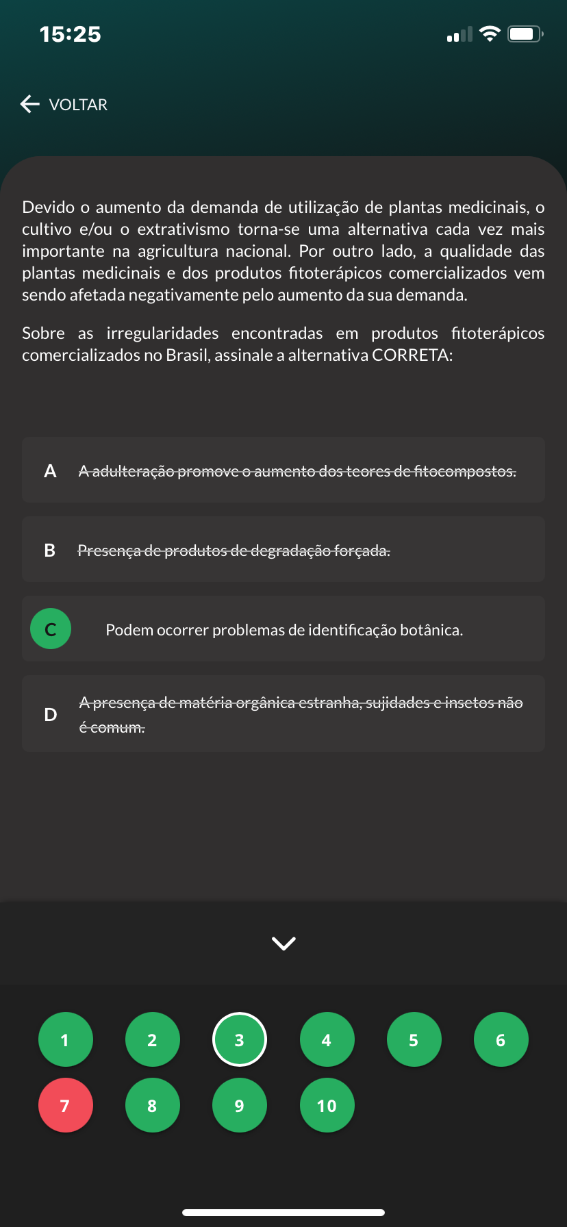 15:25 VOLTAR Devido o aumento da demanda de utilização de plantas medicinais, cultivo e/ou extrativismo torna-se uma alternativa cada vez mais importante na agricultura nacional. Por outro lado, a qualidade das plantas medicinais e dos produtos fitoterápicos comercializados vem sendo afetada negativamente pelo aumento da sua demanda. Sobre as irregularidades encontradas em produtos fitoterápicos comercializados no Brasil, assinale a alternativa CORRETA: A A adulteração promove aumento dos teores de fitocompostos. Presença de produtos de degradação forçada. Podem ocorrer problemas de identificação botânica. A presença de matéria orgânica estranha, sujidades e insetos não D é comum. 1 2 3 4 5 6 7 8 9 10