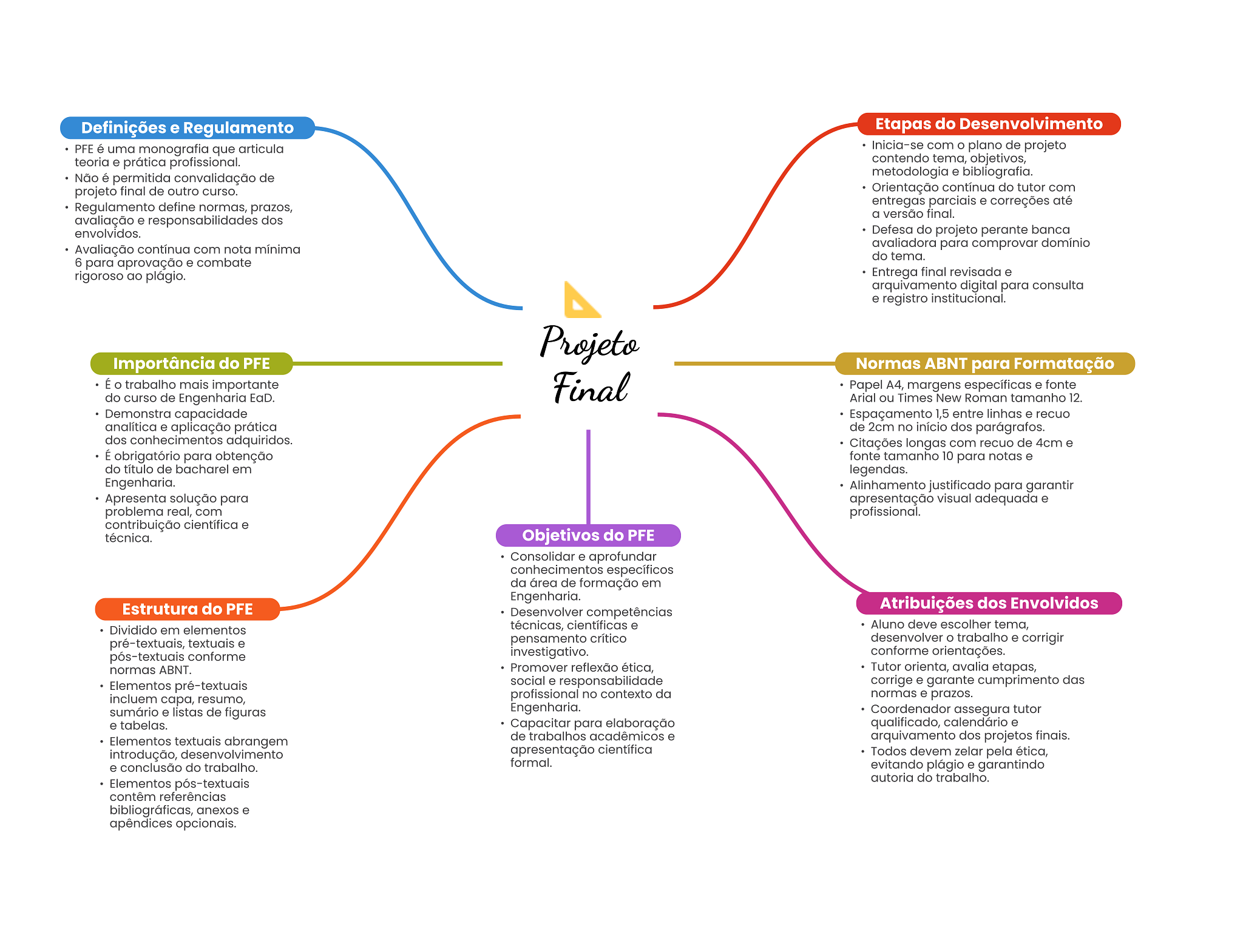 Definições e Regulamento Etapas do Desenvolvimento PFE é uma monografia que articula Inicia-se com plano de projeto teoria e prática profissional. contendo tema, objetivos, Não é permitida convalidação de metodologia e bibliografia. projeto final de outro curso. Orientação contínua do tutor com Regulamento define normas, prazos, entregas parciais e correções até a versão final. avaliação e responsabilidades dos envolvidos. Defesa do projeto perante banca Avaliação contínua com nota mínima avaliadora para comprovar domínio do tema. 6 para aprovação e combate rigoroso ao plágio. Entrega final revisada e arquivamento digital para consulta e registro institucional. Projeto Importância do PFE Normas ABNT para Formatação É trabalho mais importante Final Papel A4, margens específicas e fonte do curso de Engenharia EaD. Arial ou Times New Roman tamanho 12. Demonstra capacidade Espaçamento 1,5 entre linhas e recuo analítica e aplicação prática de 2cm no início dos parágrafos. dos conhecimentos adquiridos. Citações longas com recuo de 4cm e É obrigatório para obtenção fonte tamanho 10 para notas e do título de bacharel em legendas. Engenharia. Alinhamento justificado para garantir Apresenta solução para apresentação visual adequada e problema real, com profissional. contribuição científica e técnica. Objetivos do PFE Consolidar e aprofundar conhecimentos específicos da área de formação em Engenharia. Estrutura do PFE Atribuições dos Envolvidos Desenvolver competências Dividido em elementos técnicas, científicas e Aluno deve escolher tema, pré-textuais, textuais e pensamento crítico desenvolver trabalho e corrigir pós-textuais conforme investigativo. conforme orientações. normas ABNT. Promover reflexão ética, Tutor orienta, avalia etapas, Elementos pré-textuais social e responsabilidade corrige e garante cumprimento das incluem capa, resumo, profissional no contexto da normas e prazos. sumário e listas de figuras Engenharia. Coordenador assegura tutor e tabelas. Capacitar para elaboração qualificado, calendário e Elementos textuais abrangem de trabalhos acadêmicos e arquivamento dos projetos finais. introdução, desenvolvimento apresentação científica Todos devem zelar pela ética, e conclusão do trabalho. formal. evitando plágio e garantindo autoria do trabalho. Elementos pós-textuais contêm referências bibliográficas, anexos e apêndices opcionais.