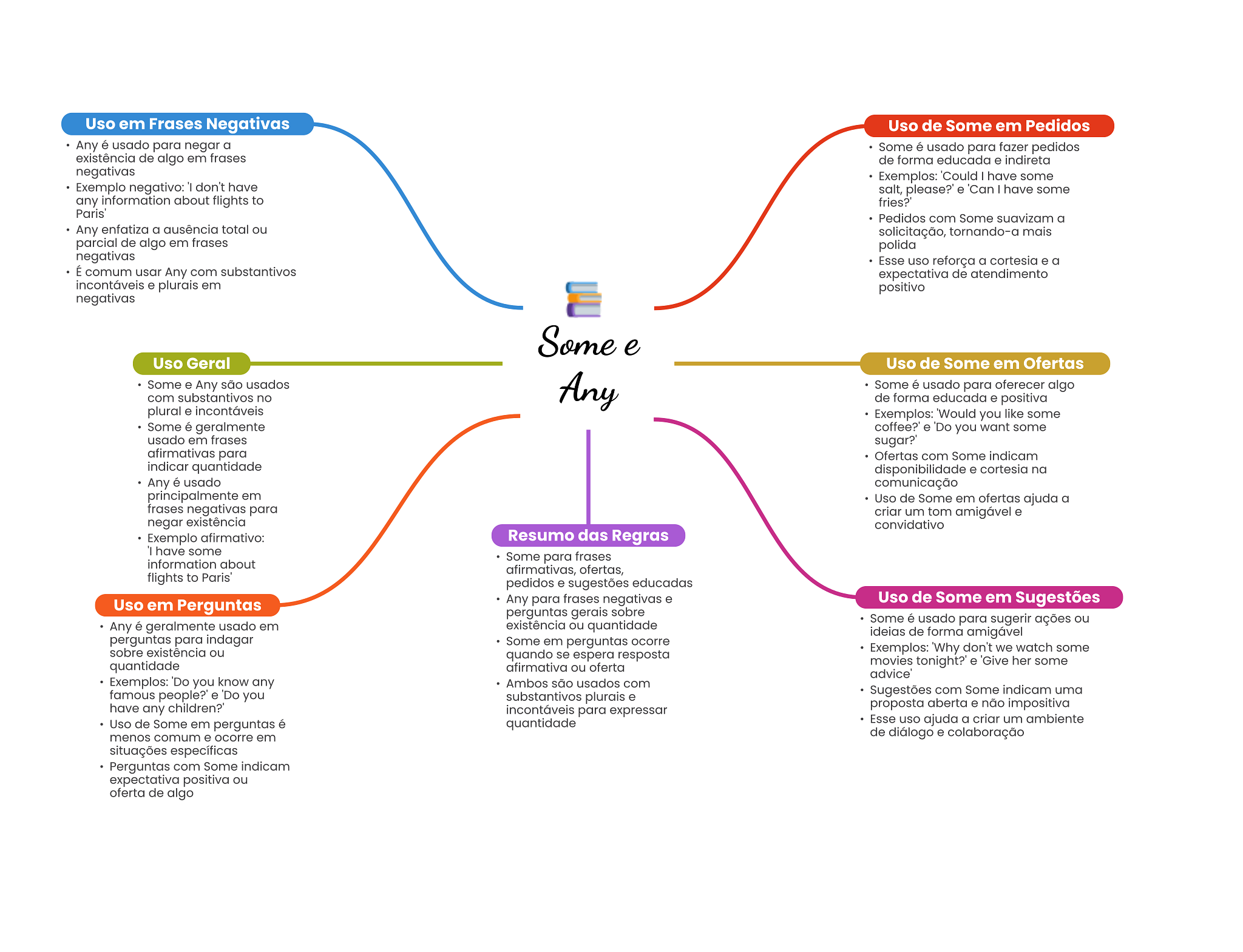 Uso em Frases Negativas Uso de Some em Pedidos Any é usado para negar a Some é usado para fazer pedidos existência de algo em frases de forma educada e indireta negativas Exemplos: Could have some Exemplo negativo: don't have salt, e Can I have some any information about flights to fries?' Paris' Pedidos com Some suavizam a Any enfatiza a ausência total ou solicitação, tornando-a mais parcial de algo em frases polida negativas Esse uso reforça a cortesia e a É comum usar Any com substantivos expectativa de atendimento incontáveis e plurais em positivo negativas Some e Uso Geral Uso de Some em Ofertas Some e Any são usados Any Some é usado para oferecer algo com substantivos no de forma educada e positiva plural e incontáveis Exemplos: you like some Some é geralmente coffee?' e 'Do you want some usado em frases sugar?' afirmativas para Ofertas com Some indicam indicar quantidade disponibilidade e cortesia na Any é usado comunicação principalmente em Uso de Some em ofertas ajuda a frases negativas para criar um tom amigável e negar existência convidativo Exemplo afirmativo: Resumo das Regras 'I have some Some para frases information about afirmativas, ofertas, flights to Paris' pedidos e sugestões educadas Uso em Perguntas Any para frases negativas e Uso de Some em Sugestões perguntas gerais sobre Any é geralmente usado em existência ou quantidade Some é usado para sugerir ações ou ideias de forma amigável perguntas para indagar Some em perguntas ocorre sobre existência ou quando se espera resposta Exemplos: don't we watch some quantidade afirmativa ou oferta movies tonight? e Give her some Exemplos: 'Do you know any Ambos são usados com famous people?' e 'Do you substantivos plurais e Sugestões com Some indicam uma have any incontáveis para expressar proposta aberta e não impositiva Uso de Some em perguntas é quantidade Esse uso ajuda a criar um ambiente menos comum e ocorre em de diálogo e colaboração situações específicas Perguntas com Some indicam expectativa positiva ou oferta de algo