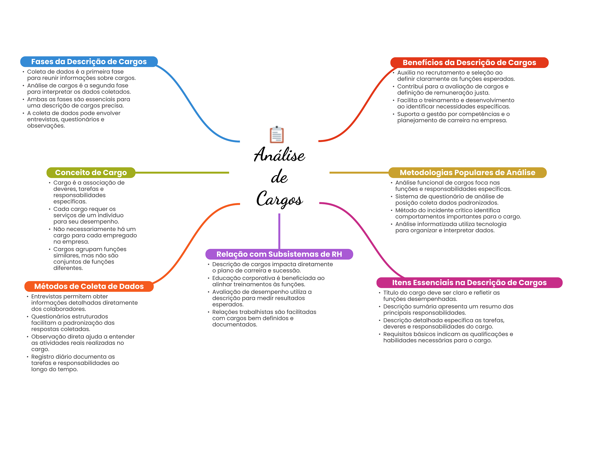 Fases da Descrição de Cargos Benefícios da Descrição de Cargos Coleta de dados é a primeira fase Auxilia no recrutamento e seleção ao para reunir informações sobre cargos. definir claramente as funções esperadas. Análise de cargos é a segunda fase Contribui para a avaliação de cargos e para interpretar dados coletados. definição de remuneração justa. Ambas as fases são essenciais para Facilita treinamento e desenvolvimento uma descrição de cargos precisa. ao identificar necessidades específicas. A coleta de dados pode envolver Suporta a gestão por competências e entrevistas, questionários e planejamento de carreira na empresa. observações. Análise Conceito de Cargo de Metodologias Populares de Análise Cargo é a associação de Análise funcional de cargos foca nas deveres, tarefas e funções e responsabilidades específicas. responsabilidades Cargos Sistema de questionário de análise de específicas. posição coleta dados padronizados. Cada cargo requer Método do incidente crítico identifica serviços de um indivíduo comportamentos importantes para cargo. para seu desempenho. Análise informatizada utiliza tecnologia Não necessariamente há um para organizar e interpretar dados. cargo para cada empregado na empresa. Cargos agrupam funções similares, mas não são Relação com Subsistemas de RH conjuntos de funções Descrição de cargos impacta diretamente diferentes. plano de carreira e sucessão. Educação corporativa é beneficiada ao Métodos de Coleta de Dados alinhar treinamentos às funções. Itens Essenciais na Descrição de Cargos Avaliação de desempenho utiliza a Título do cargo deve ser claro e refletir as Entrevistas permitem obter descrição para medir resultados funções desempenhadas. informações detalhadas diretamente esperados. dos colaboradores. Descrição sumária apresenta um resumo das Relações trabalhistas são facilitadas principais responsabilidades. Questionários estruturados com cargos bem definidos e facilitam a padronização das Descrição detalhada especifica as tarefas, documentados. respostas coletadas. deveres e responsabilidades do cargo. Observação direta ajuda a entender Requisitos básicos indicam as qualificações e as atividades reais realizadas no habilidades necessárias para cargo. cargo. Registro diário documenta as tarefas e responsabilidades ao longo do tempo.