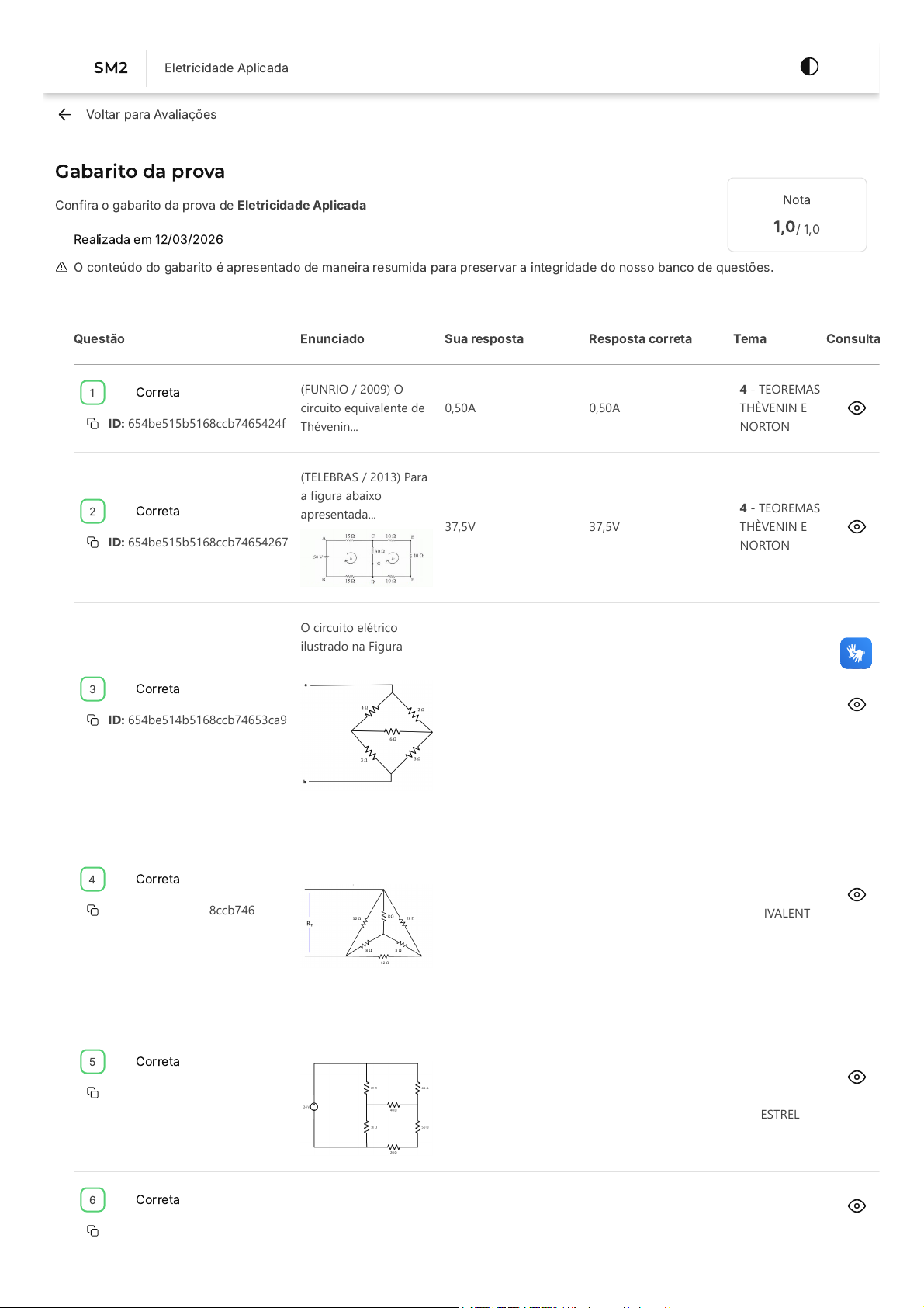 12/03/26, 00:01 estacio.saladeavaliacoes.com.br/prova/69b22ad79f7b4807d0624b13/gabarito/reduzido/ https://estacio.saladeavaliacoes.com.br/prova/69b22ad79f7b4807d0624b13/gabarito/reduzido/ 1/2 Voltar para Avaliações Gabarito da prova Confira o gabarito da prova de Eletricidade Aplicada Realizada em 12/03/2026 Nota 1,0/ 1,0 O conteúdo do gabarito é apresentado de maneira resumida para preservar a integridade do nosso banco de questões. Questão Enunciado Sua resposta Resposta correta Tema Consulta Correta ID: 654be515b5168ccb7465424f (FUNRIO / 2009) O circuito equivalente de Thévenin... 0,50A 0,50A 4 - TEOREMAS THÈVENIN E NORTON Correta ID: 654be515b5168ccb74654267 (TELEBRAS / 2013) Para a figura abaixo apresentada... 37,5V 37,5V 4 - TEOREMAS THÈVENIN E NORTON Correta ID: 654be514b5168ccb74653ca9 O circuito elétrico ilustrado na Figura 54 está li... \(2,89 Ω\) \(2,89 Ω\) 5 - TEOREMA DA SUPERPOSIÇÃO E CIRCUITOS EQUIVALENTES EM ESTRELA E TRIÂNGULO Correta ID: 654be514b5168ccb74653cc7 O circuito ilustrado na Figura 56 está ligado na c... \(10,66 Ω\) \(10,66 Ω\) 5 - TEOREMA DA SUPERPOSIÇÃO E CIRCUITOS EQUIVALENTES EM ESTRELA E TRIÂNGULO Correta ID: 654be514b5168ccb74653cb5 O circuito ilustrado na Figura 49 apresenta arranj... 997,4 mA 997,4 mA 5 - TEOREMA DA SUPERPOSIÇÃO E CIRCUITOS EQUIVALENTES EM ESTRELA E TRIÂNGULO Correta ID: 654be514b5168ccb74653c9d Com base nas equações de transformação entre circu... 36,25 Ω 36,25 Ω 5 - TEOREMA DA SUPERPOSIÇÃO E CIRCUITOS 1 2 3 4 5 6 SM2 Eletricidade Aplicada https://estacio.saladeavaliacoes.com.br/avaliacoes/ 12/03/26, 00:01 estacio.saladeavaliacoes.com.br/prova/69b22ad79f7b4807d0624b13/gabarito/reduzido/ https://estacio.saladeavaliacoes.com.br/prova/69b22ad79f7b4807d0624b13/gabarito/reduzido/ 2/2 EQUIVALENTES EM ESTRELA E TRIÂNGULO Correta ID: 654be515b5168ccb74654207 (UDESC / 2019) Analise as proposições considerando... Somente as afirmativas II e IV são verdadeiras. Somente as afirmativas II e IV são verdadeiras. 4 - TEOREMAS THÈVENIN E NORTON Correta ID: 65b12ccfeccdbbbddeb14dde (TSE / 2012) Observe a citação a seguir. ... Norton Norton 4 - TEOREMAS THÈVENIN E NORTON Correta ID: 654be515b5168ccb74654243 (Fundação Getulio Vargas - FGV - 2013 - MPE/MS) A ... uma fonte de 3A e um resistor em paralelo de 12Ω. ... uma fonte de 3A e um resistor em paralelo de 12Ω. ... 4 - TEOREMAS THÈVENIN E NORTON Correta ID: 6855519db4acf00ffe6fa234 Considere o circuito linear genérico ilustr... x = 24V, y = 1V, z = -6V x = 24V, y = 1V, z = -6V 5 - TEOREMA DA SUPERPOSIÇÃO E CIRCUITOS EQUIVALENTES EM ESTRELA E TRIÂNGULO 7 8 9 10 Encontrou algum problema? Você pode copiar o ID da questão e abrir um requerimento. Na tela inicial do Campus Virtual �SIA�, acesse "Atendimento > Requerimento > Novo > Currículo/Aula/horário > Analisar ambiente de avaliação/exercícios"