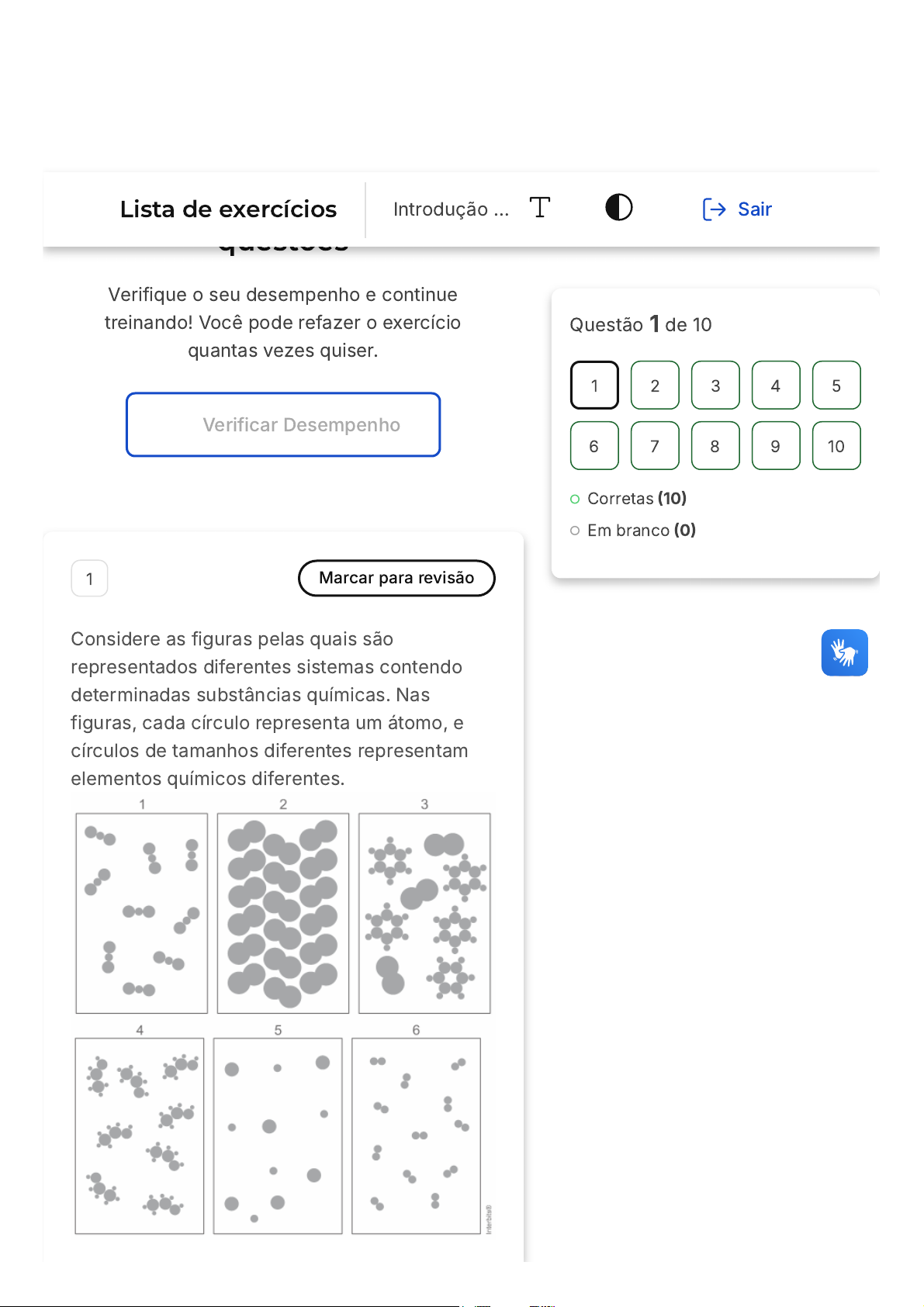 25/02/26, 15:06 estacio.saladeavaliacoes.com.br/exercicio/699f39865dc6e19bb98cec24/gabarito/ https://estacio.saladeavaliacoes.com.br/exercicio/699f39865dc6e19bb98cec24/gabarito/ 1/13 Você acertou 10 de 10 questões Verifique o seu desempenho e continue treinando! Você pode refazer o exercício quantas vezes quiser. Verificar Desempenho 1 Marcar para revisão Considere as figuras pelas quais são representados diferentes sistemas contendo determinadas substâncias químicas. Nas figuras, cada círculo representa um átomo, e círculos de tamanhos diferentes representam elementos químicos diferentes. Questão 1 de 10 Corretas �10� Em branco �0� 1 2 3 4 5 6 7 8 9 10 Lista de exercícios Introdução … Sair 25/02/26, 15:06 estacio.saladeavaliacoes.com.br/exercicio/699f39865dc6e19bb98cec24/gabarito/ https://estacio.saladeavaliacoes.com.br/exercicio/699f39865dc6e19bb98cec24/gabarito/ 2/13 A B C D E A respeito dessas representações, é correto afirmar que os sistemas: 3, 4 e 5 representam misturas. 1, 2 e 5 representam substâncias puras. 2 e 5 representam, respectivamente, uma substância molecular e uma mistura de gases nobres. 6 e 4 representam, representam, respectivamente, uma substância molecular gasosa e uma substância simples. 1 e 5 representam substâncias simples puras. Resposta correta Parabéns, você selecionou a alternativa correta. Confira o gabarito comentado! Gabarito Comentado 1 - conjuntos de átomos distintos (substância composta), formando o mesmo elemento qúimico. 2 - mesmo conjunto de átomos, mesmo elemento qúimico. 3 - elementos químicos diferentes. 4 - conjuntos de átomos distintos (substância composta), formando o mesmo elemento qúimico. 5 - elementos químicos diferentes. 25/02/26, 15:06 estacio.saladeavaliacoes.com.br/exercicio/699f39865dc6e19bb98cec24/gabarito/ https://estacio.saladeavaliacoes.com.br/exercicio/699f39865dc6e19bb98cec24/gabarito/ 3/13 A B C D E 6 - mesmo conjunto de átomos, mesmo elemento qúimico. 2 Marcar para revisão Consideram-se arte rupestre as representações feitas sobre rochas pelo homem da pré-história, em que se incluem gravuras e pinturas. Acredita-se que essas pinturas, em que os materiais mais usados são sangue, saliva, argila e excrementos de morcegos (cujo habitat natural são as cavernas), têm cunho ritualístico. (www.portaldarte.com.br. Adaptado.) Todos os materiais utilizados para as pinturas, citados no texto, são: substâncias compostas puras. de origem animal. misturas de substâncias compostas. de origem vegetal. misturas de substâncias simples. 25/02/26, 15:06 estacio.saladeavaliacoes.com.br/exercicio/699f39865dc6e19bb98cec24/gabarito/ https://estacio.saladeavaliacoes.com.br/exercicio/699f39865dc6e19bb98cec24/gabarito/ 4/13 A B C D E Resposta correta Parabéns, você selecionou a alternativa correta. Confira o gabarito comentado! Gabarito Comentado Resposta correta: misturas de substâncias compostas. 3 Marcar para revisão Considere a frase a seguir, de Leucipo de Mileto, 450 a.C.: "Uma pedra pode ser partida em pedaços cada vez mais pequenos, pode ser pulverizada mais e mais, e cada pedaço dela, ou cada partícula de pó, segue sendo igual à matéria original". O autor da frase estava se referindo: à natureza da matéria ao modelo atômico à indivisibilidade da matéria à molécula elementar ao componente fundamental Resposta correta 25/02/26, 15:06 estacio.saladeavaliacoes.com.br/exercicio/699f39865dc6e19bb98cec24/gabarito/ https://estacio.saladeavaliacoes.com.br/exercicio/699f39865dc6e19bb98cec24/gabarito/ 5/13 A B C D E Parabéns, você selecionou a alternativa correta. Confira o gabarito comentado! Gabarito Comentado Resposta correta: à natureza da matéria 4 Marcar para revisão A utilização de pele de peixes para a confecção de tecidos para combater os efeitos danosos de queimaduras é um exemplo da aplicação da biologia sintética. Biologia sintética Nanotecnologia Manufatura aditiva Síntese direta Impressões em 3D Resposta correta Parabéns, você selecionou a alternativa correta. Confira o gabarito comentado! Gabarito Comentado 25/02/26, 15:06 estacio.saladeavaliacoes.com.br/exercicio/699f39865dc6e19bb98cec24/gabarito/ https://estacio.saladeavaliacoes.com.br/exercicio/699f39865dc6e19bb98cec24/gabarito/ 6/13 A B C A biologia sintética é uma área da ciência que visa a criação de novos organismos vivos ou partes deles, a partir de componentes sintéticos. A utilização de pele de peixes para a confecção de tecidos para combater os efeitos danosos de queimaduras é um exemplo da aplicação da biologia sintética, pois envolve a criação de um novo tecido a partir de componentes sintéticos. 5 Marcar para revisão Materiais extraídos diretamente da natureza foram a base de utilização por povos primitivos em manufaturas. Com relação a essa prática, representa(m) grande avanço: A agricultura familiar, que gerou produtos mais avançados para a indústria As eras dos metais, que permitiram a manipulação dos produtos extraídos na forma de minérios O advento da máquina a vapor de produção em escala 25/02/26, 15:06 estacio.saladeavaliacoes.com.br/exercicio/699f39865dc6e19bb98cec24/gabarito/ https://estacio.saladeavaliacoes.com.br/exercicio/699f39865dc6e19bb98cec24/gabarito/ 7/13 D E A descoberta de novas áreas de extração mineral ao redor do globo, que diminuiu a produção de artefatos industriais A prática da alquimia, que gerou grande avanço científico, como os modelos atômicos Resposta correta Parabéns, você selecionou a alternativa correta. Confira o gabarito comentado! Gabarito Comentado A alternativa correta é a que menciona "as eras dos metais, que permitiram a manipulação dos produtos extraídos na forma de minérios". Isso representa um grande avanço porque, durante as eras dos metais �Cobre, Bronze e Ferro), a humanidade aprendeu a manipular minérios para criar ferramentas, armas e outros objetos. Essa habilidade marcou um gran