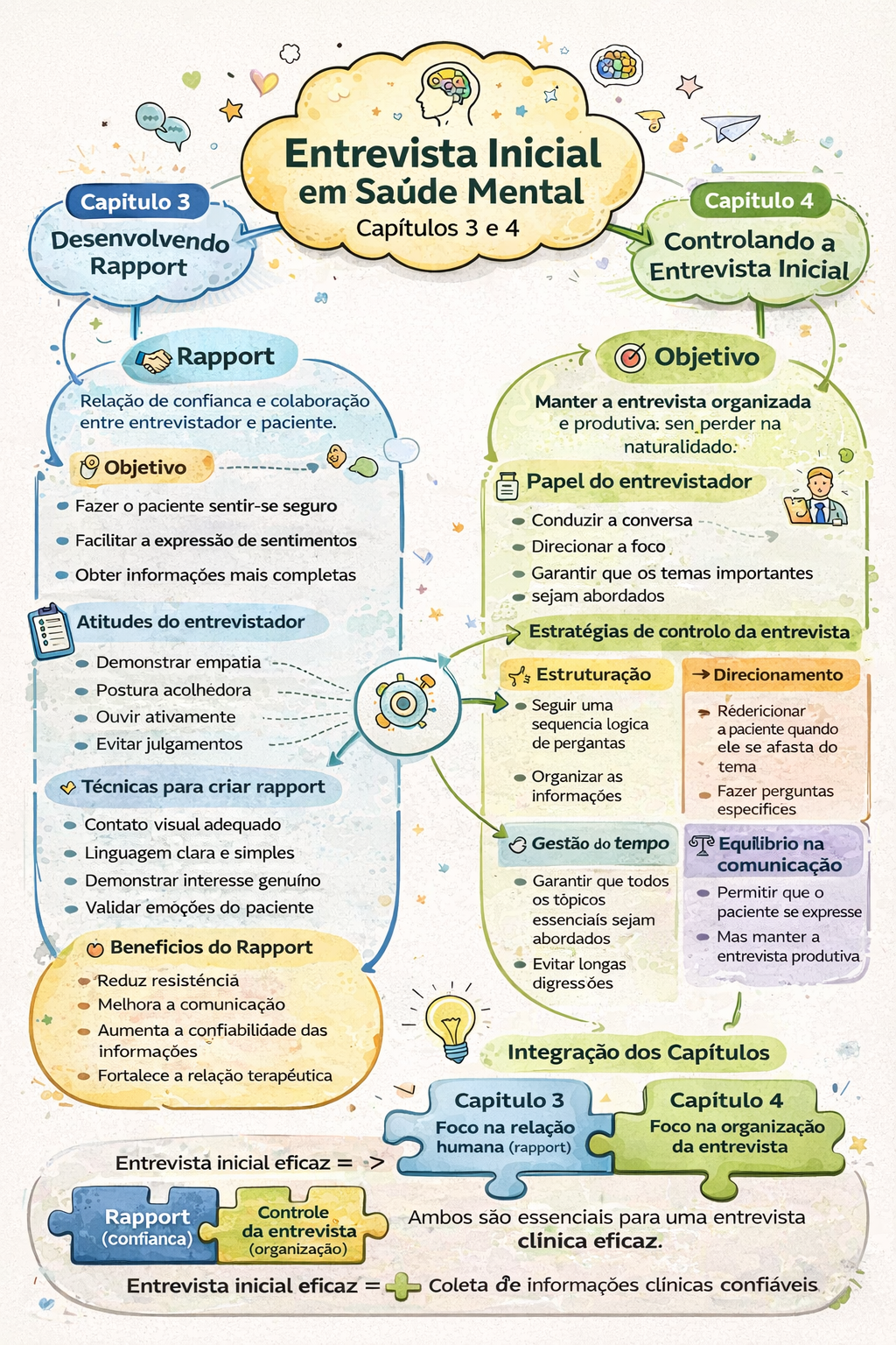 Entrevista Inicial Capitulo 3 em Saúde Mental Capitulo 4 Desenvolvendo Capítulos 3 e 4 Controlando a Rapport Entrevista Inicial Rapport Objetivo Relação de confianca e colaboração Manter a entrevista organizada entre entrevistador e paciente. e produtiva: sen perder na Objetivo Papel do entrevistador Fazer paciente sentir-se seguro Conduzir a conversa Facilitar a expressão de sentimentos Direcionar a foco Obter informações mais completas Garantir que temas importantes sejam abordados Atitudes do entrevistador Estratégias de controlo da entrevista Demonstrar empatia Estruturação Direcionamento Postura acolhedora Seguir uma Ouvir ativamente Rédericionar sequencia logica a paciente quando Evitar julgamentos de pergantas ele se afasta do tema Organizar as Técnicas para criar rapport informações Fazer perguntas especifices Contato visual adequado Gestão do tempo Equilibrio na Linguagem clara e simples comunicação Demonstrar interesse genuíno Garantir que todos Permitir que Validar emoções do paciente essenciaís sejam paciente se expresse abordados Mas manter a Beneficios do Rapport Evitar longas entrevista produtiva Reduz resisténcia digressões Melhora a comunicação Aumenta a confiabilidade das informações Integração dos Capítulos Fortalece a relação terapéutica Capitulo 3 Capítulo 4 Foco na relação Foco na organização humana (rapport) da entrevista Entrevista inicial eficaz = Rapport Controle Ambos são essenciais para uma entrevista (confianca) da entrevista eficaz. (organização) Entrevista inicial eficaz = Coleta de informações clínicas confiáveis