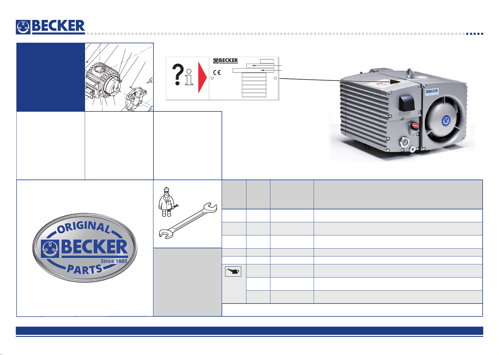 Ersatzteilliste Spare parts list Liste de pièces de rechange Listino pezzi di ricambio Lista de piezas de recambio Lista de peças sobresselentes Reserveonderdelenlijst Atsarginių dalių sąrašas Varuosad nimekirja Rezerves daļu saraksts SERVICE M a d e i n G e rm a n y year No min -1 kW m /h3 mbar mbar type speed power required inlet capacity vacuum pressure + - Hzfrequencyfrequency D-42279 Wuppertal www.becker-international.com XXXX XXXX XXXX XXXX XXXX Index Variante XXXX XXXX Wartung Maintenance Entretien Manutenzione Mantenimiento 1 Reservedelsliste Reservdelslista Varaosaluettelo Reservedelsliste Wykaz części zamiennych Tartalékalkatrész lista Seznam náhradních dílů Seznam nadomestnih delov Zoznam náhradných dielov Rezervni dijelovi popis Lista pieselor de schimb Páirteanna spártha liosta Κατάλογος ανταλλακτικών Yedek parça listesi Списък на резервните части Перечень запасных частей スペアパーツリスト 예비 부품 목록 备用零件目录 28 00 00 54 20 0 0 2/ 20 17 Index - A U 5.100 AXXXXXXX U 5.100-XX 601 607 603 604 310 301 631 515 500 113 114 950 282281 102 621 109 117 101 103 110 550 570 225 258 252 251 240 241 270 262 263 222 221 224 201 208 215 214 213 303 321 750 (750) 320 903 401 906 322 212 209 523 940 110 116 205 104 105 541 104 207 210 211 105 (576) 233 214 222 262 263 103322 225 224 (108) 302 516 515 115 280 281 105 111 207 241 242 215 216 402 110 113 114 111 117 201 240.1 531 532 560 560.1 605 606 602 535 261 701 403 304 223 231 232 230230.1 264 230.2 290 291 Pos. Menge Quantity Quantité Quantità Cantidad Bestell-Nr. Ident No. No. Identification No. Identificazione No. de pedido Bezeichnung Description Designation Designazione Descripcion K1 1 566500 54200 Wartungssatz, Maintenance kit, Kit de maintenance, Kit di manutenzione, Kit de manteniniento K2 1 549000 54200 Dichtungssatz, Complete set of seals, Jeu de joints complet, Kit di guarnizioni completo, Kit de juntas completo K3 1 566100 54200 Ölschauglassatz, Oil sight glass kit, Ensemble de voyant d‘huile, Kit di spia livello olio, Kit de mirilla de aceite K4 1 566300 54200 Reparatursatz, Repair kit, Kit de réparation, Kit di riparazione, Kit de reparación K5 1 966900 54200 Schraubensatz, Screw kit, Kit de visserie, Kit di viti, Kit de tornillo 1) 1 l 5 l 960009 00000 960009 00200 BECKER LUBE M 100 (Mineralöl, mineral oil, huile minérale, olio minerale, aceite mineral) 1 l 5 l 960016 00100 960016 00200 BECKER LUBE S 100 (Synthetiköl, synthetic oil, l‘huile synthétique, olio sintetico, aceite sintético) 1 l 5 l 960023 00100 960023 00200 BECKER LUBE SL 100 (Lebensmittelbereich, food sector, secteur de l‘alimentation, settore alimentare, sector alimentario) 1) Füllmenge / filling capacity / capacité de remplissage / capacità di riempimento / capacidad de llenado U 5.100 = 2 l (max.) www.becker-international.comWWW.BECKER-INTERNATIONAL.COM www.becker-international.com SE R VI C E B H A D A A u ø a ø d h A H Standard www.becker-international.comWWW.BECKER-INTERNATIONAL.COM 601 607 603 604 310 301 631 515 500 113 114 950 282281 102 621 109 117 101 103 110 550 570 225 258 252 251 240 241 270 262 263 222 221 224 201 208 215 214 213 303 321 750 (750) 320 903 401 906 322 212 209 523 940 110 116 205 104 105 541 104 207 210 211 105 (576) 233 214 222 262 263 103322 225 224 (108) 302 516 515 115 280 281 105 111 207 241 242 215 216 402 110 113 114 111 117 201 240.1 531 532 560 560.1 605 606 602 535 261 701 403 304 223 231 232 230230.1 264 230.2 290 291 Index - A U 5.100 2 A Pos. U 5 .1 00 K1 566500 54200 K2 549000 54200 K3 566100 54200 K4 566300 54200 K5 966900 54200 101 000100 54200 102 020000 54200 103 K4 (900510 00003) 104 K2, K4 105 K2, K4 108 K4 109 K2, K4 110 948742 00000 111 K5 113 029100 54200 114 033900 54200 115 K5 116 K2, K4 117 947732 00000 201 002400 54200 205 K2, K4 207 K2, K4 208 001700 54200 209 064800 54200 210 K2, K4 211 K2, K4 212 936352 00000 213 012200 54200 214 K1, K4 215 K5 216 K5 221 034103 99628 222 K1, K4 223 921500 50000 224 K4 225 K4 230 002500 54200 230.1 002501 54200 230.2 002502 54200 231 K5 232 K5 233 K1, K2, K4 240 003700 54200 240.1 503700 54200 241 K5 242 K5 251 034100 99559 252 567803 99559 258 003300 54200 261 K3, K4 262 K3, K4 263 K3, K4 264 951221 00100 270 034900 54200 280 K5 281 K5 282 947105 00000 290 741107 99682 A Pos. 291 743421 04000 301 053200 54200 302 K5 303 947628 01000 304 K5 310 502300 54200 320 016801 54200 321 901809 00000 322 K4 (902200 54200) 401 014900 54200 402 K5 403 K5 500 537501 54200 515 K5 516 K5 523 960200 54200 531 K2, K4 532 012219 26200 535 009400 19000 541 K2, K4 550 012203 54200 560 548400 54200 560.1 548401 54200 570 768750 99626 576 K1, K4 601 018301 54200 602 020800 54200 603 K5 604 K5 605 K5 606 K5 607 067100 54200 621 741310 60000 631 948802 00000 701 916801 99691 750 543403 00000 903 945331 00000 906 902100 54100 940 500800 54200 950 500700 54200 1100 - Pos.: 20, 24, 62, 75, 76, 85, 86, 104, 125, 126, 127, 146, 288 2) quantité nécessaire / entretien www.becker-international.comWWW.BECKER-INTERNATIONAL.COM 3 INDEX Bestell Nr. Beschreibung WARTUNGSATZ 1) DICHTUNGSSATZ 2) ÖLSCHAUGLASSATZ 3) REPARATURSATZ 4) SCHRAUBENSATZ 5) GEHÄUSE KOLBEN SCHIEBERSATZ O-RING O-RING GLEITLAGER WELLENDICHTRING PASSKERBSTIFT INNENSECHSKANTSCHRAUBE - M8X25 VENTILFÄNGER VENTILPLATTE INNENSECHSKANTSCHRAUBE - M6X10 O-RING PASSFEDER ÖLBEHÄLTER O-RING DICHTUNG ÖLBEHÄLTERDECKEL HINTEN ADAPTER O-RING SCHEIBE GERADE SCHOTTVERSCHRAUBUNG LEITUNG INTERN ÖLFILTER SCHEIBE INNENSECHSKANTSCHRAUBE - M6X50 ANKERSCHRAUBE LUFTENTÖLELEMENT HANDGRIFF GROBABSCHEIDER FILTERBLECH SERVICE-DECKEL (STANDARD) SERVICE-DECKEL (VARIANTE 1) SERVICE-DECKEL (VARIANTE 2) SCHEIBE INNENSECHSKANTSCHRAUBE - M6X50 DICHTUNG WARTUNGSDECKEL (STANDARD) WARTUNGSDECKEL (MIT ABLUFTANSCHLUSS UND VENTIL) SCHEIBE INNENSECHSKANTSCHRAUBE M6X65 GELENKBOLZEN SCHWIMMER DÜSE SCHRAUBDECKEL ÖLSCHAUGLAS MIT DICHT