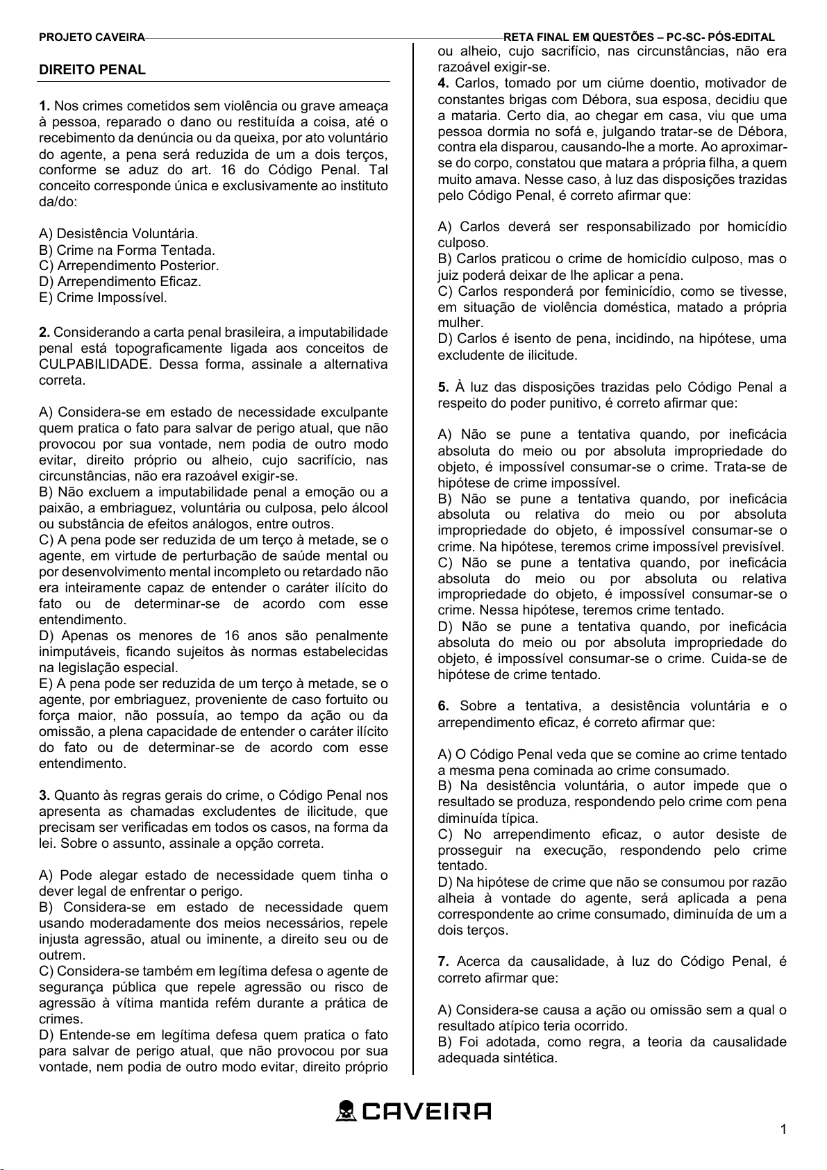 PROJETO CAVEIRA RETA FINAL EM QUESTÕES – PC-SC- PÓS-EDITAL 1 DIREITO PENAL 1. Nos crimes cometidos sem violência ou grave ameaça à pessoa, reparado o dano ou restituída a coisa, até o recebimento da denúncia ou da queixa, por ato voluntário do agente, a pena será reduzida de um a dois terços, conforme se aduz do art. 16 do Código Penal. Tal conceito corresponde única e exclusivamente ao instituto da/do: A) Desistência Voluntária. B) Crime na Forma Tentada. C) Arrependimento Posterior. D) Arrependimento Eficaz. E) Crime Impossível. 2. Considerando a carta penal brasileira, a imputabilidade penal está topograficamente ligada aos conceitos de CULPABILIDADE. Dessa forma, assinale a alternativa correta. A) Considera-se em estado de necessidade exculpante quem pratica o fato para salvar de perigo atual, que não provocou por sua vontade, nem podia de outro modo evitar, direito próprio ou alheio, cujo sacrifício, nas circunstâncias, não era razoável exigir-se. B) Não excluem a imputabilidade penal a emoção ou a paixão, a embriaguez, voluntária ou culposa, pelo álcool ou substância de efeitos análogos, entre outros. C) A pena pode ser reduzida de um terço à metade, se o agente, em virtude de perturbação de saúde mental ou por desenvolvimento mental incompleto ou retardado não era inteiramente capaz de entender o caráter ilícito do fato ou de determinar-se de acordo com esse entendimento. D) Apenas os menores de 16 anos são penalmente inimputáveis, ficando sujeitos às normas estabelecidas na legislação especial. E) A pena pode ser reduzida de um terço à metade, se o agente, por embriaguez, proveniente de caso fortuito ou força maior, não possuía, ao tempo da ação ou da omissão, a plena capacidade de entender o caráter ilícito do fato ou de determinar-se de acordo com esse entendimento. 3. Quanto às regras gerais do crime, o Código Penal nos apresenta as chamadas excludentes de ilicitude, que precisam ser verificadas em todos os casos, na forma da lei. Sobre o assunto, assinale a opção correta. A) Pode alegar estado de necessidade quem tinha o dever legal de enfrentar o perigo. B) Considera-se em estado de necessidade quem usando moderadamente dos meios necessários, repele injusta agressão, atual ou iminente, a direito seu ou de outrem. C) Considera-se também em legítima defesa o agente de segurança pública que repele agressão ou risco de agressão à vítima mantida refém durante a prática de crimes. D) Entende-se em legítima defesa quem pratica o fato para salvar de perigo atual, que não provocou por sua vontade, nem podia de outro modo evitar, direito próprio ou alheio, cujo sacrifício, nas circunstâncias, não era razoável exigir-se. 4. Carlos, tomado por um ciúme doentio, motivador de constantes brigas com Débora, sua esposa, decidiu que a mataria. Certo dia, ao chegar em casa, viu que uma pessoa dormia no sofá e, julgando tratar-se de Débora, contra ela disparou, causando-lhe a morte. Ao aproximar- se do corpo, constatou que matara a própria filha, a quem muito amava. Nesse caso, à luz das disposições trazidas pelo Código Penal, é correto afirmar que: A) Carlos deverá ser responsabilizado por homicídio culposo. B) Carlos praticou o crime de homicídio culposo, mas o juiz poderá deixar de lhe aplicar a pena. C) Carlos responderá por feminicídio, como se tivesse, em situação de violência doméstica, matado a própria mulher. D) Carlos é isento de pena, incidindo, na hipótese, uma excludente de ilicitude. 5. À luz das disposições trazidas pelo Código Penal a respeito do poder punitivo, é correto afirmar que: A) Não se pune a tentativa quando, por ineficácia absoluta do meio ou por absoluta impropriedade do objeto, é impossível consumar-se o crime. Trata-se de hipótese de crime impossível. B) Não se pune a tentativa quando, por ineficácia absoluta ou relativa do meio ou por absoluta impropriedade do objeto, é impossível consumar-se o crime. Na hipótese, teremos crime impossível previsível. C) Não se pune a tentativa quando, por ineficácia absoluta do meio ou por absoluta ou relativa impropriedade do objeto, é impossível consumar-se o crime. Nessa hipótese, teremos crime tentado. D) Não se pune a tentativa quando, por ineficácia absoluta do meio ou por absoluta impropriedade do objeto, é impossível consumar-se o crime. Cuida-se de hipótese de crime tentado. 6. Sobre a tentativa, a desistência voluntária e o arrependimento eficaz, é correto afirmar que: A) O Código Penal veda que se comine ao crime tentado a mesma pena cominada ao crime consumado. B) Na desistência voluntária, o autor impede que o resultado se produza, respondendo pelo crime com pena diminuída típica. C) No arrependimento eficaz, o autor desiste de prosseguir na execução, respondendo pelo crime tentado. D) Na hipótese de crime que não se consumou por razão alheia à vontade do agente, será aplicada a pena correspondente ao crime consumado, diminuída de um a dois terços. 7. Acerca da causalidade, à luz do Código Penal, é correto afirmar que: A) Considera-se causa a ação ou omissão sem a qual o resultado atípico teria ocorrido. B) Foi adotada, como regra, a teoria da causalidade adequada sintética. 471639.20/03/2026 857.081.860-20.142219 Peculato culposo: antes da sentença transit julg: extinção punib se depois: reduz metade exclui tipicidade No eficaz: tentou matar mas se arrependeu, ponte de ouro No CP só serve justificante 1/3 a 2/3 Teoria da equivalencia dos antecedentes causais adequada é exceção PROJETO CAVEIRA RETA FINAL EM QUESTÕES – PC-SC- PÓS-EDITAL 2 C) A causa relativamente independente superveniente não exclui a imputação quando, por si só, deu origem ao resultado temperado. D) O resultado de que depende da existência do crime somente é imputável a quem lhe der causa. 8. Acerca do dolo e da culpa no âmbito penal, analise os itens abaixo: I. O crime preterdol