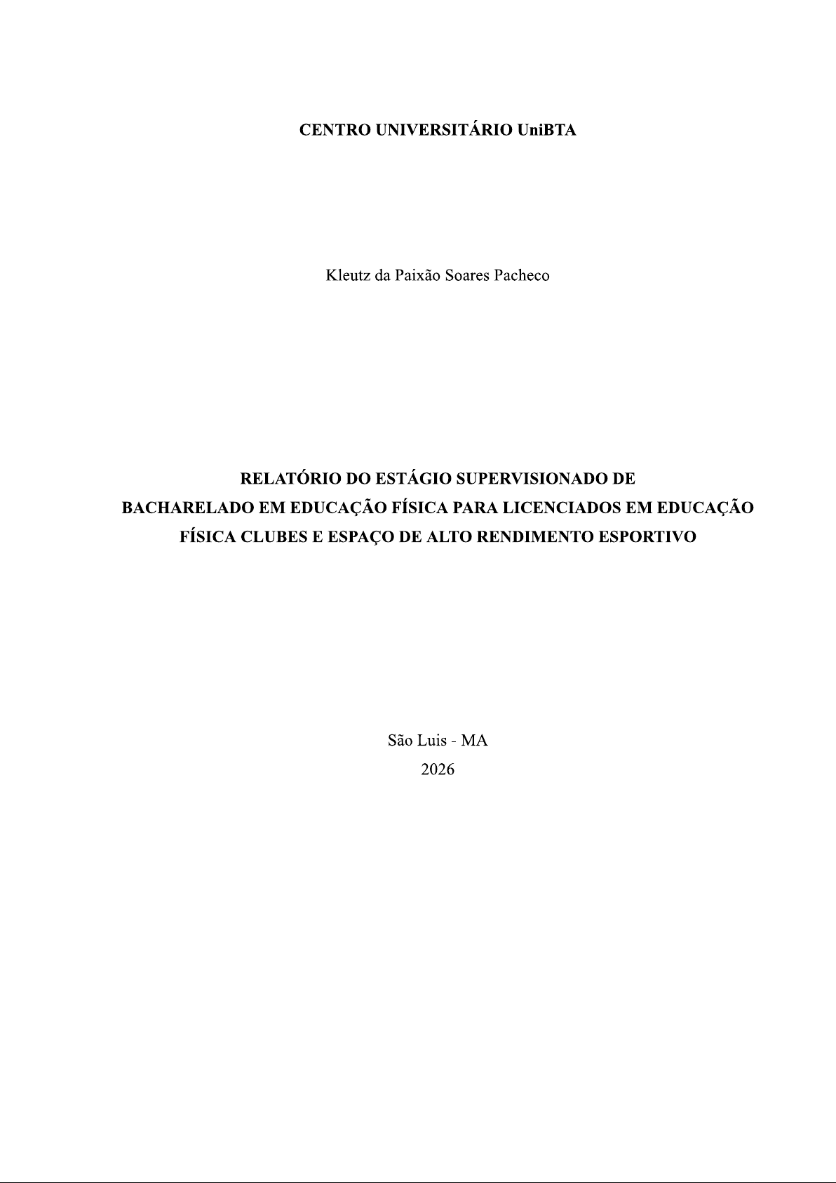 CENTRO UNIVERSITÁRIO UniBTA Kleutz da Paixão Soares Pacheco RELATÓRIO DO ESTÁGIO SUPERVISIONADO DE BACHARELADO EM EDUCAÇÃO FÍSICA PARA LICENCIADOS EM EDUCAÇÃO FÍSICA CLUBES E ESPAÇO DE ALTO RENDIMENTO ESPORTIVO São Luis - - MA 2026Kleutz da Paixão Soares Pacheco RELATÓRIO DO ESTÁGIO SUPERVISIONADO DE BACHARELADO EM EDUCAÇÃO FÍSICA PARA LICENCIADOS EM EDUCAÇÃO FÍSICA, CLUBES E ESPAÇOS DE ALTORENDIMENTO ESPORTIVO. Relatório de Estágio Supervisionado em Atividades em Clubes e espaços de alto rendimento espportivo, apresentado ao Curso de Bacharelado em Educação Física para Licenciados em Educação Física no Centro Universitário UniBTA. São Luis -MA 2026SUMÁRIO 1. INTRODUÇÃO 4 2. DESENVOLVIMENTO 5 2.1 Aparelhagem 6 2.2 Administração 6 2.3 Os Professores e Alunos 7 3. ATIVIDADES DESENVOLVIDAS 8 4. CONCLUSÃO 9 5. REFERÊNCIAS 10 6. ANEXOS 11 7. ANEXO 1 CARTA DE SOLICITAÇÃO DE ESTÁGIO 12 8. ANEXO 2 TERMO DE COMPROMISSO DE ESTÁGIO OBRIGATÓRIO 13 9. ANEXO 3 CARTA DE AUTORIZAÇÃO PARA A REALIZAÇÃO DO ESTÁGIO 18 10. ANEXO 4 FICHA DE ACOMPANHAMENTO 191. INTRODUÇÃO O presente relatório de estágio foi elaborado de acordo com a referida modalidade de estágio em Clubes e espaço de Alto Rendimento Esportivo realizado pela aluna do curso de Bacharelado em Educação Física para Licenciados em Educação Física, Kleutz da Paixão Soares Pacheco. O estágio supervisionado é uma etapa fundamental na formação acadêmica, pois possibilita ao estudante vivenciar na prática os conhecimentos adquiridos durante o curso. No contexto da Educação Física, essa experiência permite compreender melhor a atuação profissional em diferentes ambientes, como clubes e espaços voltados ao alto rendimento esportivo. O estágio teve início em 04/09/2025 e término em 12/10/2025, totalizando 180 horas. Durante o período de estágio, foi possível observar e acompanhar a rotina de treinamentos, a organização das atividades esportivas e o trabalho desenvolvido pelos profissionais responsáveis pela preparação física e pelo desempenho dos atletas. Além disso, a experiência proporcionou a compreensão da importância do planejamento, da disciplina e do acompanhamento técnico para o desenvolvimento do desempenho esportivo. Dessa forma, o estágio realizado em clubes e espaços de alto rendimento esportivo contribuiu significativamente para ampliar os conhecimentos práticos, fortalecer a formação profissional e compreender melhor a atuação do profissional de Educação Física no contexto esportivo. 2. DESENVOLVIMENTO O Data de início do estágio 04 de agosto a 12 de outubro de 2025, com carga horaria total de 180 horas, supervisora de estágio Swanny Mafra, profissional regulamentada no CREF sob o número 2378. O SPARTAN JUDO FUNCIONAL E TREINAMNETO foi fundada 11/11/2020, por Sergio Raimundo Bruno Dualibi Junior que é o profissional faixa preta 3° dan em judô me proporcionou a vivência prática da atuação profissional na área da Educação Física em clubes e espaços de alto rendimento esportivo, onde observei a rotina de 4treinamento dos atletas, acompanhei o trabalho dos profissionais de Educação Física, ajudei a planejar e organizar os treinos e desenvolvi habilidades profissionais e éticas na área esportiva de auto rendimento. 2.1 Aparelhagem No judô de alto rendimento, alguns materiais e equipamentos são essenciais para garantir a segurança dos atletas e o bom desenvolvimento dos treinos e competições. No judô de alto rendimento são utilizados diversos materiais e equipamentos específicos que auxiliam na prática e no desenvolvimento das técnicas da modalidade. Entre os principais estão o tatame, que é utilizado para amortecer quedas e garantir maior segurança aos atletas durante os treinos e competições, e o jugodi (uniforme do judô), composto por casaco, calça e faixa, que permite a execução adequada das técnicas de pegada e projeção. Também podem ser utilizados faixas de diferentes cores, que indicam o nível técnico do praticante. Além disso, em alguns treinamentos são utilizados cronômetros, cones, cordas e materiais de preparação física, que auxiliam no desenvolvimento da resistência, força, agilidade e coordenação motora dos atletas. Esses materiais são fundamentais para a organização dos treinos e para o aprimoramento do desempenho no judô de alto rendimento. 2.2 Administração A administração do SPARTAN JUDO FUNCIONAL E TREINAMNETO que tem como administrador o proprietario Sergio Raimundo Bruno Dualibi Junior Durante o período de estágio foi possível observar e compreender a importância da parte administrativa para o bom funcionamento do estabelecimento, organização e manutenção dos materiais 2.3 Os professores e os alunos 5proprietário com parceria com a professora do Centro de treinamento e formada em educação fisica e credenciada pelo CREF com registro ativo. Durante o período de estágio no centro de treinamento de judô, foi possível perceber a importância da orientação do professor no desenvolvimento técnico e disciplinar dos alunos. Segundo o professor responsável, o estágio é uma oportunidade importante para que o estagiário conheça na prática a rotina de treinamentos, o planejamento das atividades e o acompanhamento do desenvolvimento dos atletas, principalmente em um ambiente voltado ao alto rendimento esportivo. Para o aluno estagiário, a experiência no centro de treinamento de judô foi muito enriquecedora, pois permitiu observar de perto a aplicação das técnicas, a organização dos treinos e a importância da disciplina, do respeito e da dedicação dentro do esporte. Além disso, o estágio contribuiu para ampliar os conhecimentos práticos e compreender melhor o papel do profissional de Educação Física no processo de formação e desenvolvimento dos atletas. 3. ATIVIDADES Durante o período de estágio supervisionado no centro de treinamento 