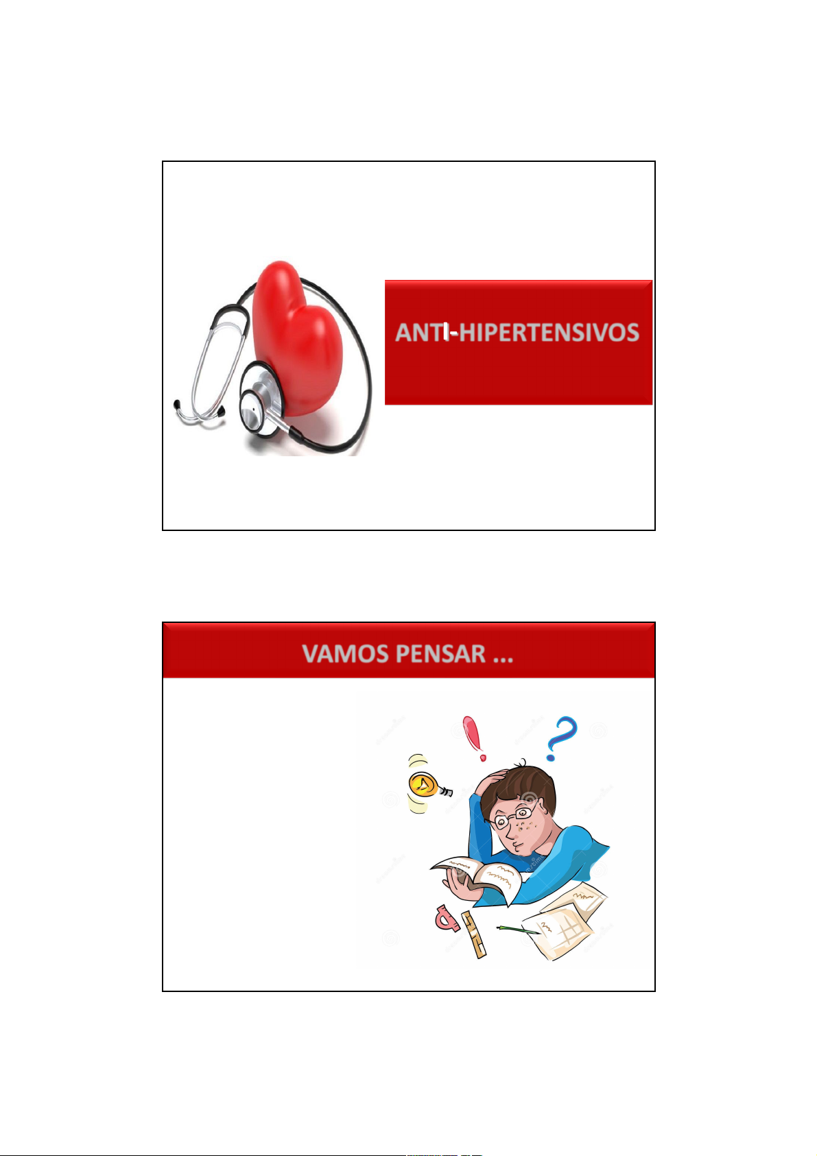 18/03/2025 1 ANTI-HIPERTENSIVOS 2017 Profª. Harriet Bárbara Maruxo. Profº. Adriano Chaves 1 Paciente Colapso Cardíaco da Silva, 65 anos, encontra-se internado na unidade de internação em que você é Enfermeiro. Este paciente encontra-se em uso de Atenolol, Hidralazina, Furosemida, Espironolactona e Doxazosin. O paciente é hipertenso severo e refere ser alérgico a captopril. Mediante essas informações, quais cuidados de enfermagem você estabeleceria a este paciente? VAMOS PENSAR ... 2 18/03/2025 2 VAMOS PENSAR ... Se você falou... • Verificar PA antes de administrar está correto, assim como... • Mensurar débito urinário; • Avaliar presença de edema; • Verificar eletrólitos Está correto Mas… Farmacologia é tão fácil.... 3 Você já parou para se perguntar por que o Sr. Colapso Cardíaco necessita de tantos anti- hipertensivos? E por que associar dois diuréticos? (Furosemida e Espironolactona) E se eu disser que, apenas vendo o nome dos fármacos utilizados, posso afirmar que este paciente possui hiperplasia prostática, você acreditaria? VAMOS PENSAR ... Muita calma!!!! Que nesta aula nós resolveremos todas essas perguntas!!!! 4 18/03/2025 3 HIPERTENSÃO ARTERIAL PA = DC x RVP Quanto maior o DC e a RVP, MAIOR será a PA PA RVPDC •Vasoconstrição: maior pressão devido ao aumento da RVP; •Vasodilatação: menor pressão devido a diminuição da RVP. RESISTÊNCIA VASCULAR PERIFÉRICA (RVP): Resistência que o sangue enfrenta ao passar no interior das artérias • Descarga do sistema nervoso simpático – vasoconstrição • Renal – ativação anormal do Sistema Renina Angiotensina-Aldosterona 5 ANTI-HIPERTENSIVOS Regulam a pressão arterial através de uma redução no débito cardíaco e/ou RVP Agentes Simpatolíticos Diminuem a pressão arterial por meio da redução da resistência vascular periférica, inibição da função cardíaca • Agonistas alfa 2 adrenérgicos • Betabloqueadores • Bloqueadores alfa 1 adrenérgicos TIPOS DE AÇÃO DOS ANTI-HIPERTENSIVOS 6 18/03/2025 4 Ao bloquearem a ação ou produção de angiotensina II, não haverá vasoconstrição, e com isso teremos vasodilatação e diminuição da pressão arterial Agentes que bloqueiam a produção ou ação da angiotensina ANTI-HIPERTENSIVOS Vasodilatadores de ação direta Diminuem a pressão arterial ao relaxarem o músculo liso vascular, dilatando os vasos TIPOS DE AÇÃO DOS ANTI-HIPERTENSIVOS Diuréticos Reduzem a pressão arterial por meio da eliminação do sódio corporal, diminuição do volume sanguíneo 7 ANTI-HIPERTENSIVOS AGONISTAS ALFA-2 ADRENÉRGICOS Lembrete: Receptores Alfa 2, inibem a liberação de noradrenalina e acetilcolina, levando a vasodilatação • Diminuem a liberação de noradrenalina; • Consequentemente não haverá vasoconstrição e a pressão arterial não se elevará; • Haverá diminuição do débito cardíaco e resistência vascular periférica; Ex: Clonidina e Metildopa 8 18/03/2025 5 ANTI-HIPERTENSIVOS AGONISTAS ALFA-2 ADRENÉRGICOS Metildopa CUIDADOS/OBSERVAÇÕES • Verificar PA antes de sua administração; • Não administrar se hipotensão (PADE AÇÃO DIRETA • Devido a essa vasodilatação direta no vaso sanguíneo, e a redução da PA, o rim passa a reter água e sódio, levando a formação de Edema, Taquicardia e Diminuição do Volume Urinário • Este grupo de fármaco não deve ser utilizado sozinho devido ao estímulo a retenção hídrica no sistema renal • Em geral são associados a diuréticos e ou betabloqueadores 21 ANTI-HIPERTENSIVOS Minoxidil CUIDADOS/OBSERVAÇÕES Verificar presença de arritmias (taquicardia); Verificar PA Não administrar se PA