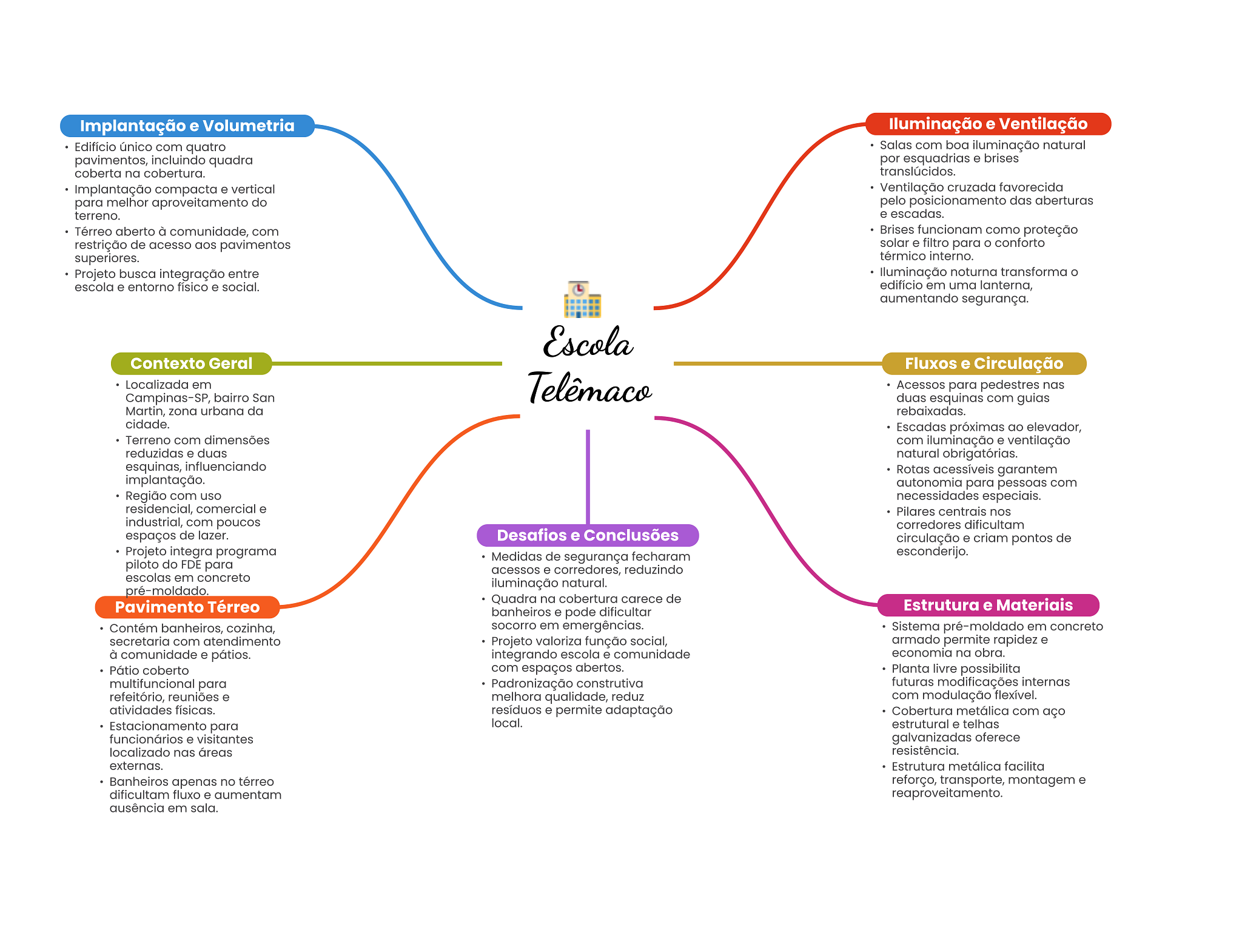 Implantação e Volumetria Iluminação e Ventilação Edifício único com quatro Salas com boa iluminação natural pavimentos, incluindo quadra por esquadrias e brises coberta na cobertura. translúcidos. Implantação compacta e vertical Ventilação cruzada favorecida para melhor aproveitamento do pelo posicionamento das aberturas terreno. e escadas. Térreo aberto à comunidade, com Brises funcionam como proteção restrição de acesso aos pavimentos solar e filtro para conforto superiores. térmico interno. Projeto busca integração entre noturna transforma escola e entorno físico e social. edifício em uma lanterna, aumentando segurança. Escola Contexto Geral Fluxos e Circulação Localizada em Campinas-SP, bairro San Telêmaco Acessos para pedestres nas duas esquinas com guias Martin, zona urbana da rebaixadas. cidade. Escadas próximas ao elevador, Terreno com dimensões com iluminação e ventilação reduzidas e duas natural obrigatórias. esquinas, influenciando Rotas acessíveis garantem implantação. autonomia para pessoas com Região com uso necessidades especiais. residencial, comercial e Pilares centrais nos industrial, com poucos corredores dificultam espaços de lazer. Desafios e Conclusões circulação e criam pontos de Projeto integra programa Medidas de segurança fecharam esconderijo. piloto do FDE para acessos e corredores, reduzindo escolas em concreto iluminação natural. pré-moldado. Quadra na cobertura carece de Pavimento Térreo Estrutura e Materiais banheiros e pode dificultar Contém banheiros, cozinha, socorro em emergências. Sistema pré-moldado em concreto secretaria com atendimento Projeto valoriza função social, armado permite rapidez e à comunidade e pátios. integrando escola e comunidade economia na obra. Pátio coberto com espaços abertos. Planta livre possibilita multifuncional para Padronização construtiva futuras modificações internas refeitório, reuniões e melhora qualidade, reduz com modulação flexível. atividades físicas. resíduos e permite adaptação Cobertura metálica com aço Estacionamento para local. estrutural e telhas funcionários e visitantes galvanizadas oferece localizado nas áreas resistência. externas. Estrutura metálica facilita Banheiros apenas no térreo reforço, transporte, montagem e dificultam fluxo e aumentam reaproveitamento. ausência em sala.