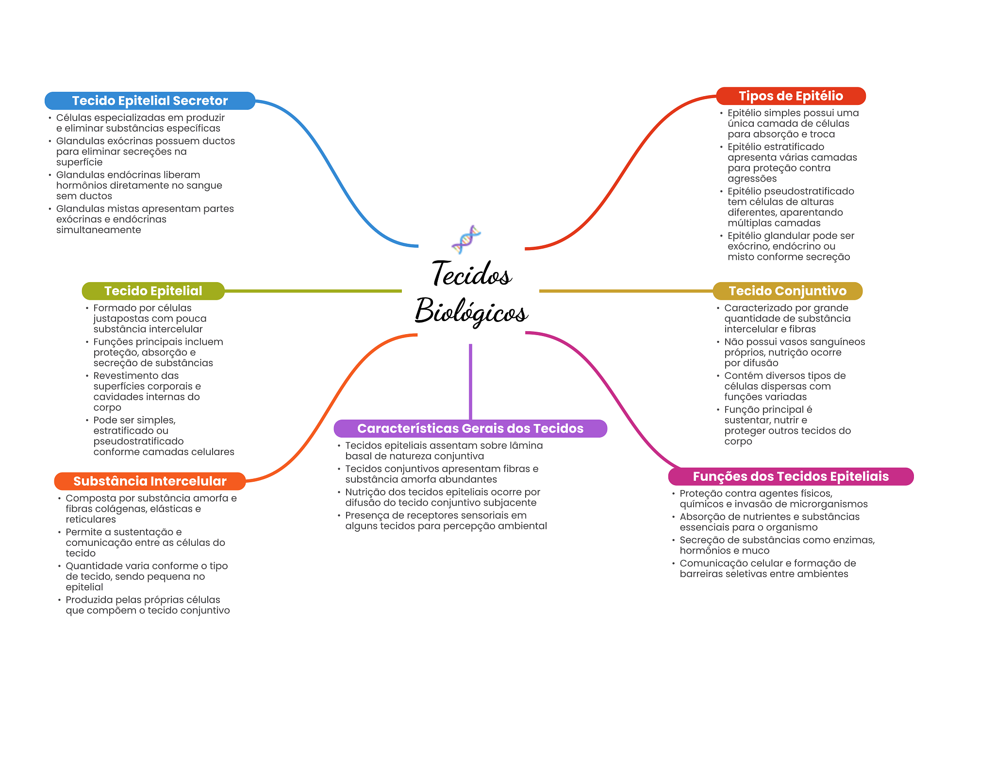 Tecido Epitelial Secretor Tipos de Epitélio Células especializadas em produzir Epitélio simples possui uma única camada de células e eliminar substâncias específicas para absorção e troca Glandulas exócrinas possuem ductos para eliminar secreções na Epitélio estratificado superfície apresenta várias camadas para proteção contra Glandulas endócrinas liberam agressões hormônios diretamente no sangue sem ductos Epitélio pseudostratificado tem células de alturas Glandulas mistas apresentam partes diferentes, aparentando exócrinas e endócrinas múltiplas camadas simultaneamente Epitélio glandular pode ser exócrino, endócrino ou misto conforme secreção Tecidos Tecido Epitelial Tecido Conjuntivo Formado por células Biológicos Caracterizado por grande justapostas com pouca quantidade de substância substância intercelular intercelular e fibras Funções principais incluem Não possui vasos sanguíneos proteção, absorção e próprios, nutrição ocorre secreção de substâncias por difusão Revestimento das Contém diversos tipos de superfícies corporais e células dispersas com cavidades internas do funções variadas corpo Função principal é Pode ser simples, sustentar, nutrir e estratificado ou Características Gerais dos Tecidos proteger outros tecidos do pseudostratificado Tecidos epiteliais assentam sobre lâmina corpo conforme camadas celulares basal de natureza conjuntiva Tecidos conjuntivos apresentam fibras e Substância Intercelular substância amorfa abundantes Funções dos Tecidos Epiteliais Nutrição dos tecidos epiteliais ocorre por Composta por substância amorfa e Proteção contra agentes físicos, difusão do tecido conjuntivo subjacente fibras colágenas, elásticas e químicos e invasão de microrganismos reticulares Presença de receptores sensoriais em Absorção de nutrientes e substâncias alguns tecidos para percepção ambiental Permite a sustentação e essenciais para O organismo comunicação entre as células do Secreção de substâncias como enzimas, tecido hormônios e muco Quantidade varia conforme tipo Comunicação celular e formação de de tecido, sendo pequena no barreiras seletivas entre ambientes epitelial Produzida pelas próprias células que compõem tecido conjuntivo