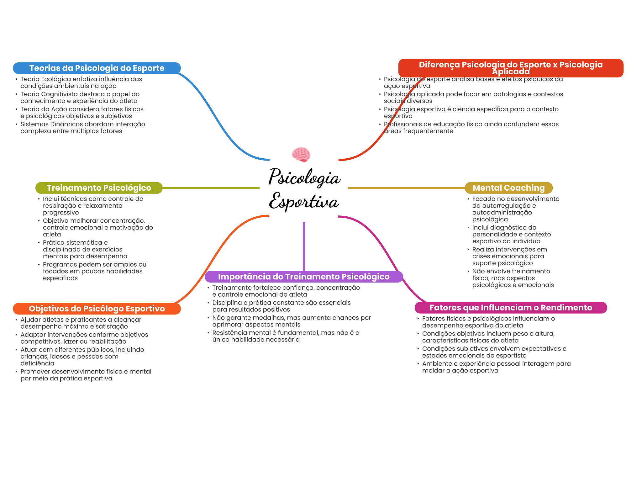 Teorias da Psicologia do Esporte Diferença Psicologia do Esporte Psicologia Aplicada Teoria Ecológica enfatiza influência das Psicologia do esporte analisa bases e efeitos psiquicos da condições ambientais na ação ação esportiva Teoria Cognitivista destaca papel do Psicologia aplicada pode focar em patologias e contextos conhecimento e experiência do atleta sociais diversos Teoria da Ação considera fatores físicos Psicologia esportiva é ciência específica para contexto e psicológicos objetivos e subjetivos esportivo Sistemas Dinâmicos abordam interação Profissionais de educação física ainda confundem essas complexa entre múltiplos fatores areas frequentemente Psicologia Treinamento Psicológico Mental Coaching Inclui técnicas como controle da respiração e relaxamento Esportiva Focado no desenvolvimento da autorregulação e progressivo autoadministração Objetiva melhorar concentração, psicológica controle emocional e motivação do Inclui diagnóstico da atleta personalidade e contexto Prática sistemática e esportivo do indivíduo disciplinada de exercícios Realiza intervenções em mentais para desempenho crises emocionais para Programas podem ser amplos ou suporte psicológico focados em poucas habilidades Não envolve treinamento específicas Importância do Treinamento Psicológico físico, mas aspectos Treinamento fortalece confiança, concentração psicológicos e emocionais e controle emocional do atleta Disciplina e prática constante são essenciais Objetivos do Psicólogo Esportivo para resultados positivos Fatores que Influenciam Rendimento Ajudar atletas e praticantes a alcançar Não garante medalhas, mas aumenta chances por Fatores físicos e psicológicos influenciam desempenho máximo e satisfação aprimorar aspectos mentais desempenho esportivo do atleta Adaptar intervenções conforme objetivos Resistência mental é fundamental, mas não é a Condições objetivas incluem peso e altura, competitivos, lazer ou reabilitação única habilidade necessária características físicas do atleta Atuar com diferentes públicos, incluindo Condições subjetivas envolvem expectativas e crianças, idosos e pessoas com estados emocionais do esportista deficiência Ambiente e experiência pessoal interagem para Promover desenvolvimento físico e mental moldar a ação esportiva por meio da prática esportiva