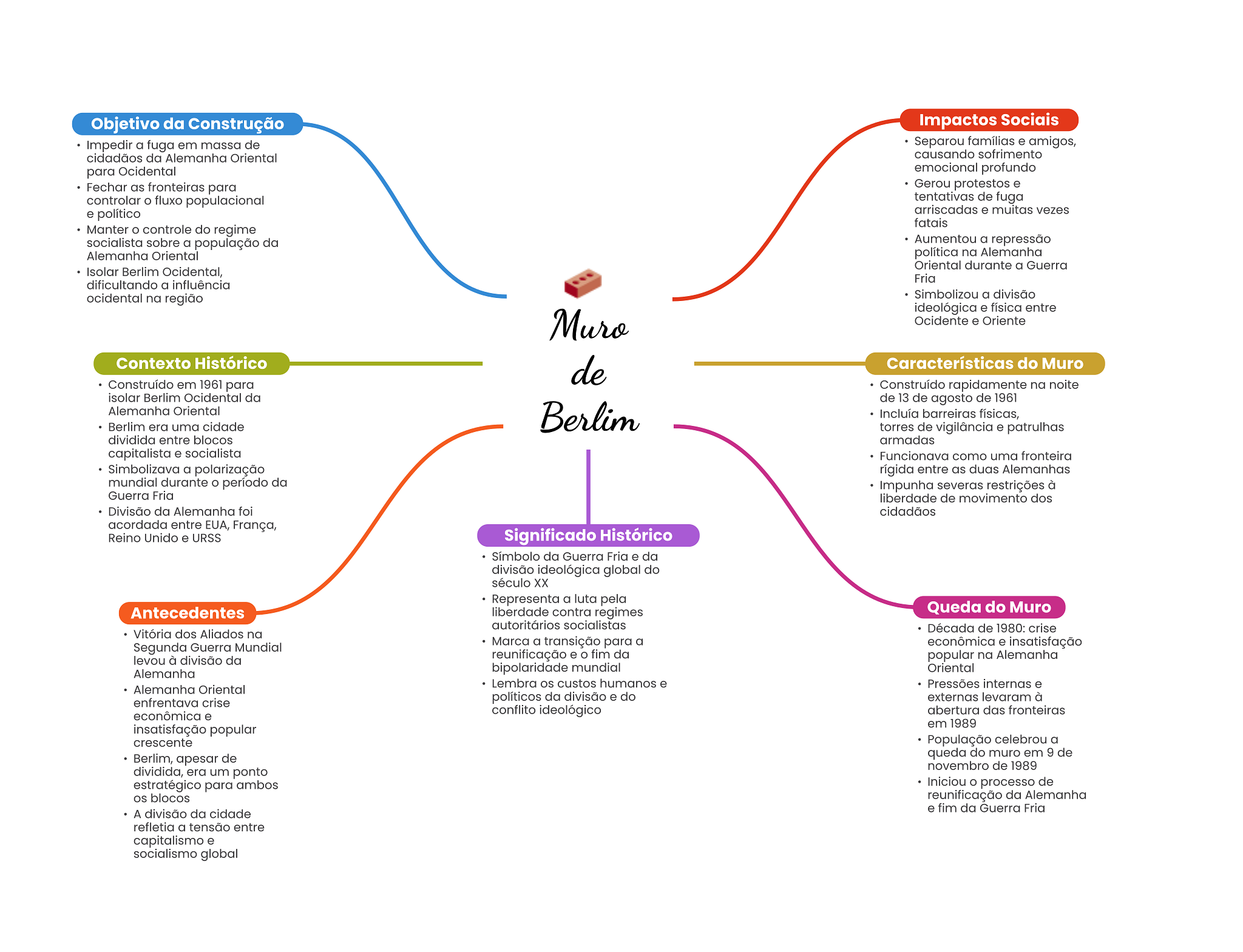 Objetivo da Construção Impactos Sociais Impedir a fuga em massa de Separou famílias e amigos, cidadãos da Alemanha Oriental causando sofrimento para Ocidental emocional profundo Fechar as fronteiras para Gerou protestos e controlar fluxo populacional tentativas de fuga e político arriscadas e muitas vezes fatais Manter controle do regime socialista sobre a população da Aumentou a repressão Alemanha Oriental política na Alemanha Oriental durante a Guerra Isolar Berlim Ocidental, Fria dificultando a influência ocidental na região Simbolizou a divisão ideológica e física entre Muro Ocidente e Oriente Contexto Histórico de Características do Muro Construído em 1961 para Construído rapidamente na noite isolar Berlim Ocidental da de 13 de agosto de 1961 Alemanha Oriental Berlim era uma cidade Berlim Incluía barreiras físicas, torres de vigilância e patrulhas dividida entre blocos armadas capitalista e socialista Funcionava como uma fronteira Simbolizava a polarização rígida entre as duas Alemanhas mundial durante período da Impunha severas restrições à Guerra Fria liberdade de movimento dos Divisão da Alemanha foi cidadãos acordada entre EUA, França, Reino Unido e URSS Significado Histórico Símbolo da Guerra Fria e da divisão ideológica global do século Representa a luta pela Antecedentes liberdade contra regimes Queda do Muro autoritários socialistas Década de 1980: crise Vitória dos Aliados na Segunda Guerra Mundial Marca a transição para a econômica e insatisfação levou à divisão da reunificação e fim da popular na Alemanha bipolaridade mundial Oriental Alemanha Lembra custos humanos e Pressões internas e Alemanha Oriental políticos da divisão e do externas levaram à enfrentava crise econômica e conflito ideológico abertura das fronteiras em 1989 insatisfação popular crescente População celebrou a Berlim, apesar de queda do muro em 9 de novembro de 1989 dividida, era um ponto estratégico para ambos Iniciou processo de os blocos reunificação da Alemanha A divisão da cidade e fim da Guerra Fria refletia a tensão entre capitalismo e socialismo global