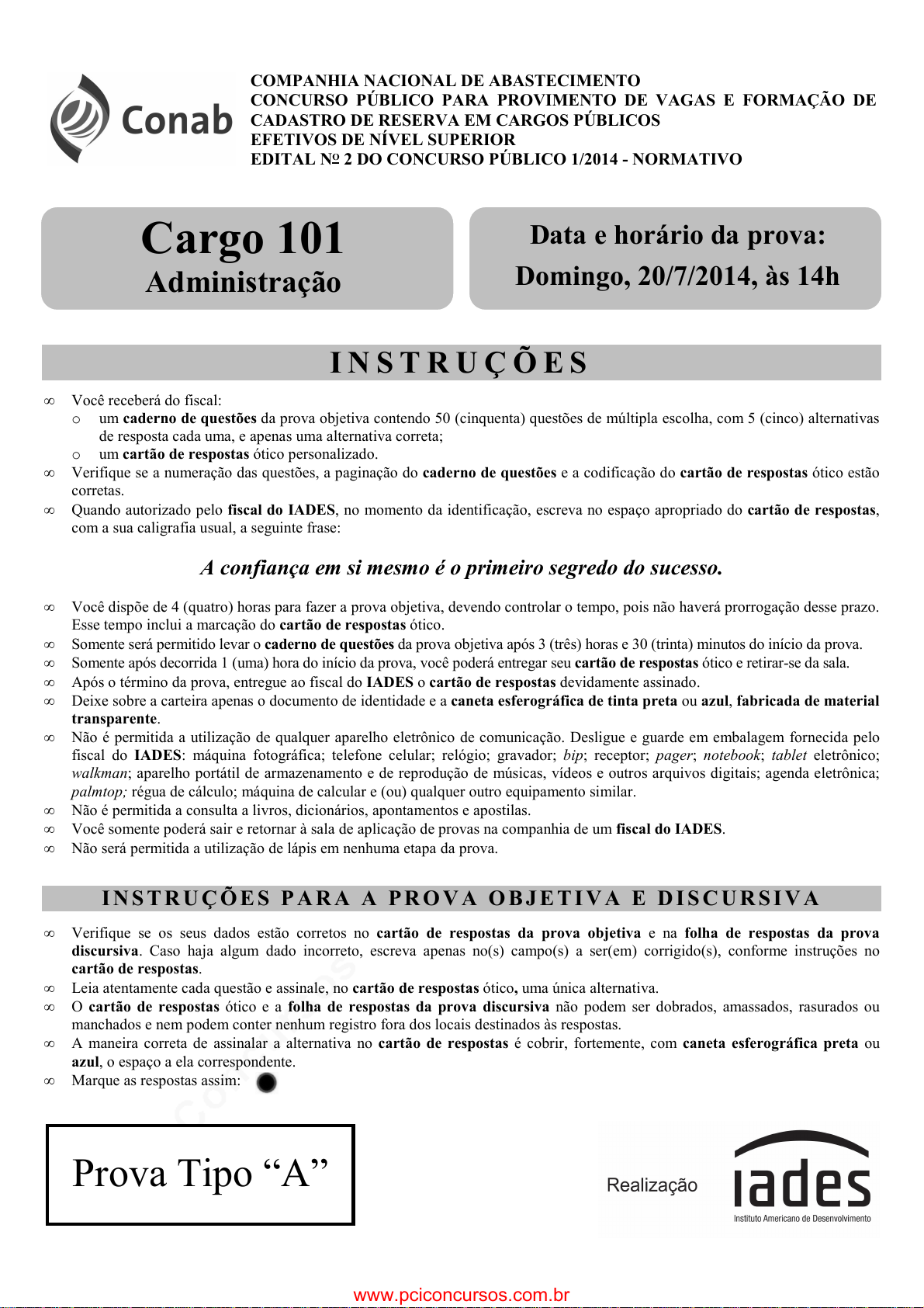 pcimarkpci MjgwNDowMTRkOmM4ODI6OTAzMDo3OTZlOmYwZDc6OWMwYjo1YjY0:V2VkLCAyNSBNYXIgMjAyNiAxMzozNDoyNiAtMDMwMA== www.pciconcursos.com.br COMPANHIA NACIONAL DE ABASTECIMENTO CONCURSO PÚBLICO PARA PROVIMENTO DE VAGAS E FORMAÇÃ O DE CADASTRO DE RESERVA EM CARGOS PÚBLICOS EFETIVOS DE NÍVEL SUPERIOR EDITAL N O 2 DO CONCURSO PÚBLICO 1/2014 - NORMATIVO Cargo 101 Administração Data e horário da prova: Domingo, 20/7/2014, às 14h I N S T R U Ç Õ E S • Você receberá do fiscal: o um caderno de questões da prova objetiva contendo 50 (cinquenta) questões de múltipla escolha, com 5 (cinco) alternativas de resposta cada uma, e apenas uma alternativa correta; o um cartão de respostas ótico personalizado. • Verifique se a numeração das questões, a paginação do caderno de questões e a codificação do cartão de respostas ótico estão corretas. • Quando autorizado pelo fiscal do IADES, no momento da identificação, escreva no espaço apropriado do cartão de respostas, com a sua caligrafia usual, a seguinte frase: A confiança em si mesmo é o primeiro segredo do sucesso. • Você dispõe de 4 (quatro) horas para fazer a prova objetiva, devendo controlar o tempo, pois não haverá prorrogação desse prazo. Esse tempo inclui a marcação do cartão de respostas ótico. • Somente será permitido levar o caderno de questões da prova objetiva após 3 (três) horas e 30 (trinta) minutos do início da prova. • Somente após decorrida 1 (uma) hora do início da prova, você poderá entregar seu cartão de respostas ótico e retirar-se da sala. • Após o término da prova, entregue ao fiscal do IADES o cartão de respostas devidamente assinado. • Deixe sobre a carteira apenas o documento de identidade e a caneta esferográfica de tinta preta ou azul, fabricada de material transparente. • Não é permitida a utilização de qualquer aparelho eletrônico de comunicação. Desligue e guarde em embalagem fornecida pelo fiscal do IADES: máquina fotográfica; telefone celular; relógio; gravador; bip; receptor; pager; notebook; tablet eletrônico; walkman; aparelho portátil de armazenamento e de reprodução de músicas, vídeos e outros arquivos digitais; agenda eletrônica; palmtop; régua de cálculo; máquina de calcular e (ou) qualquer outro equipamento similar. • Não é permitida a consulta a livros, dicionários, apontamentos e apostilas. • Você somente poderá sair e retornar à sala de aplicação de provas na companhia de um fiscal do IADES. • Não será permitida a utilização de lápis em nenhuma etapa da prova. I NSTRUÇÕES PARA A PROVA OBJETI VA E D I SCURSI VA • Verifique se os seus dados estão corretos no cartão de respostas da prova objetiva e na folha de respostas da prova discursiva. Caso haja algum dado incorreto, escreva apenas no(s) campo(s) a ser(em) corrigido(s), conforme instruções no cartão de respostas. • Leia atentamente cada questão e assinale, no cartão de respostas ótico, uma única alternativa. • O cartão de respostas ótico e a folha de respostas da prova discursiva não podem ser dobrados, amassados, rasurados ou manchados e nem podem conter nenhum registro fora dos locais destinados às respostas. • A maneira correta de assinalar a alternativa no cartão de respostas é cobrir, fortemente, com caneta esferográfica preta ou azul, o espaço a ela correspondente. • Marque as respostas assim: Prova Tipo “A” www.pciconcursos.com.br pcimarkpci MjgwNDowMTRkOmM4ODI6OTAzMDo3OTZlOmYwZDc6OWMwYjo1YjY0:V2VkLCAyNSBNYXIgMjAyNiAxMzozNDoyNiAtMDMwMA== www.pciconcursos.com.br CONCURSO PÚBLICO – CONAB 101 – Administração - Prova Tipo “A” PÁGINA 2/12 CONHECIMENTOS BÁSICOS Questões de 1 a 25 LÍNGUA PORTUGUESA Questões de 1 a 10 Texto 1 para responder as questões de 1 a 3. 1 4 7 10 13 14 O que são alimentos orgânicos Na agricultura orgânica, não é permitido o uso de substâncias que coloquem em risco a saúde humana e o meio ambiente. Não são utilizados fertilizantes sintéticos solúveis, agrotóxicos e transgênicos. O Brasil, em função de possuir diferentes tipos de solo e clima, uma biodiversidade incrível aliada a uma grande diversidade cultural, é sem dúvida um dos países com maior potencial para o crescimento da produção orgânica. Para ser considerado orgânico, o produto tem que ser produzido em um ambiente de produção orgânica, onde se utilizam como base do processo produtivo os princípios agroecológicos que contemplam o uso responsável do solo, da água, do ar e dos demais recursos naturais, respeitando as relações sociais e culturais. Disponível em: . Acesso em: 5/5/2014, com adaptações. QUESTÃO 1 _______________________ Considerando as informações veiculadas pelo texto e a relação entre elas, assinale a alternativa correta. (A) Agricultura orgânica é aquela que não permite a utilização de substâncias nocivas à saúde humana e ao meio ambiente. (B) Os fertilizantes sintéticos solúveis, os agrotóxicos e os transgênicos não se enquadram na categoria das substâncias que colocam em risco a saúde humana e o meio ambiente. (C) Os diferentes tipos de solo e clima e a biodiversidade aliada à grande diversidade cultural justificam a condição do Brasil como grande produtor de alimentos orgânicos. (D) O Brasil ainda não produz alimentos orgânicos. (E) O respeito às relações sociais e culturais é uma atitude que se opõe aos princípios agroecológicos. QUESTÃO 2 _______________________ De acordo com a norma-padrão, assinale a alternativa que apresenta outra redação possível para “Na agricultura orgânica, não é permitido o uso de substâncias que coloquem em risco a saúde humana e o meio ambiente.” (linhas de 1 a 3). (A) Não é permitido, na agricultura orgânica, a utilização de substâncias que coloquem em risco a saúde humana e o meio ambiente. (B) Na agricultura orgânica, não é permitido o uso de substâncias os quais coloquem em risco a