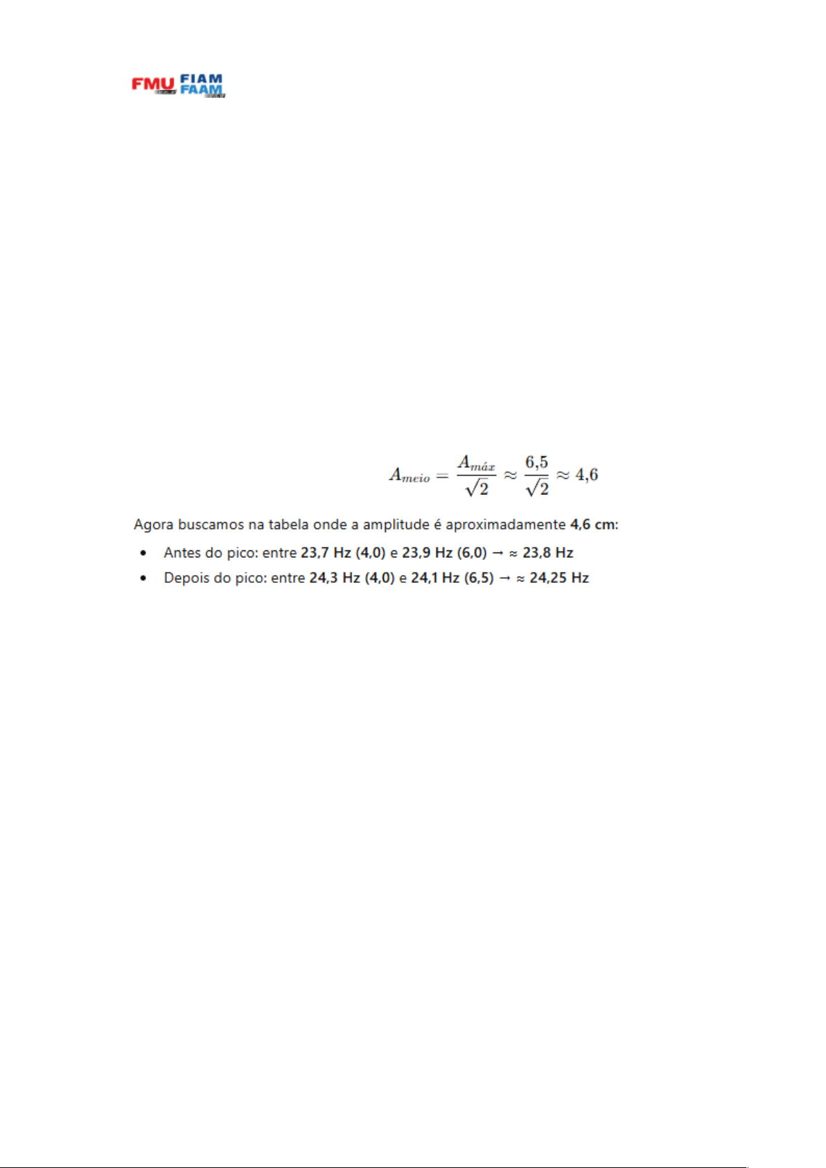 FMU Disciplina: FÍSICA - ONDAS, ELETRICIDADE E MAGNETISMO (261GGR1283A) 1. Pico de ressonância Pelos dados da tabela: · Amplitude máxima: A ≈ 6,5 cm · Frequência correspondente: f₀ ≈ 24,1 Hz 2. Método da semilargura (γ) Para encontrar o fator de qualidade, usamos a largura do pico na metade da potência. Importante: como a potência ∝ A², usamos: 3. Largura de banda Δf=f2−f1≈24,25−23,8=0,45 Hz 4. Fator de qualidade (Q) Usamos a relação: Q=f0/Δf = Substituindo: Q≈24,1/0,45≈53,6≈53,6 Resultado final Fator de qualidade do sistema: Q ≈ 54 5. Interpretação física Esse valor indica: 🔹 Q alto (~54) · Baixo amortecimento (γ pequeno) · Pouca perda de energia por atrito · Oscilação “limpa” e bem definida 🔹 Curva de ressonância · Pico estreito e alto · Sistema responde fortemente apenas perto de f₀ Conclusão: O sistema apresenta um fator de qualidade elevado, indicando baixo amortecimento. Isso significa que a energia dissipada por ciclo é pequena, permitindo oscilações mais persistentes. A curva de ressonância obtida é estreita, característica de sistemas pouco dissipativos, nos quais a resposta é altamente seletiva em torno da frequência natural. Esse comportamento é típico de sistemas mecânicos com baixo atrito. image1.png image2.png